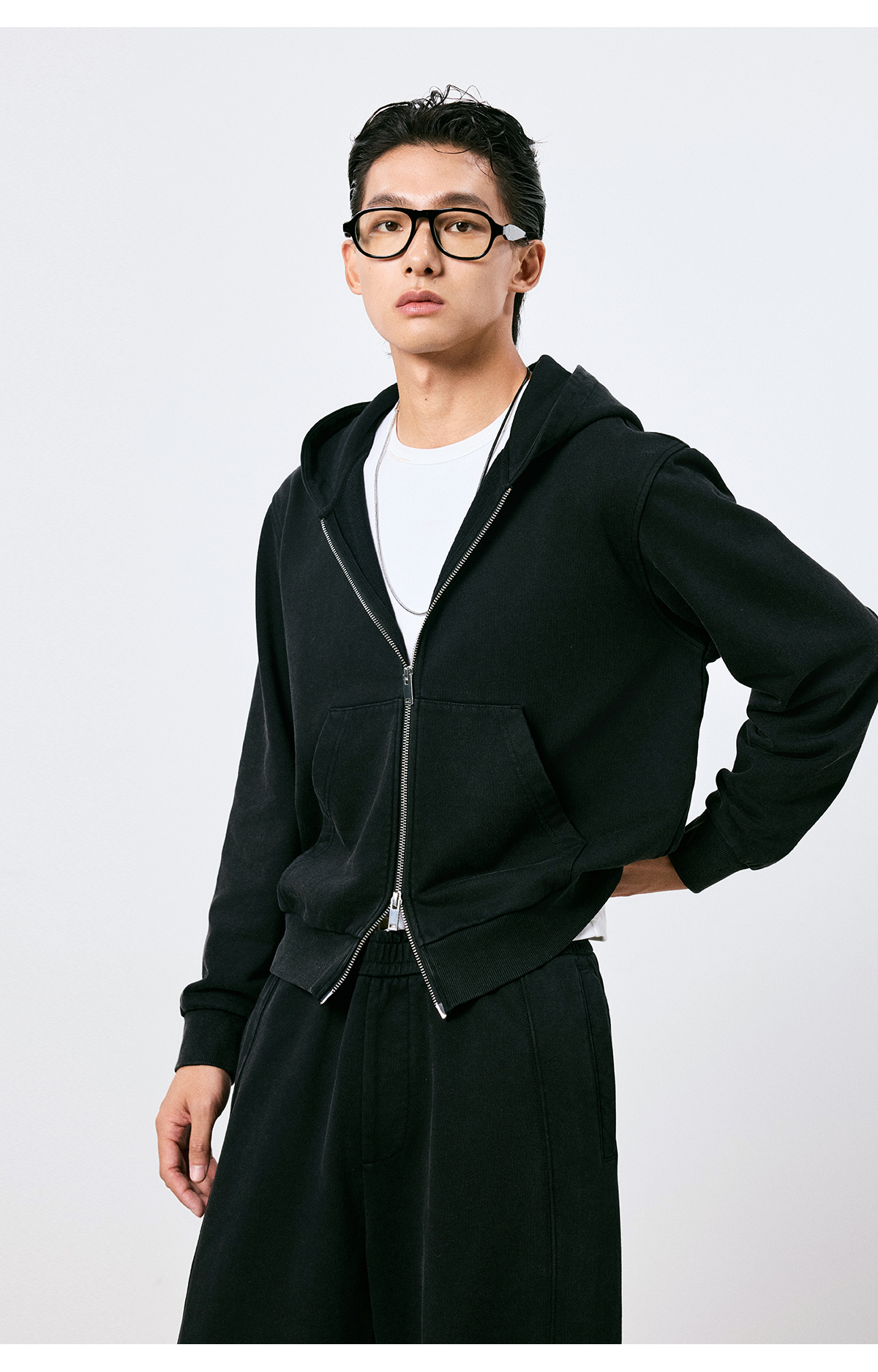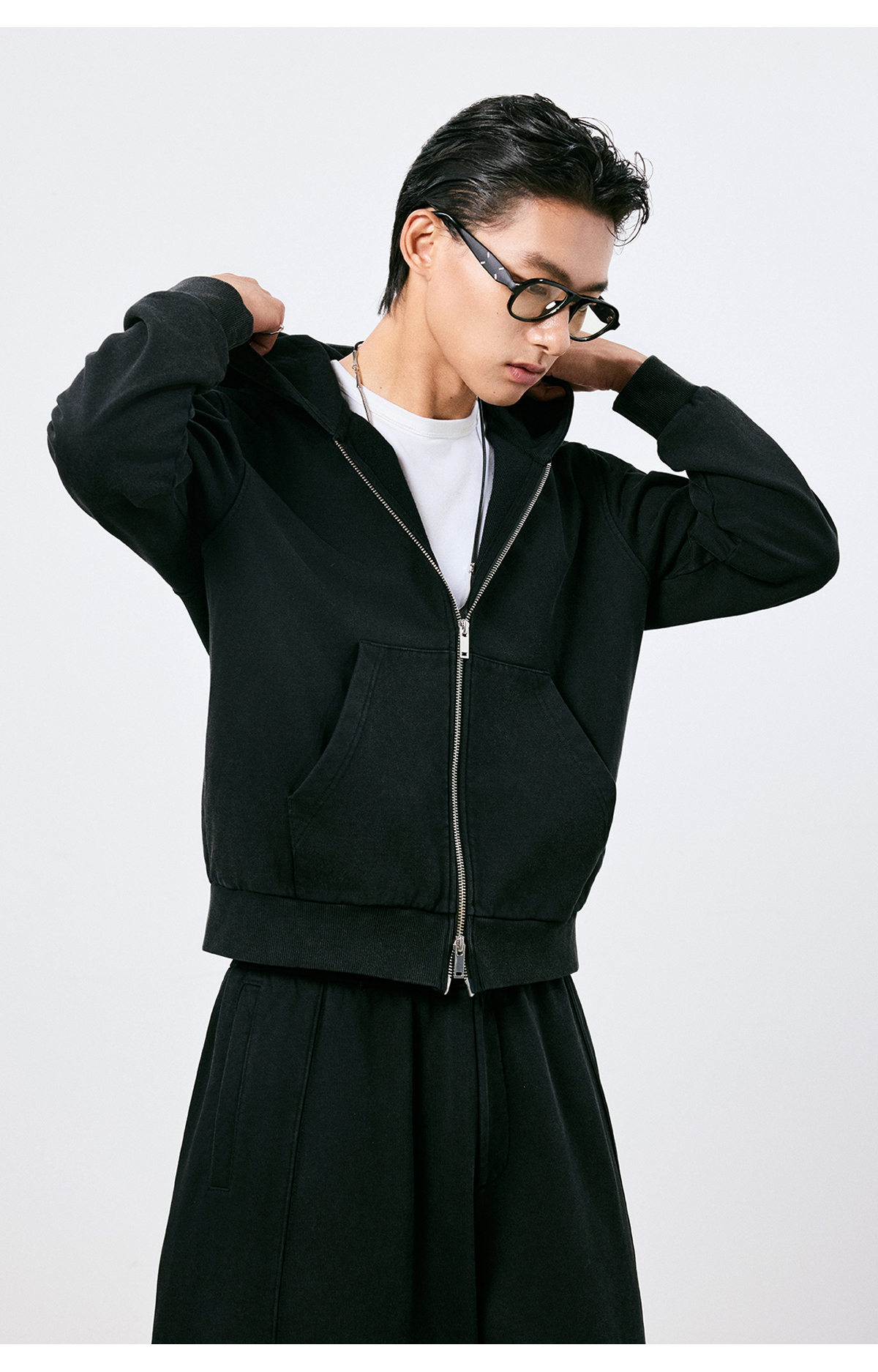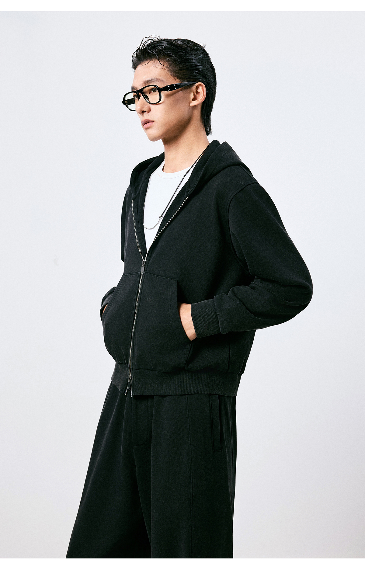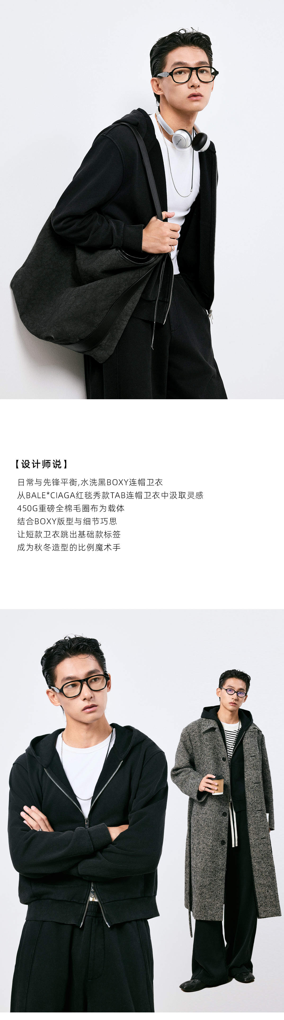 棉仓3671008001-450G重磅boxy短宽纯棉拉链连帽卫衣外套炒雪花水洗黑