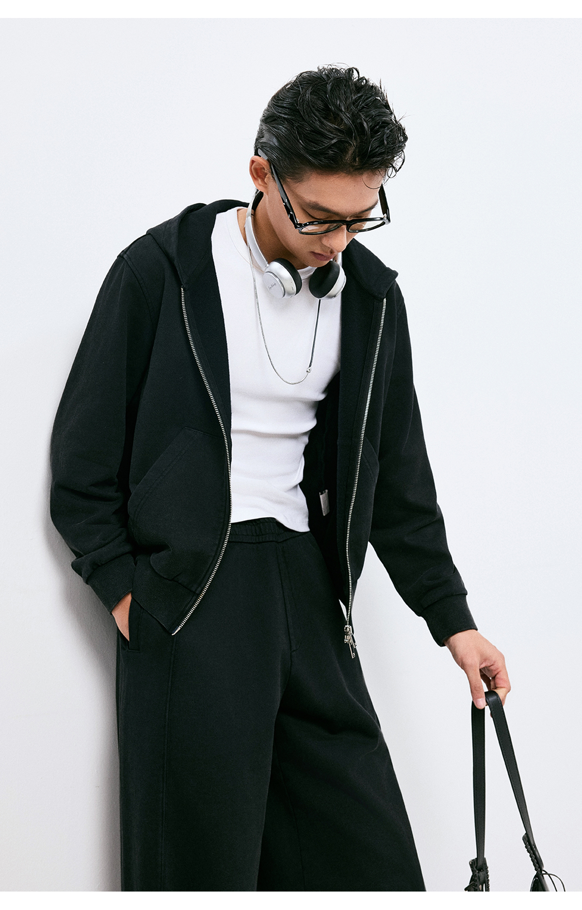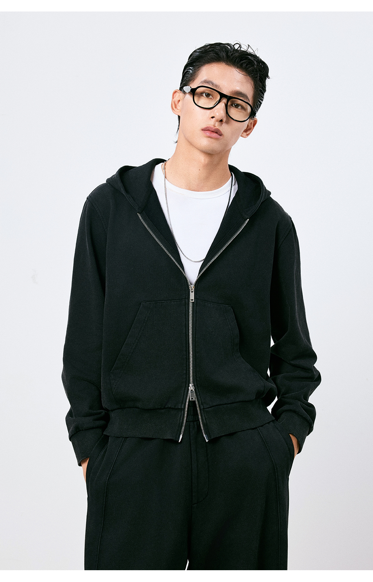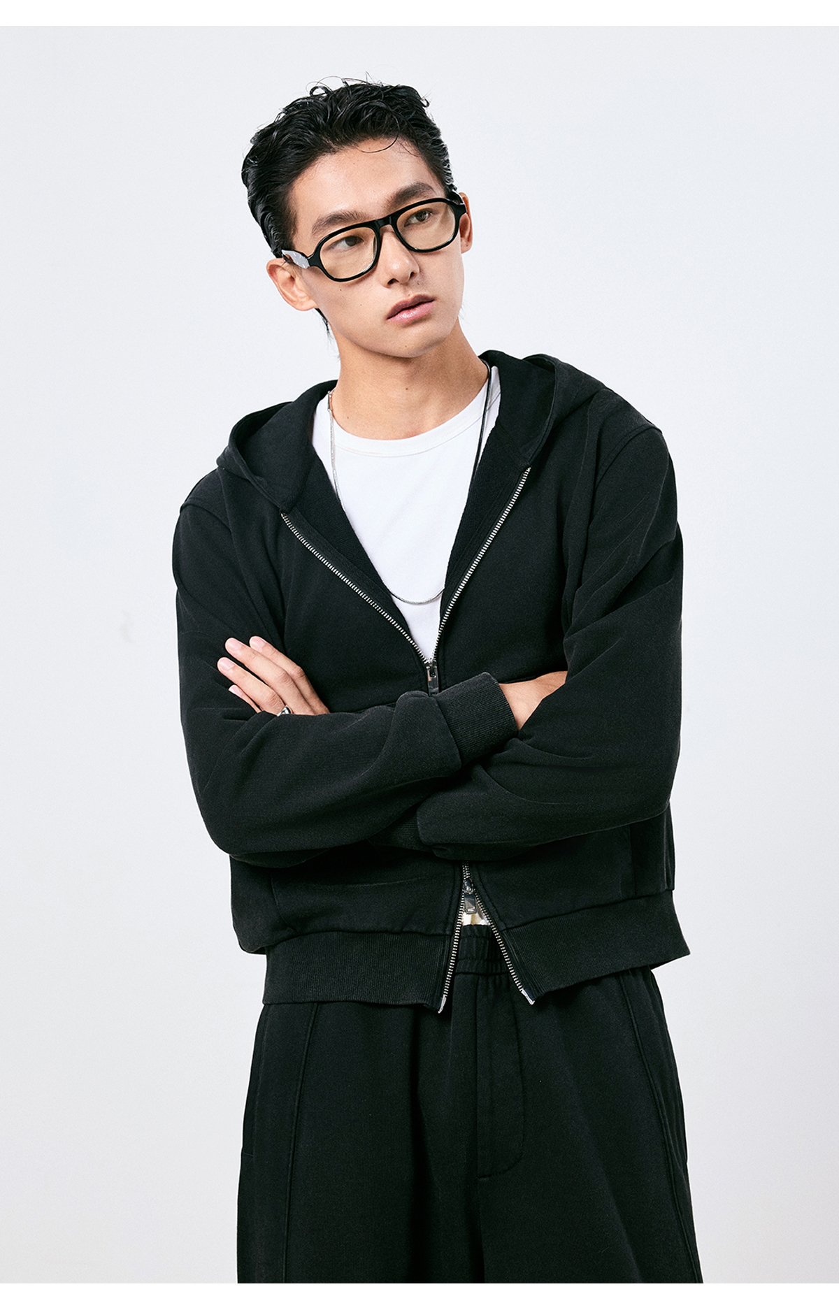 棉仓3671008001-450G重磅boxy短宽纯棉拉链连帽卫衣外套炒雪花水洗黑
