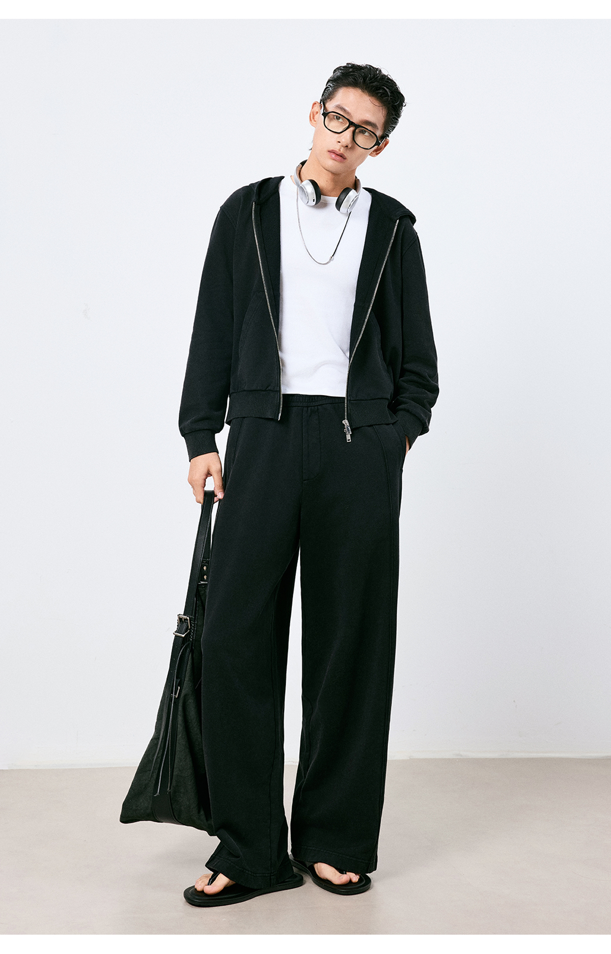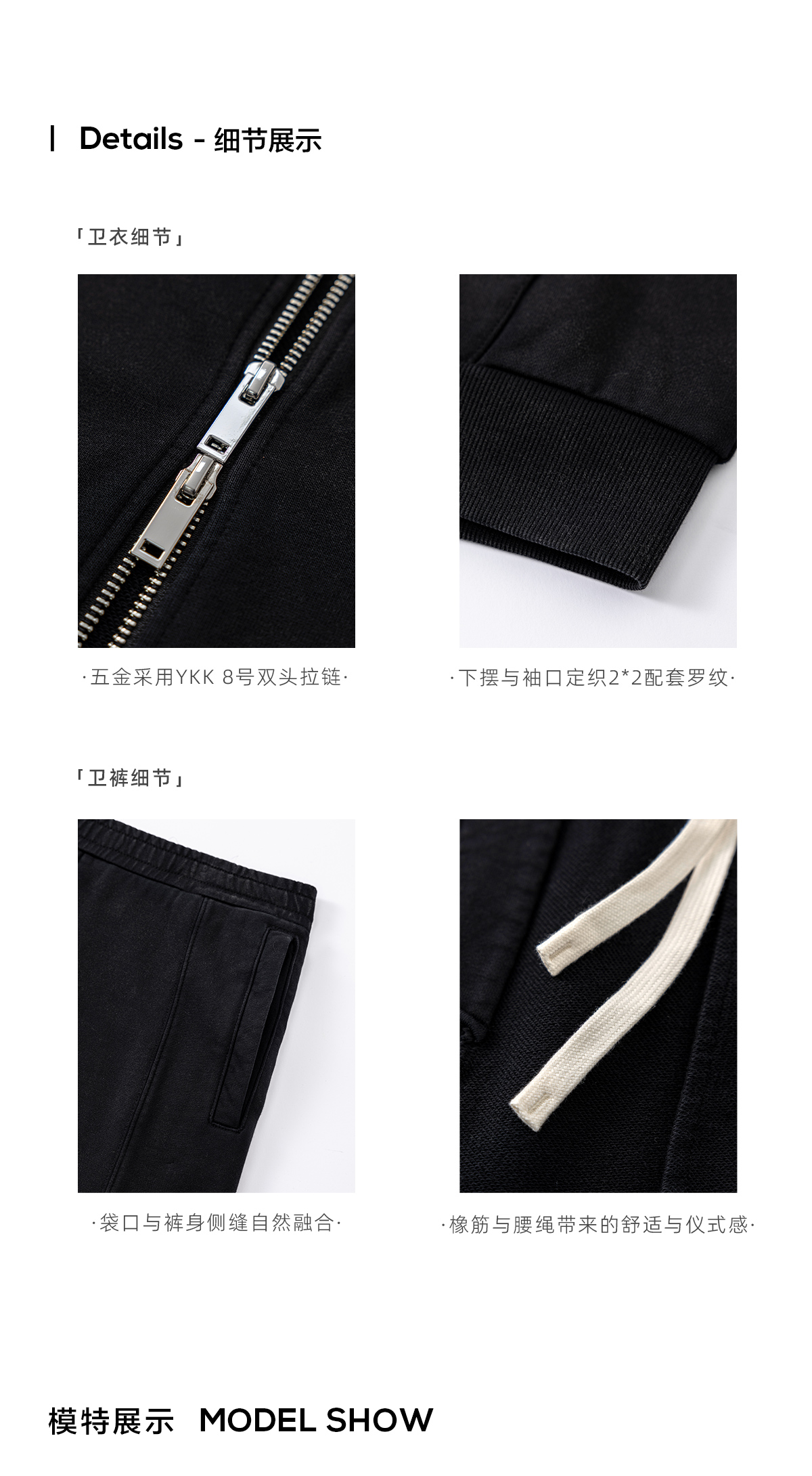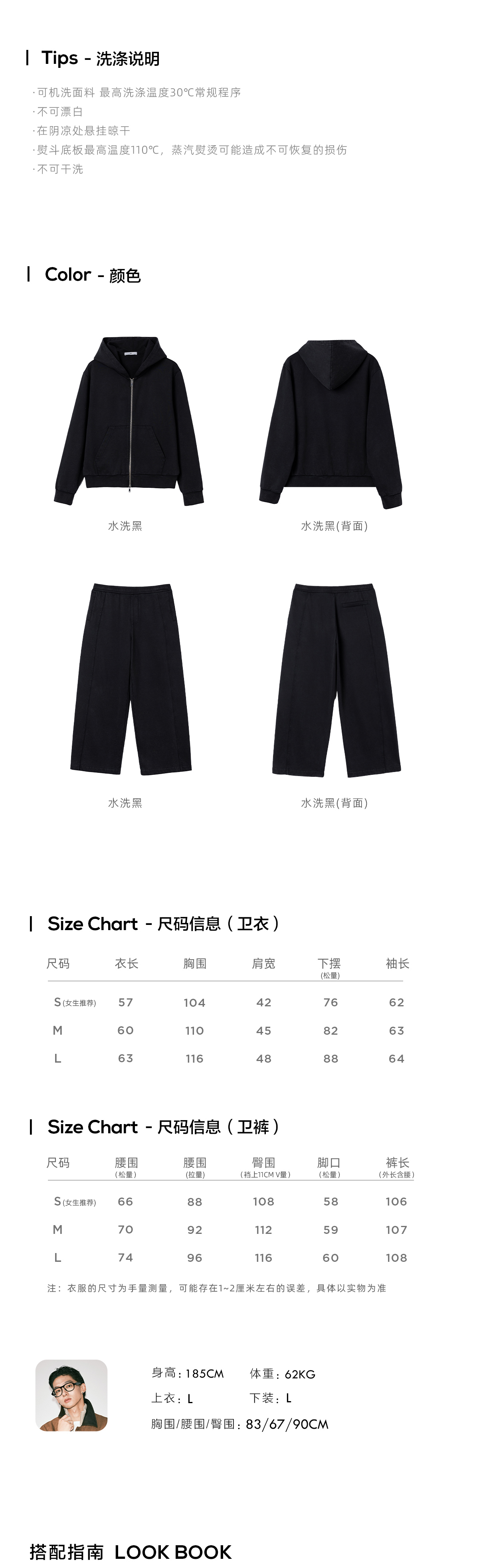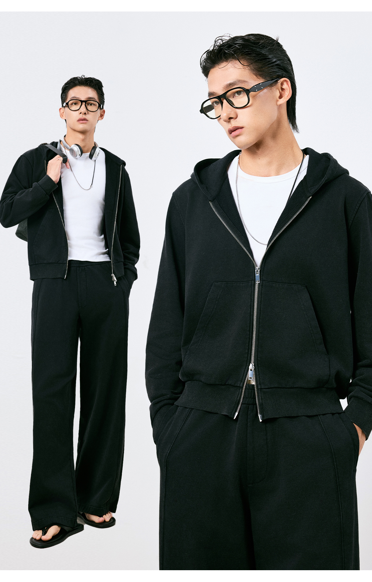 棉仓3671008001-450G重磅boxy短宽纯棉拉链连帽卫衣外套炒雪花水洗黑