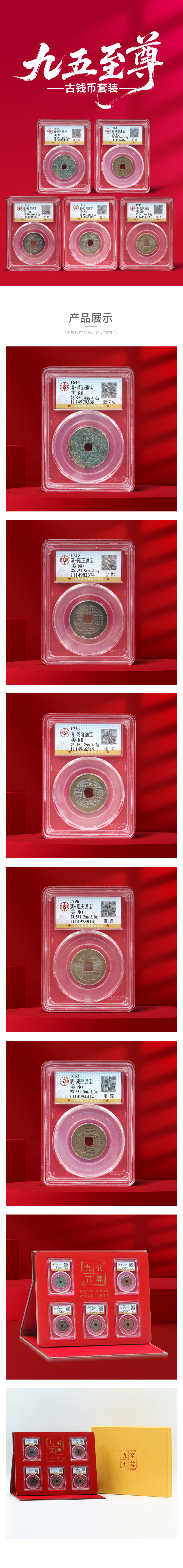 【古钱币】九五之尊清代小五帝古钱币 美品评级套装 五帝钱 黄铜古币
