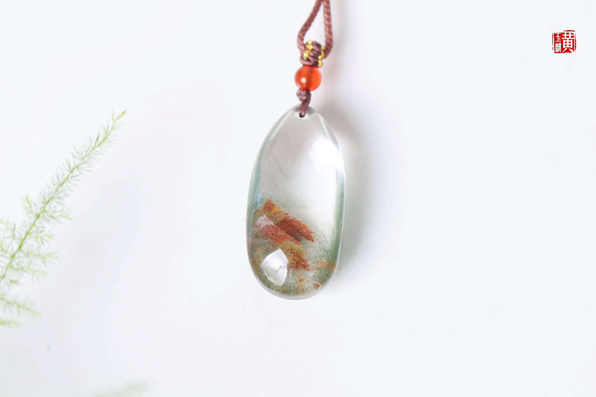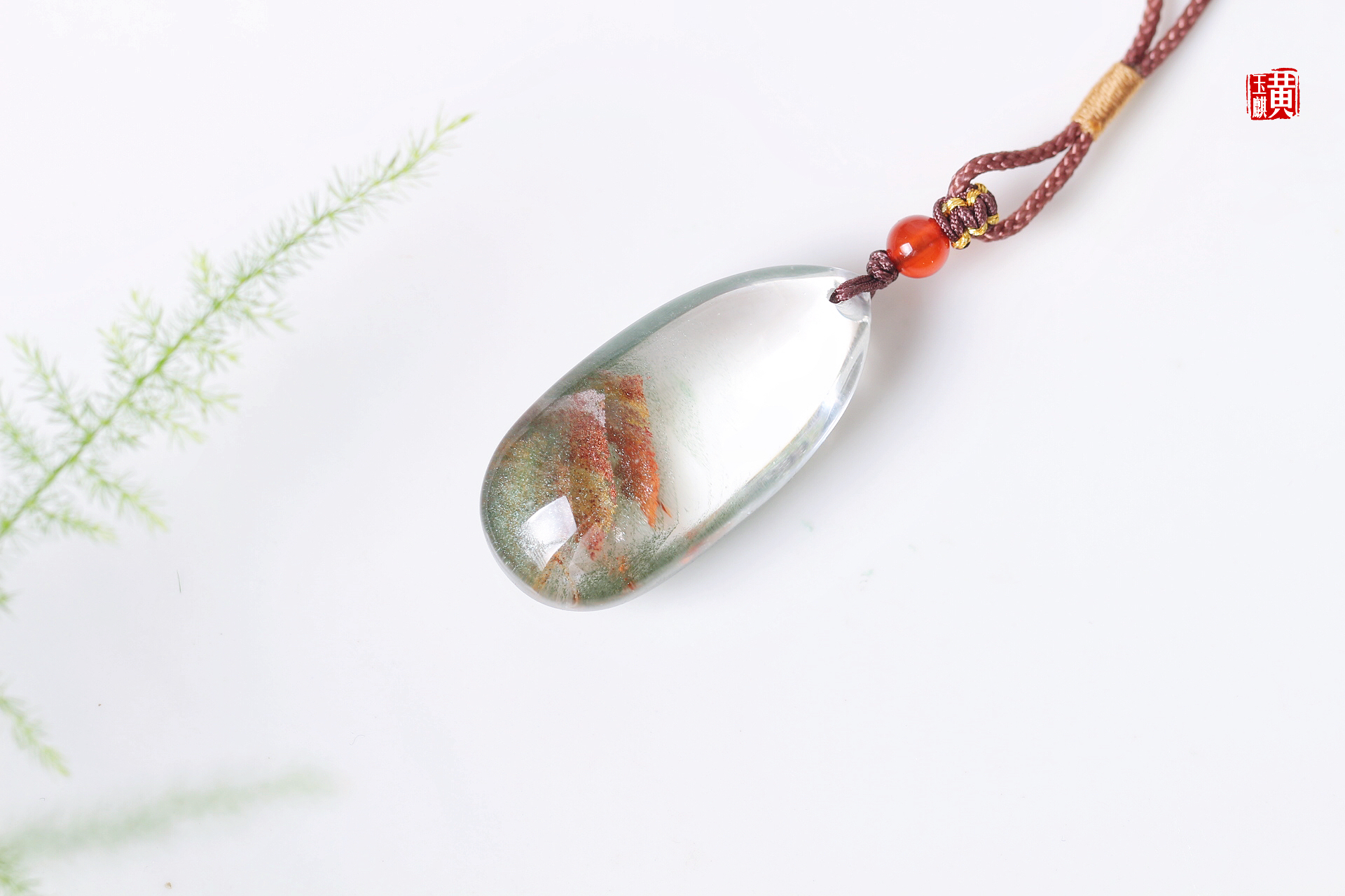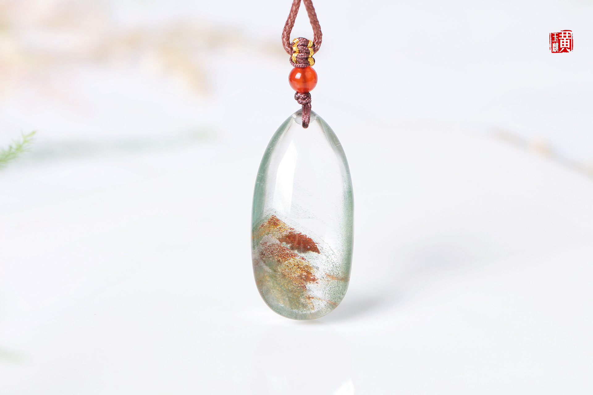 绿幽灵财富山吊坠,通透的晶体内部含有红幽灵、绿幽灵、黄幽灵,形成了财富如山的内部意境,寓意事业红火、财富如山。