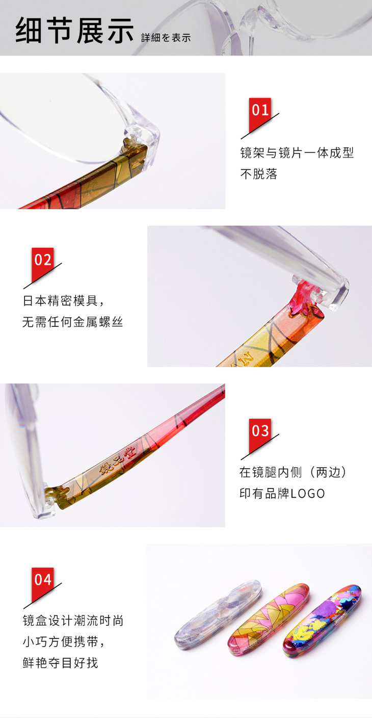 温馨小提示:镜品堂老花镜,通体是树脂材质,没有金属螺丝件,如果脏了可以用清水和中性洗涤剂清洗,清洗之后用软布擦干。当眼镜收纳到眼镜盒中时需要将镜布垫在镜盒中,将眼镜面贴着镜布放,避免镜面划伤哦!
