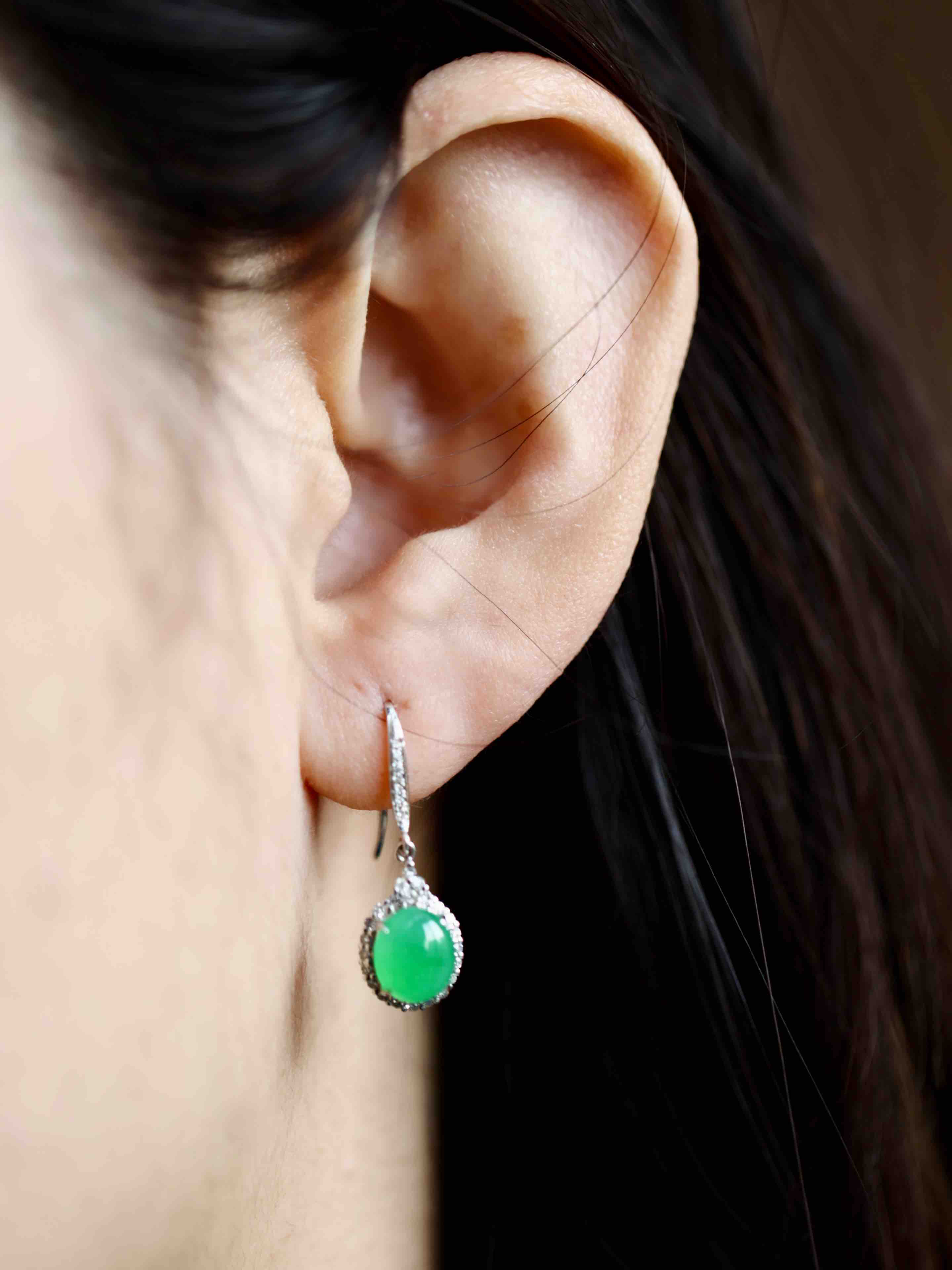 尖货,冰种阳绿翡翠蛋面耳坠,蛋面8.4×6.8×3.2mm,镶嵌后27.1×9.3×6.3mm,荧光四射的种水,娇艳欲滴的阳绿,如此大气饱满的蛋面加上18k白金钻石镶嵌,让人过目不忘,上身效果富贵大气,蛋面有一个侧面有条石纹,另外一个侧面有一个不太明显的深色点,对佩戴都没影响,价格很划算,就按一个半这样算的,品质很高的宝贝,不要拿一般大路货色来比,识货的建议拿下