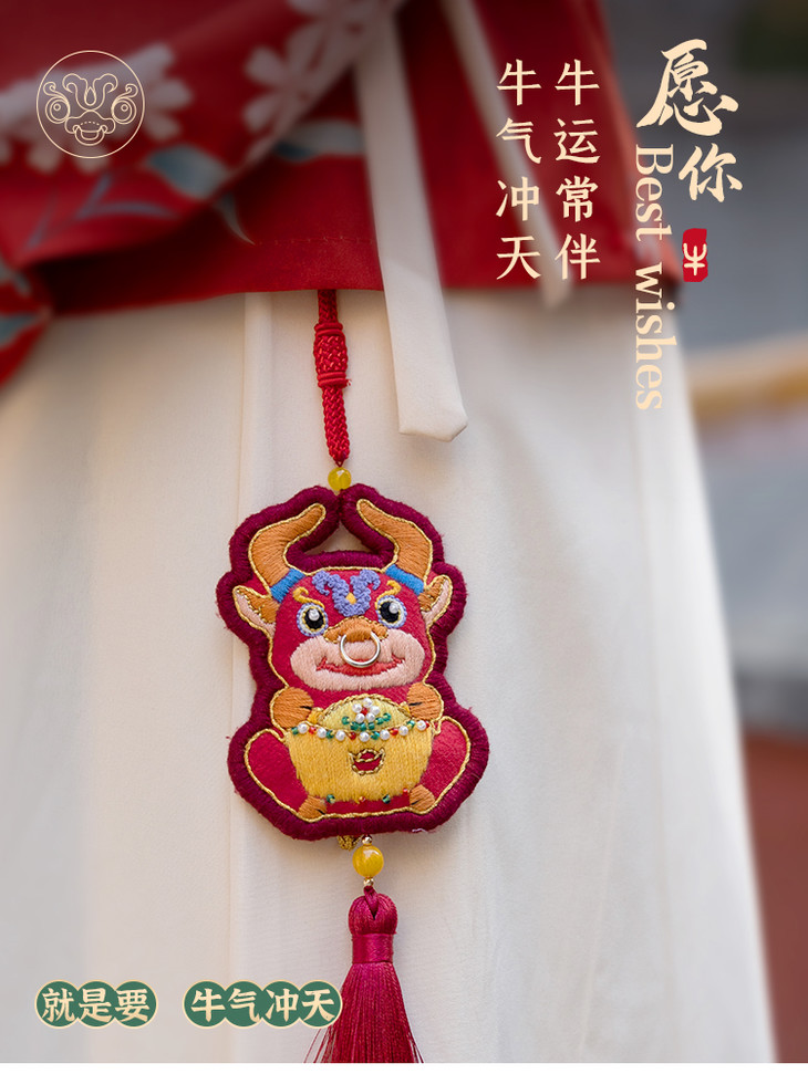 「牛气冲天」牛年刺绣平安符,车挂件,送礼