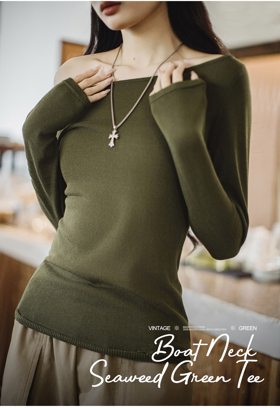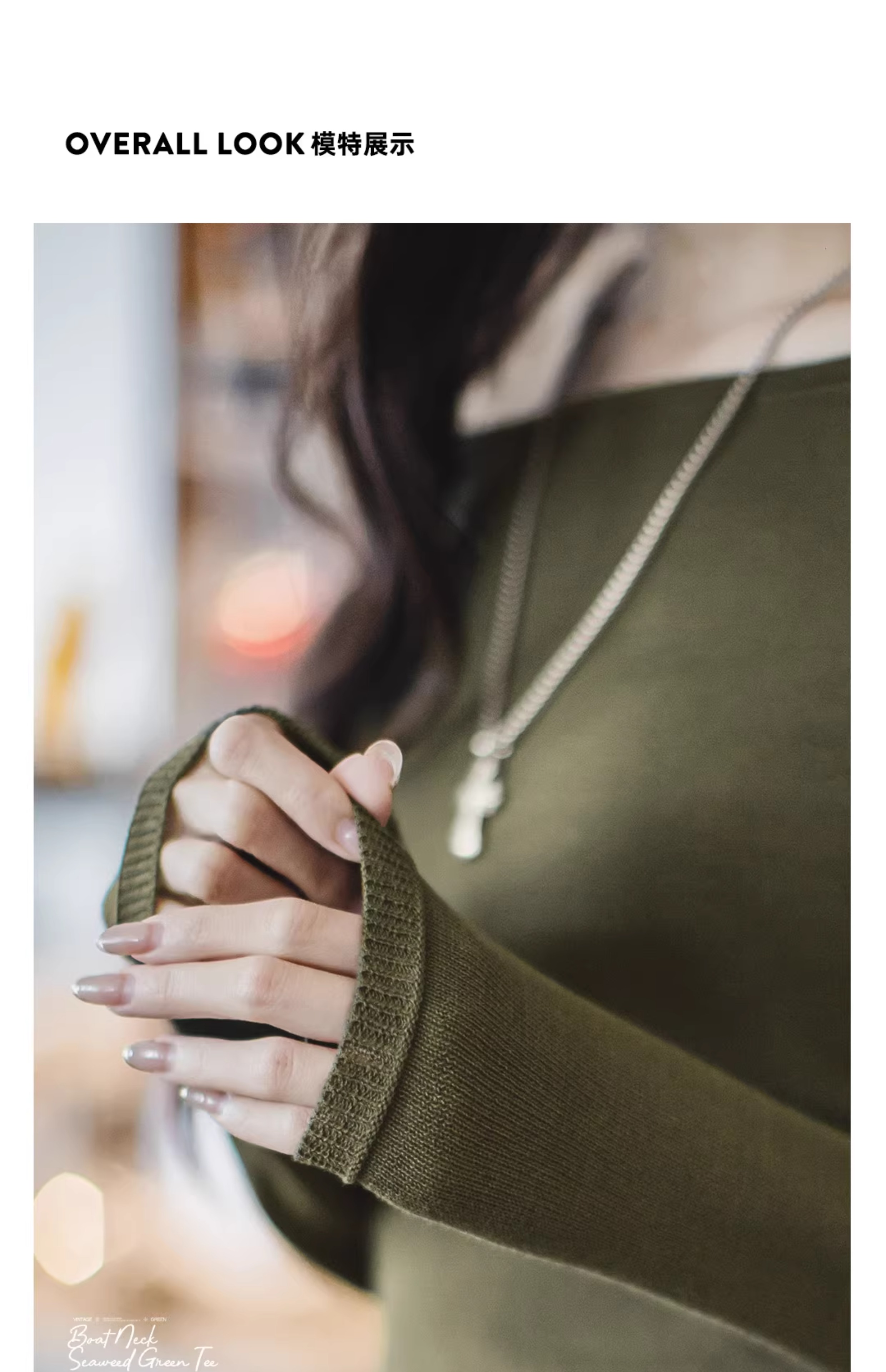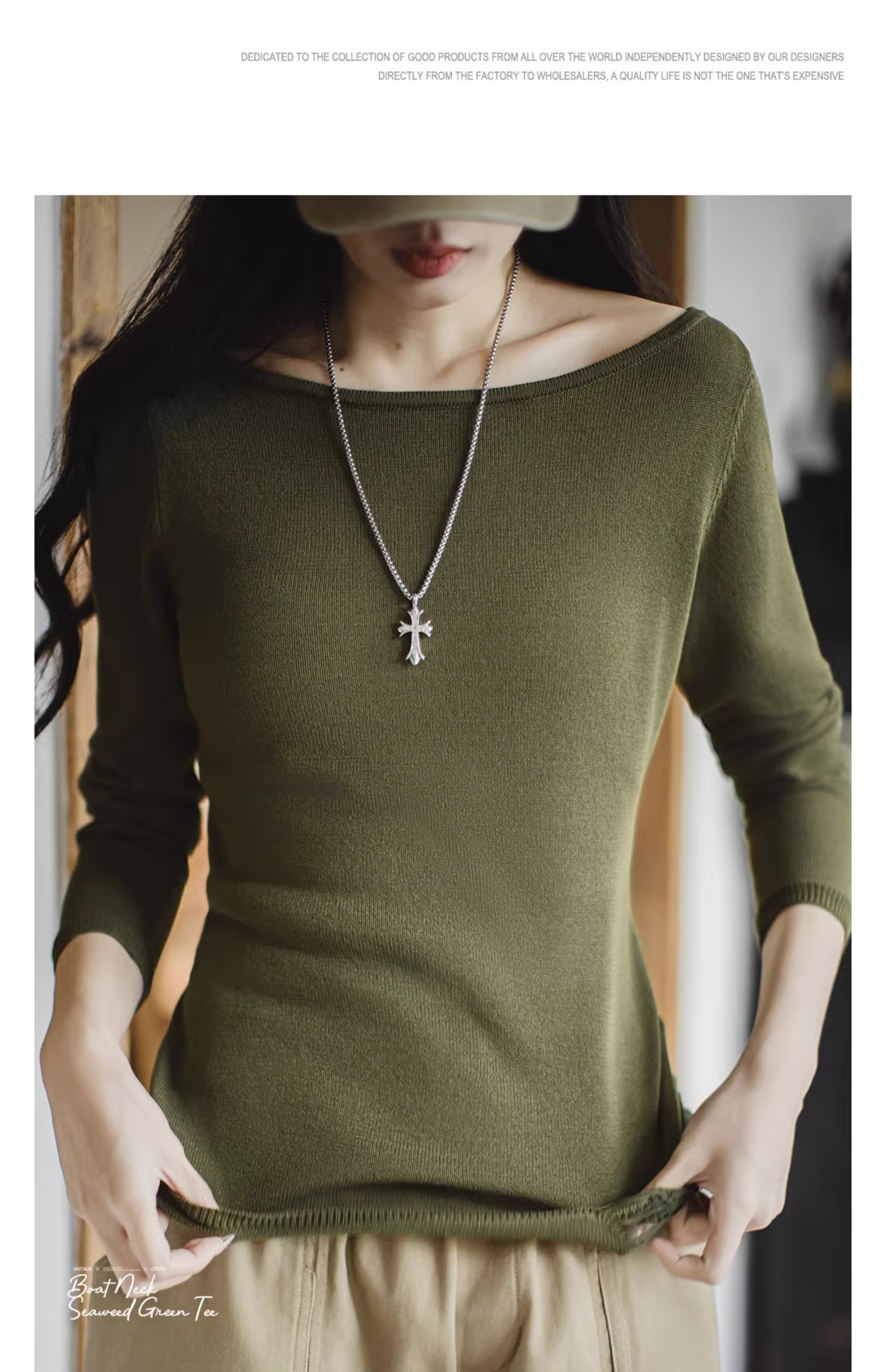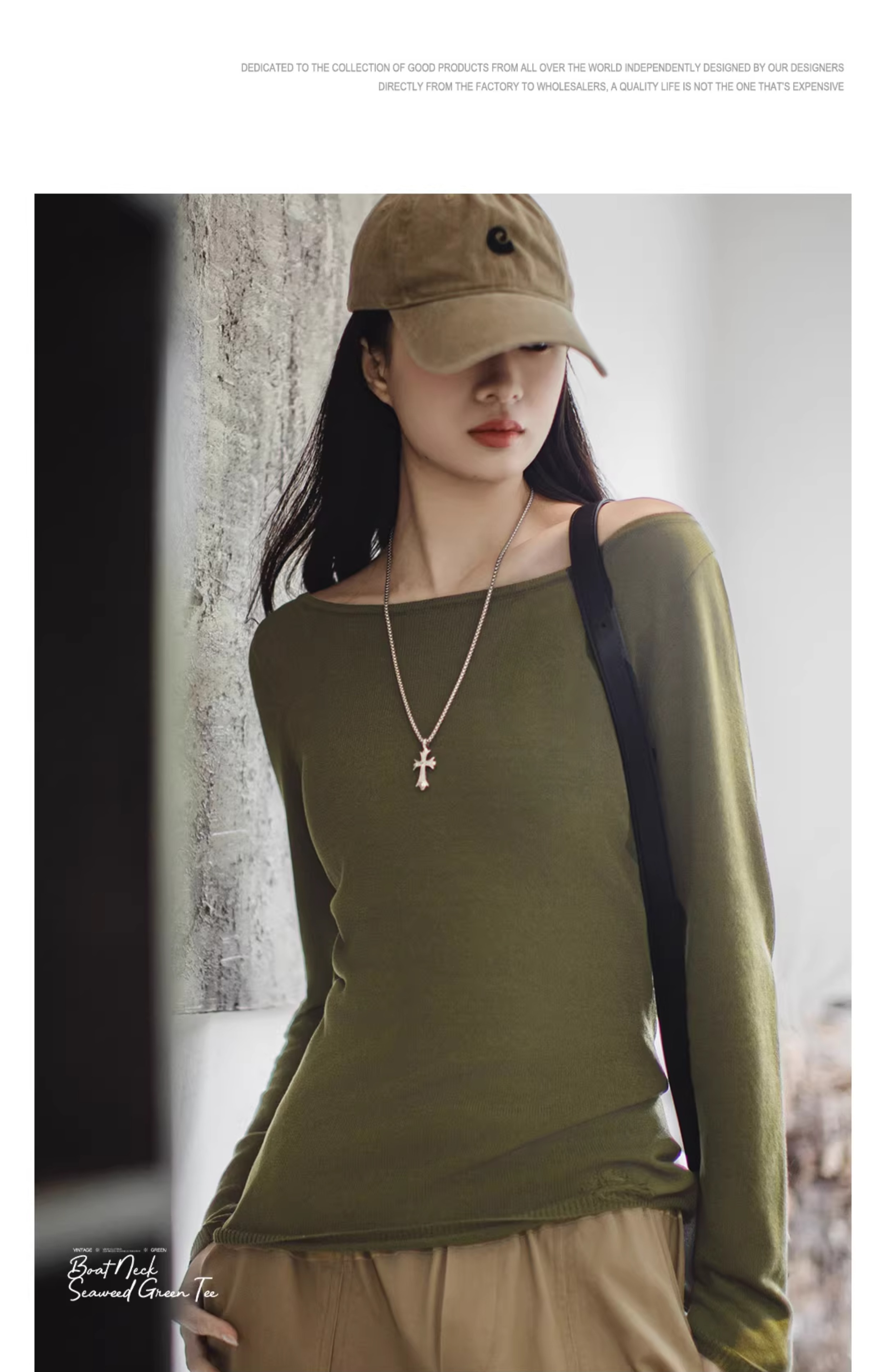 马登毛纱一字领面膜T恤扬子纱破洞打底衫内搭bm修身长袖上衣春女