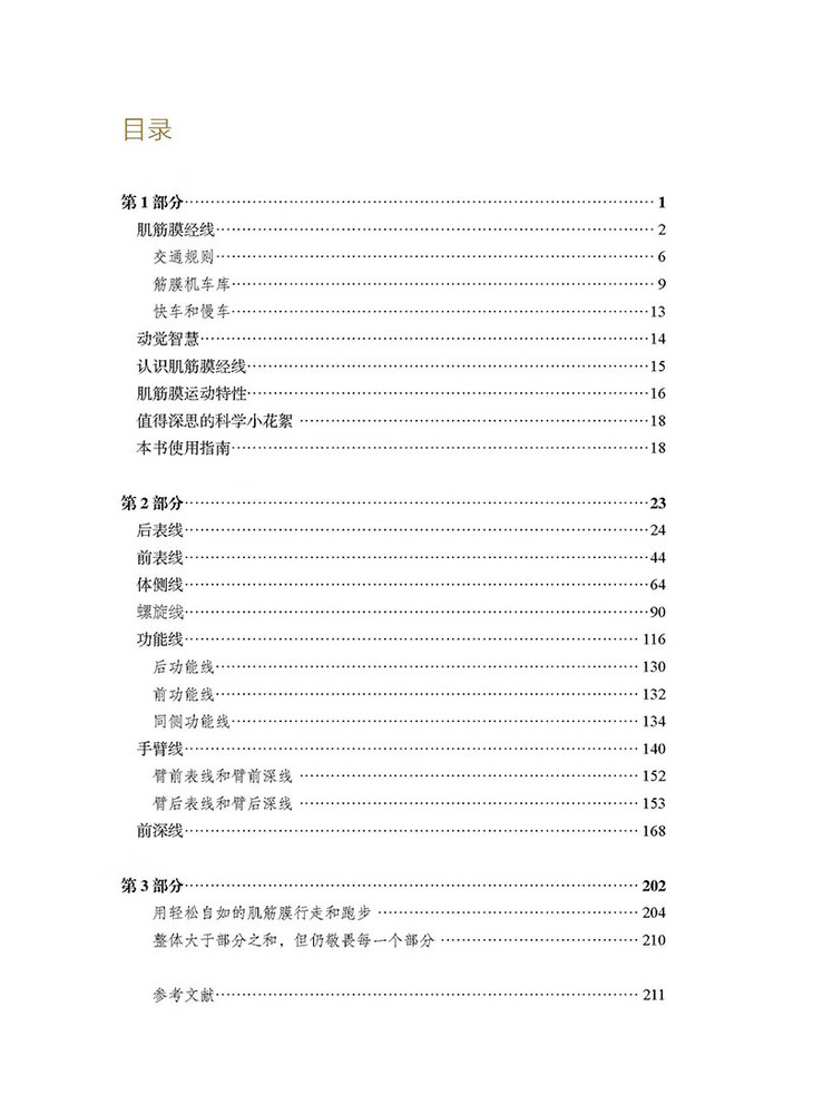 凯琳•古特纳希望通过这本简明的解剖学书籍,让人们对托马斯•迈尔斯开发的《解剖列车》身体地图中的12条肌筋膜经线的理解、实践和记忆之旅变得更加有趣、实用和愉快。作者以筋膜运动开篇,通过介绍筋膜的特性逐一介绍解剖列车肌筋膜经线的结构、身体感受和运动练习,带领读者将解剖结构与身心结合,使复杂的肌肉功能具象化。书中包含的视频内容,从运动练习到解剖知识,再到冥想练习,完整的引领读者学习和巩固了知识点,也从意识层面深入体会12条经线具备的功能和特性。书中的图片非常漂亮,作者以健康轻盈的体态亲身示范经线的身体地图,很难想象这是一位长者呈现出来的身体状态。