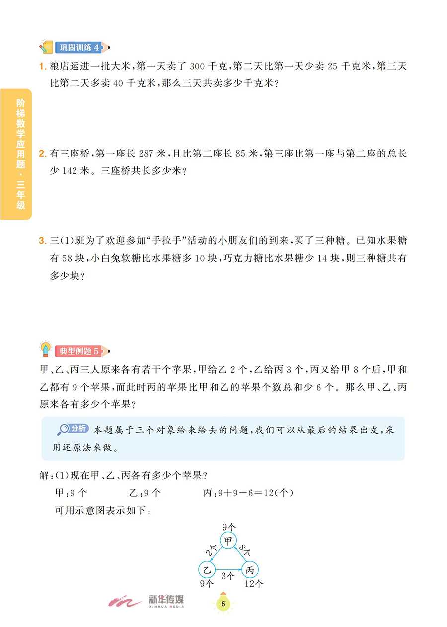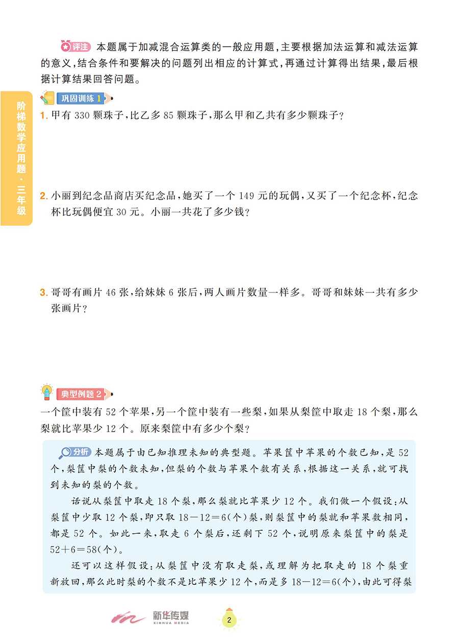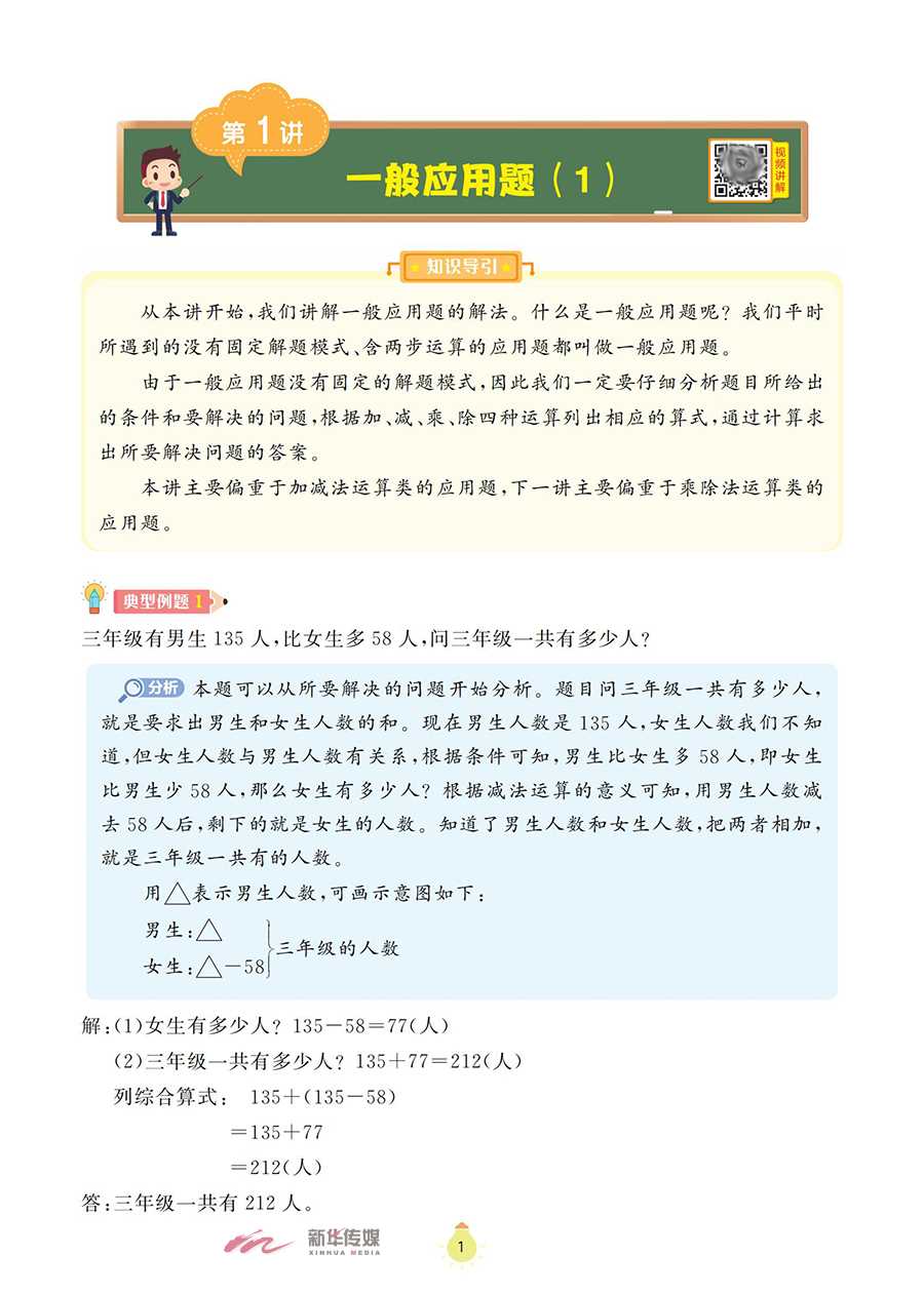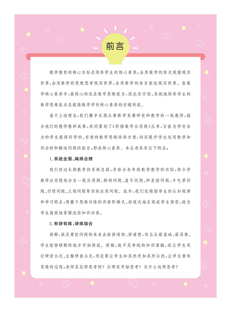 本书为《阶梯数学应用题》系列之一,以《义务教育数学课程标准(2022版)》为指导,将小学阶段的数学应用题划分为一般应用题、植树问题、盈亏问题、和差倍问题、牛吃草问题、路程问题、工程问题等,内容涵盖整个小学阶段数学应用题的全部题型。本书精心选取全国各地的小学数学竞赛试题,并对部分题目进行改编、整理,辅以相应的题目作为巩固训练;同时,对每道典型例题和巩固训练都做了分析和解答,配有答案全解和视频讲解,便于学生通过讲练结合,高效地掌握数学知识,体会数学思维的乐趣。本书既可作为小学三年级学生掌握数学思维方法的自学用书,也可以作为家长的辅导用书和数学教师培优备课的参考用书。