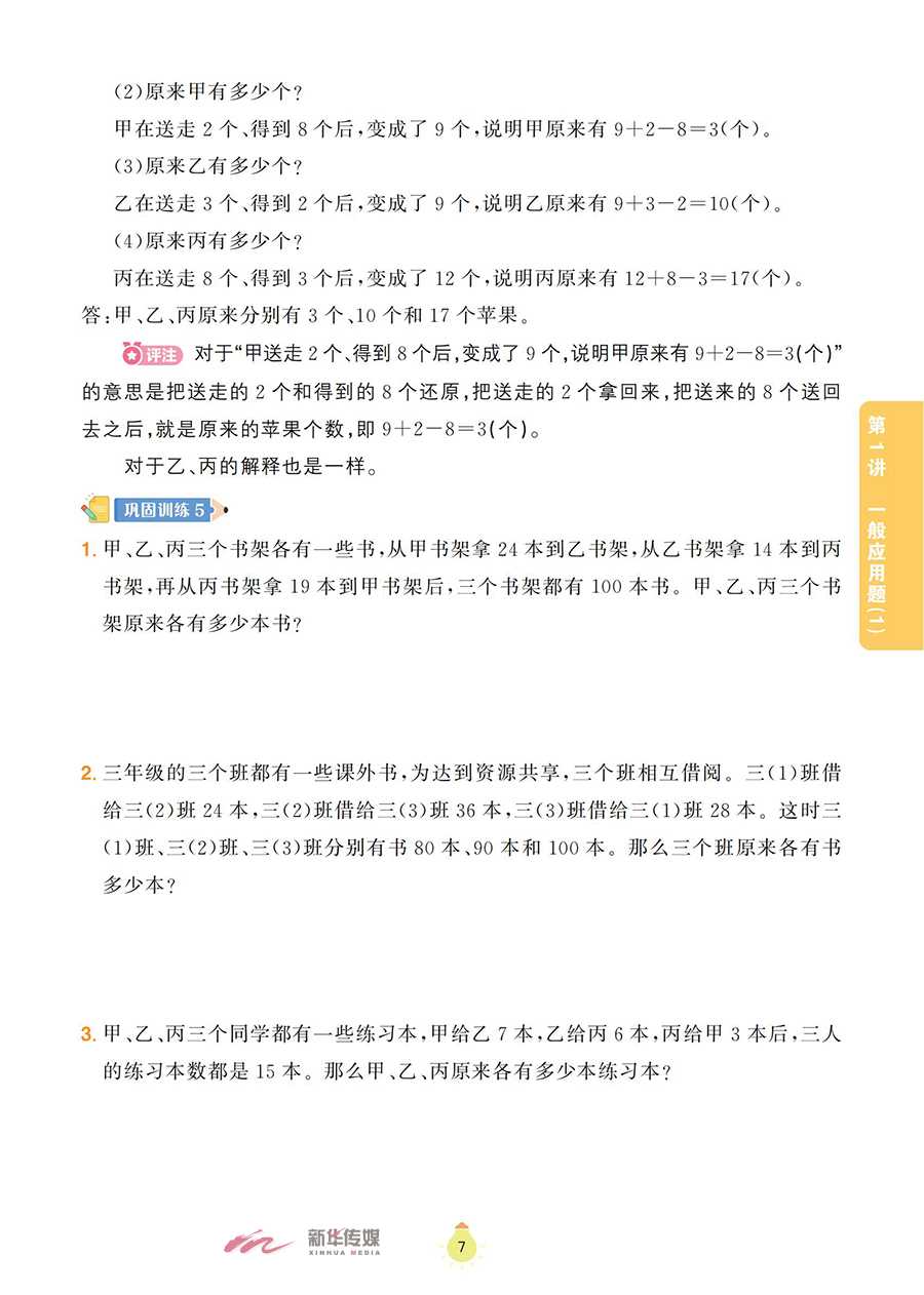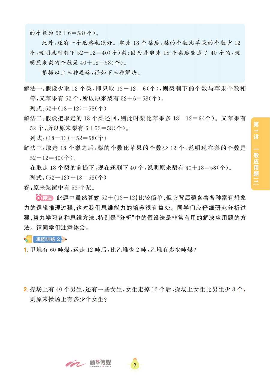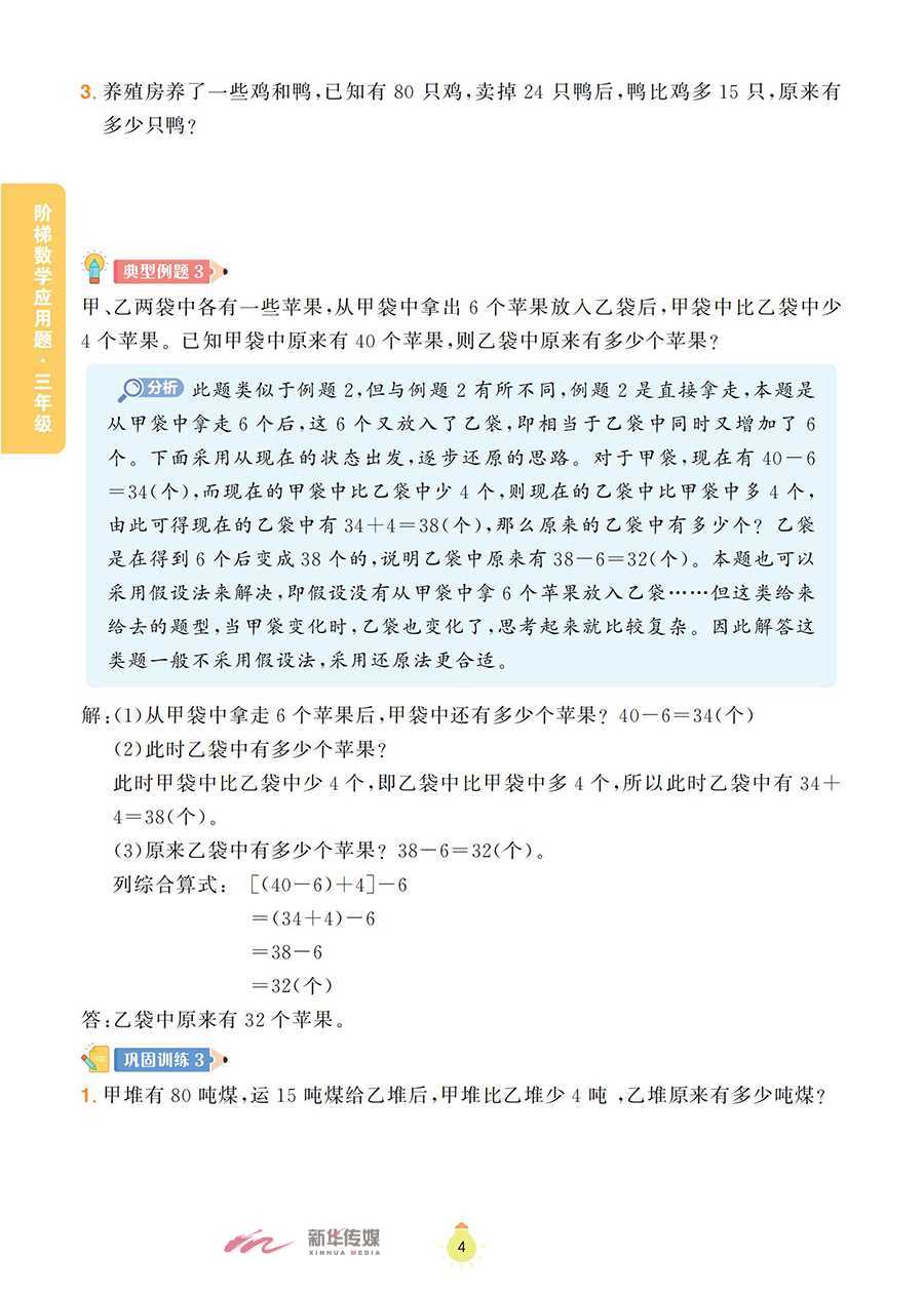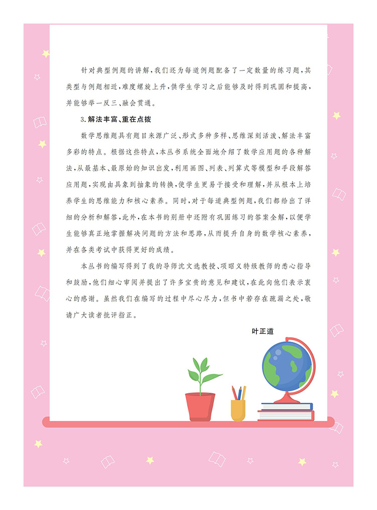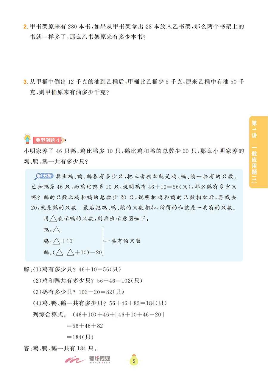 本书为《阶梯数学应用题》系列之一,以《义务教育数学课程标准(2022版)》为指导,将小学阶段的数学应用题划分为一般应用题、植树问题、盈亏问题、和差倍问题、牛吃草问题、路程问题、工程问题等,内容涵盖整个小学阶段数学应用题的全部题型。本书精心选取全国各地的小学数学竞赛试题,并对部分题目进行改编、整理,辅以相应的题目作为巩固训练;同时,对每道典型例题和巩固训练都做了分析和解答,配有答案全解和视频讲解,便于学生通过讲练结合,高效地掌握数学知识,体会数学思维的乐趣。本书既可作为小学三年级学生掌握数学思维方法的自学用书,也可以作为家长的辅导用书和数学教师培优备课的参考用书。