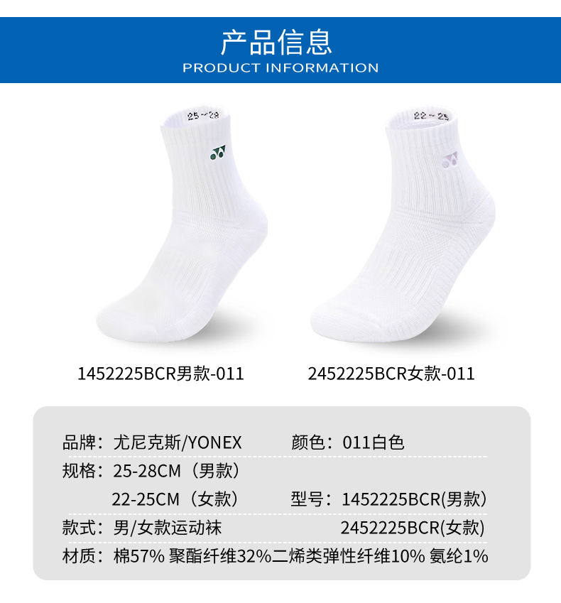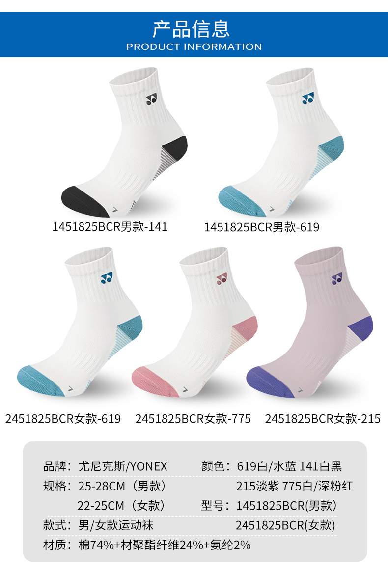 YONEX尤尼克斯1451825BCR男女款羽毛球袜吸湿透气柔软舒适运动袜
