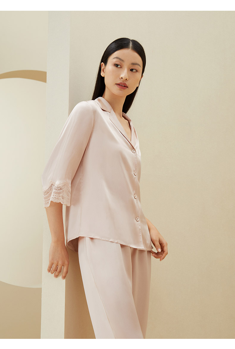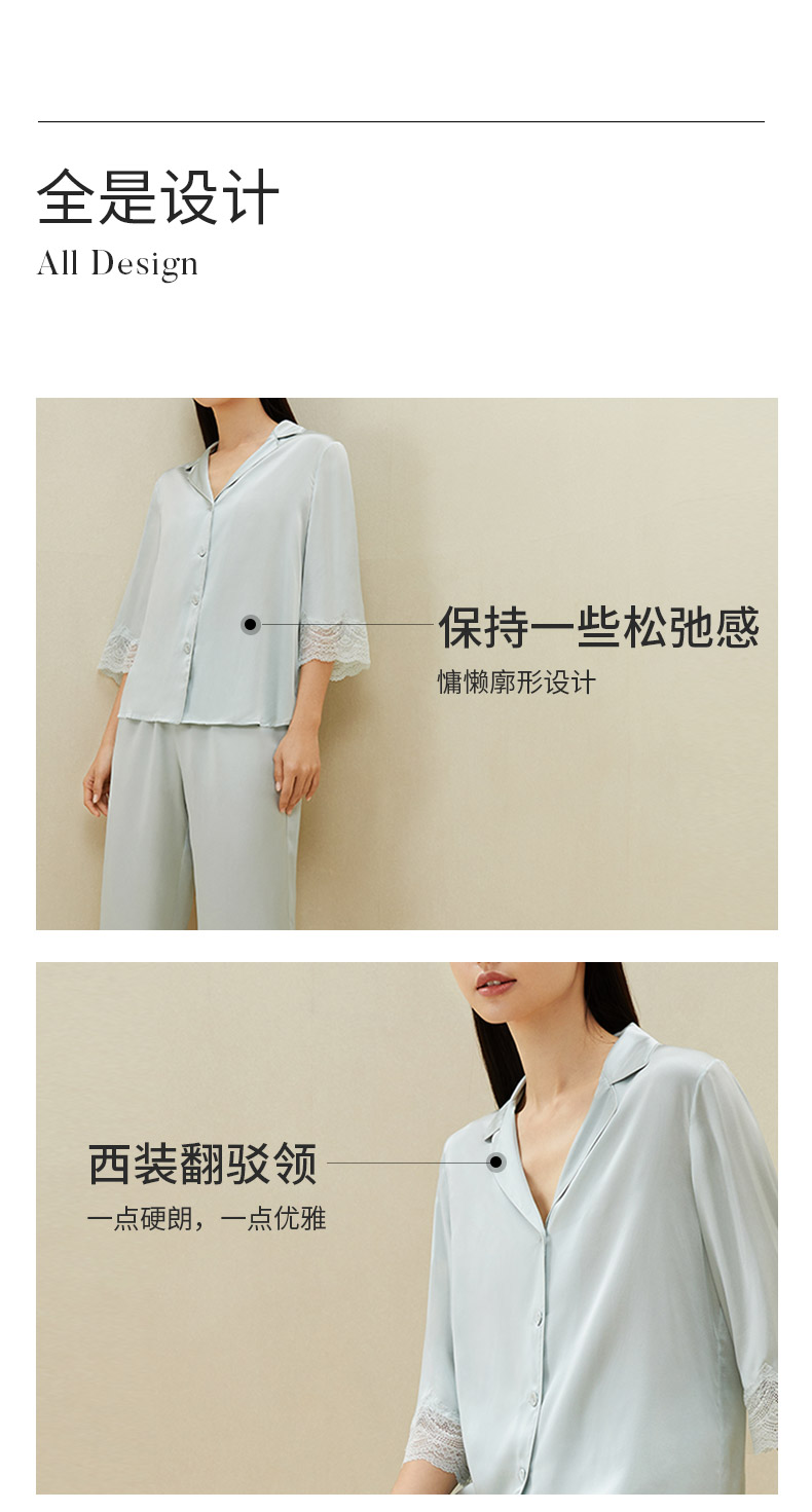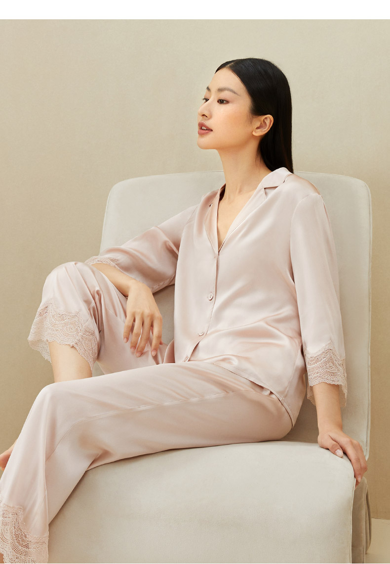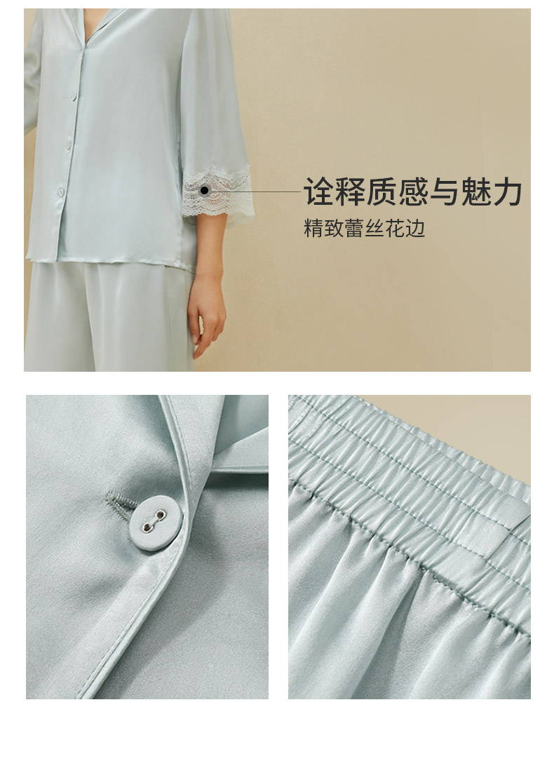 礼物】金三塔真丝睡衣女100%桑蚕丝V领蕾丝边丝滑舒适绸缎家居服衣裤套 YSFAA203(限价款)