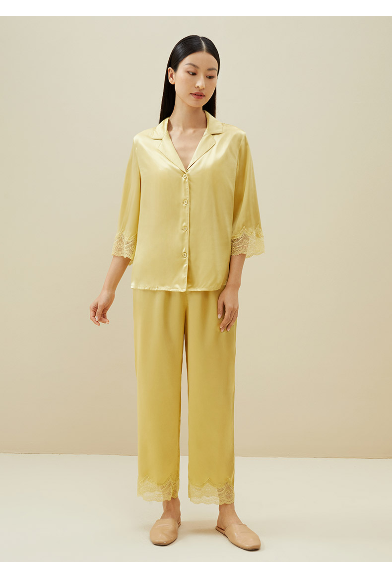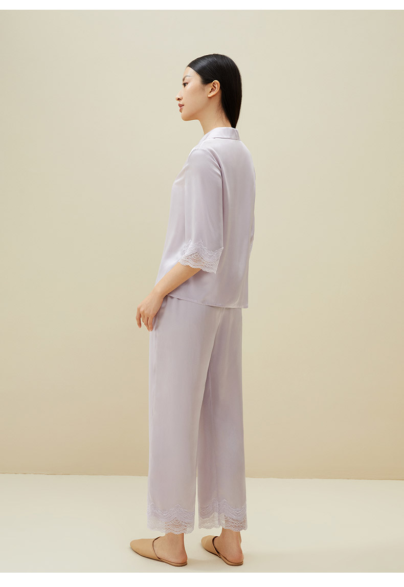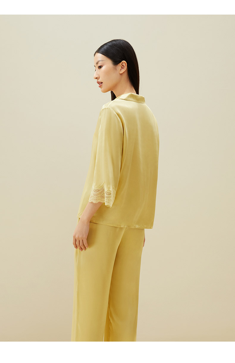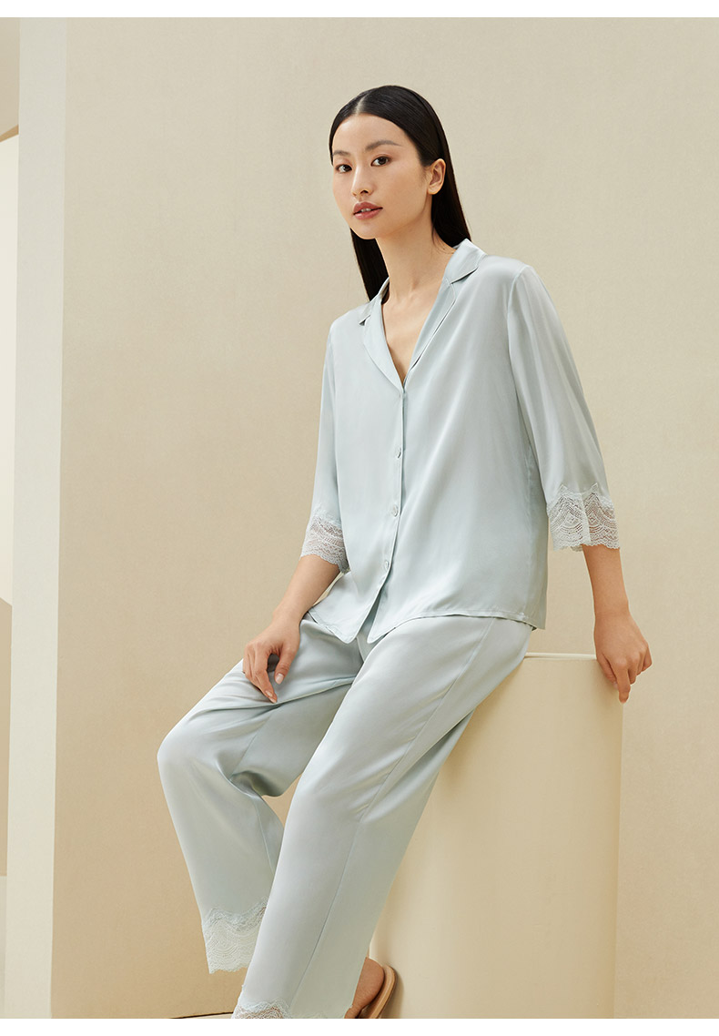 礼物】金三塔真丝睡衣女100%桑蚕丝V领蕾丝边丝滑舒适绸缎家居服衣裤套 YSFAA203(限价款)