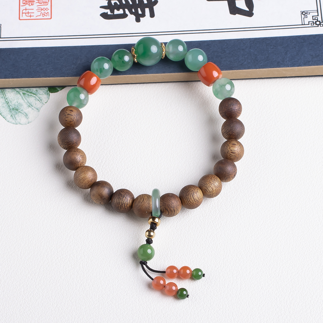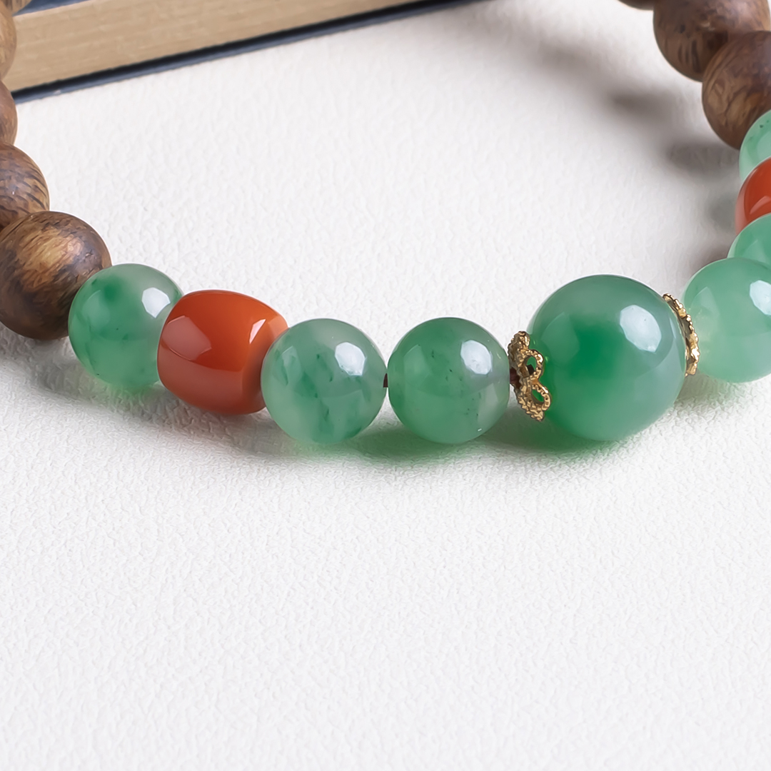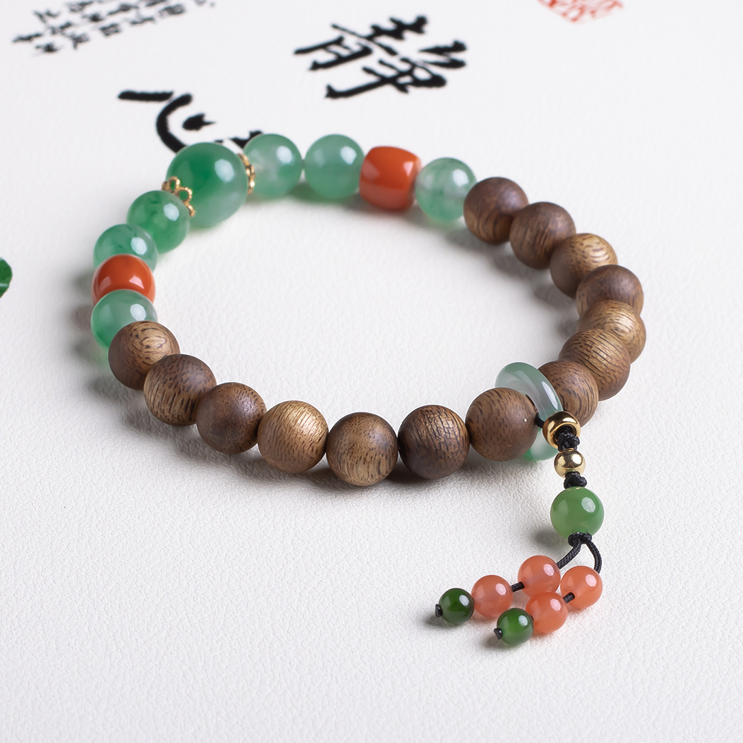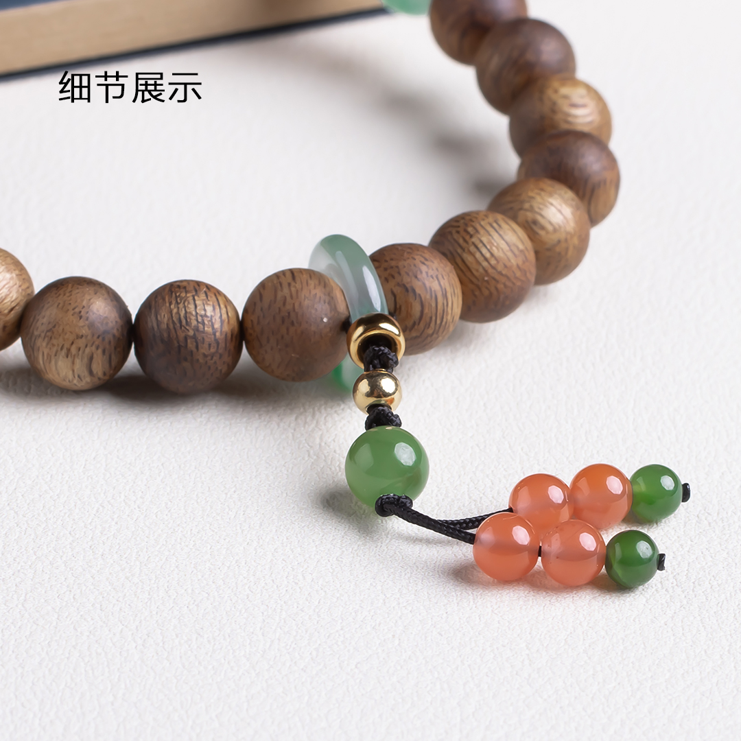 xy0433沉香+非洲翠南红国风手串,天然沉香约8.5mm,原色原味,香味自然清甜,冰飘花的非洲翠南红,翠绿相映,经典中带着时尚年轻的活力,上手百搭。