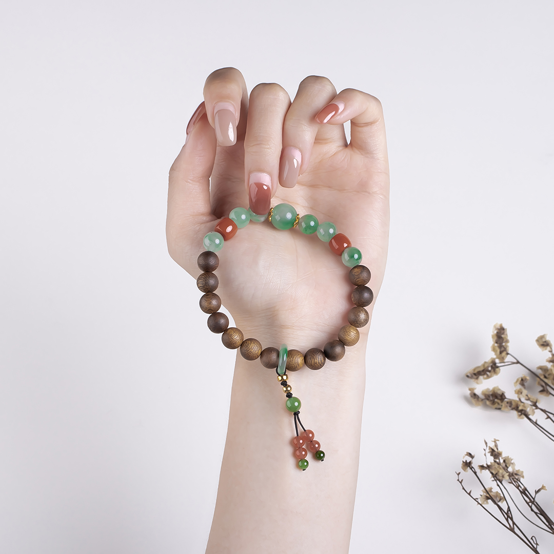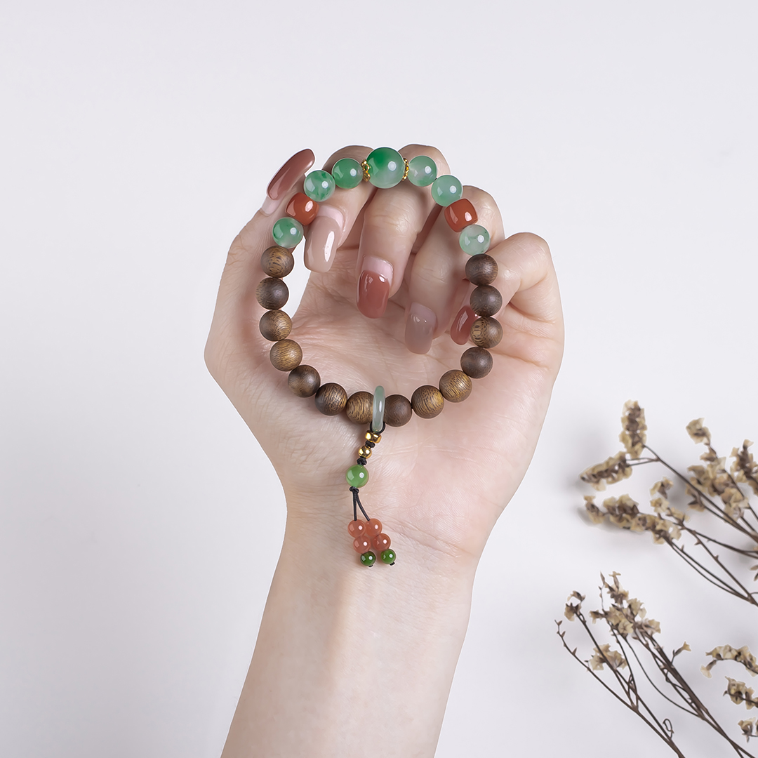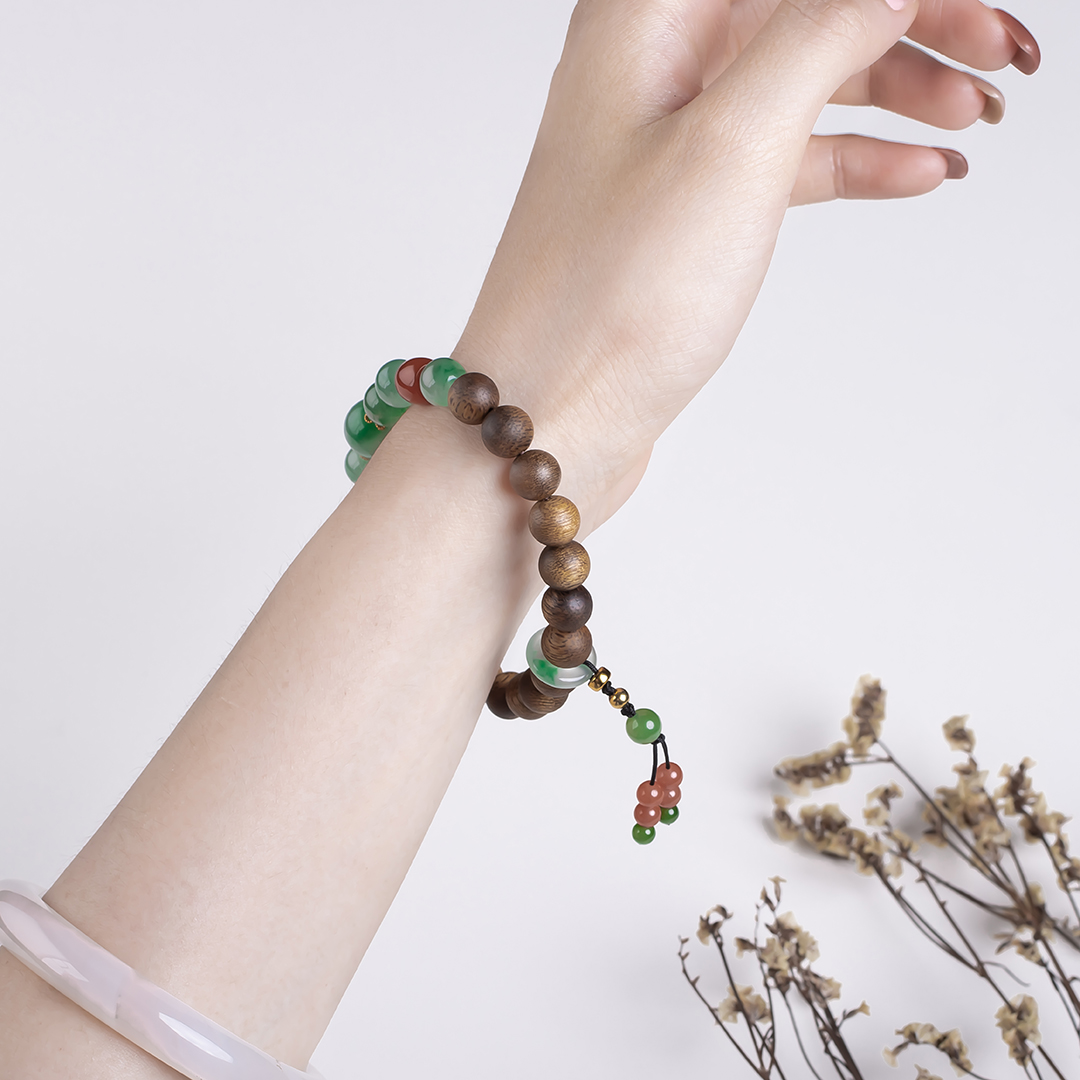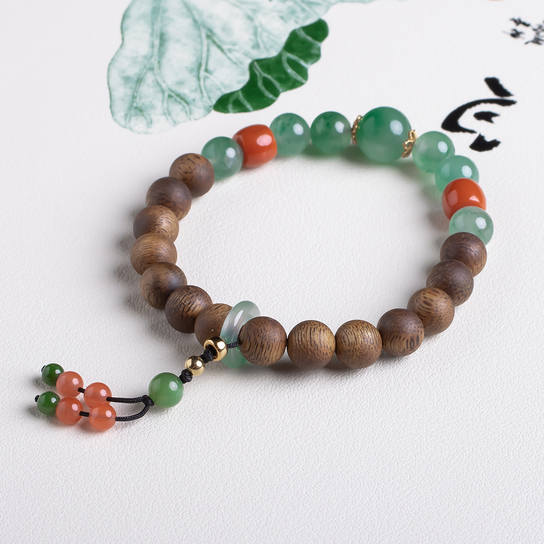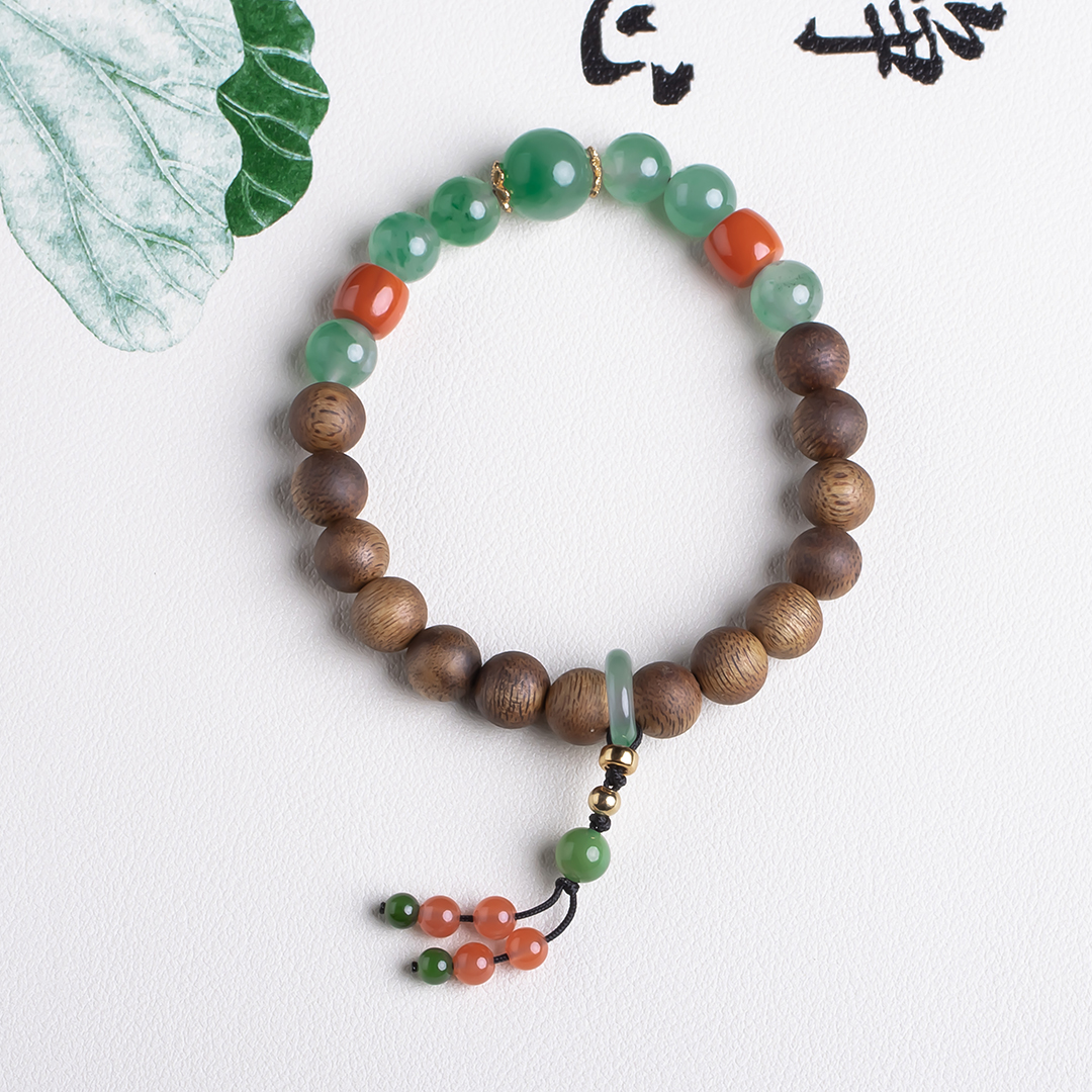 xy0433沉香+非洲翠南红国风手串,天然沉香约8.5mm,原色原味,香味自然清甜,冰飘花的非洲翠南红,翠绿相映,经典中带着时尚年轻的活力,上手百搭。