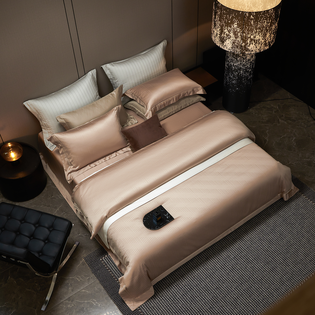 ⚜️工艺融合高端围边刺绣与进口高级染色提花技术,以德国进口精密机绣精工打造!呈现如钢琴键般金光粼粼的高级且现代的卧室质感!