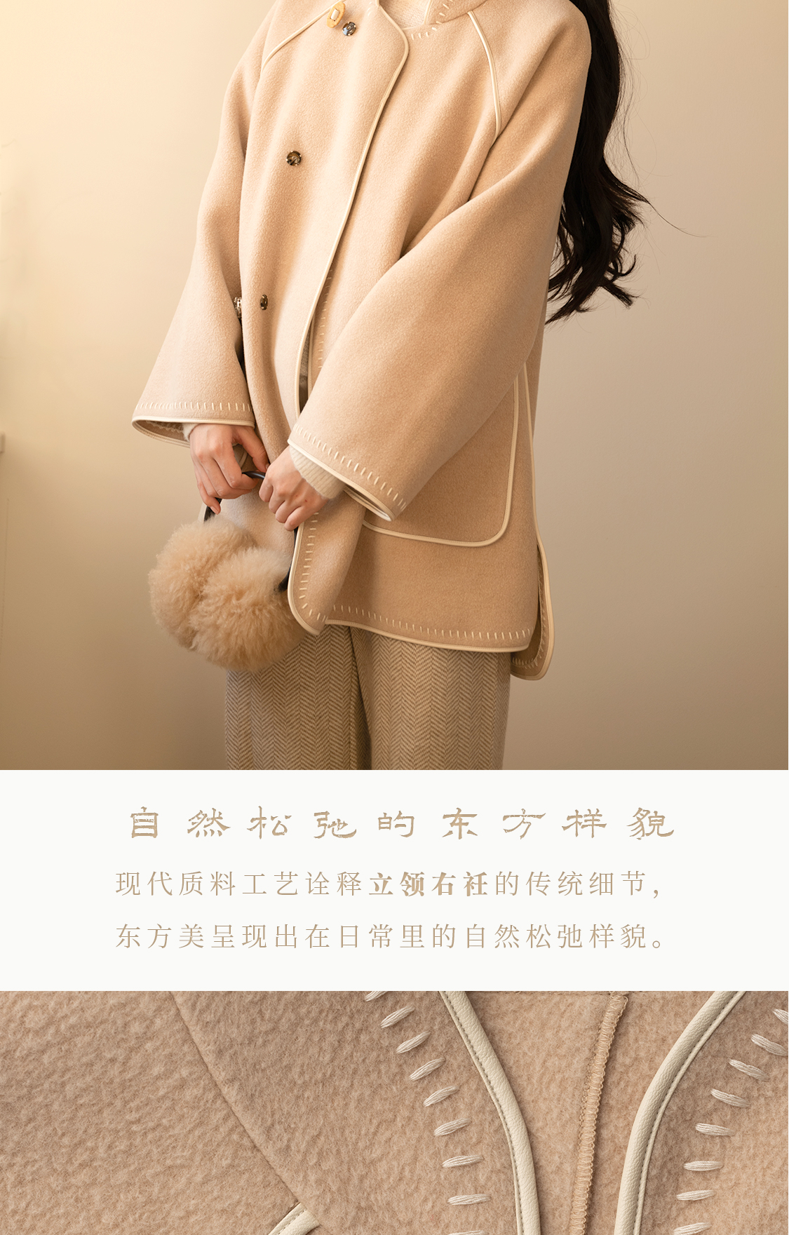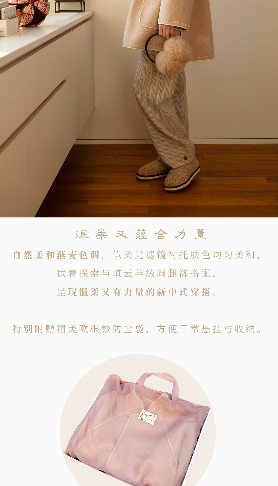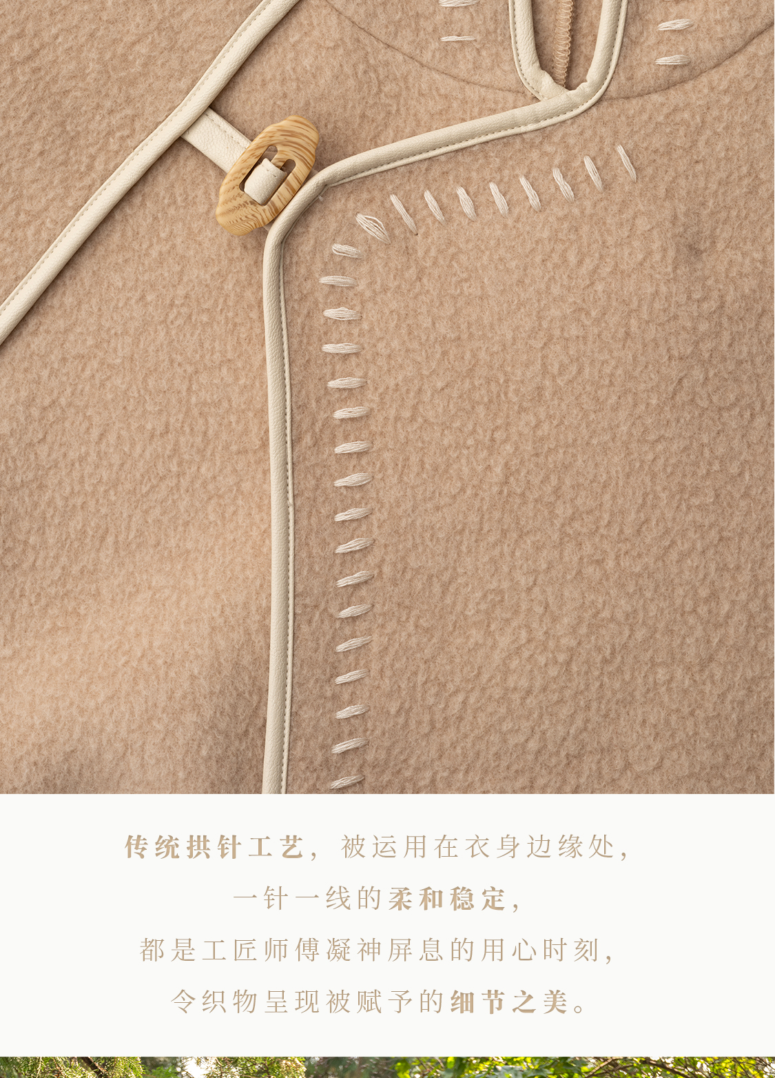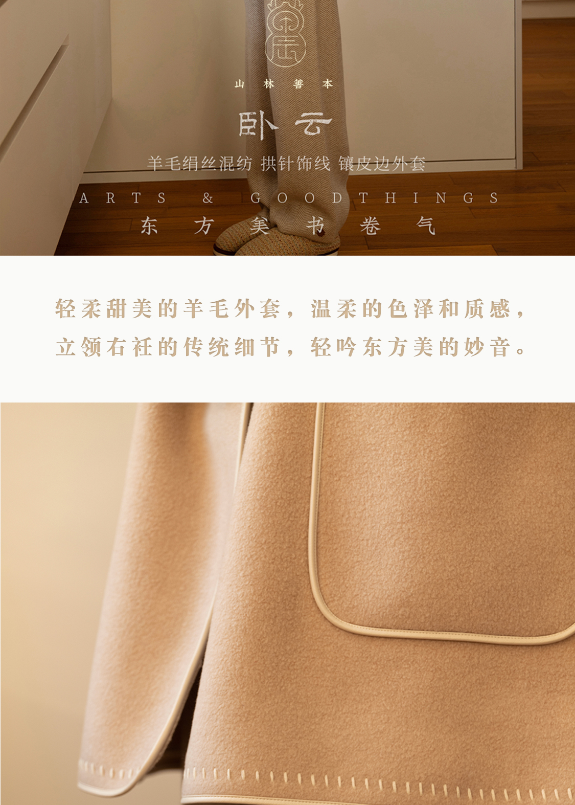 卧云 羊毛绢丝混纺 拱针饰线 镶皮边外套 山林曦照