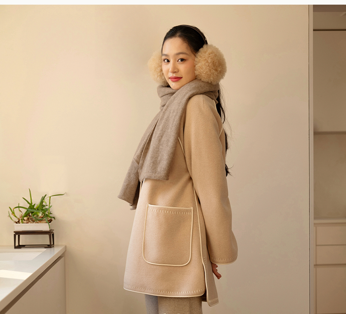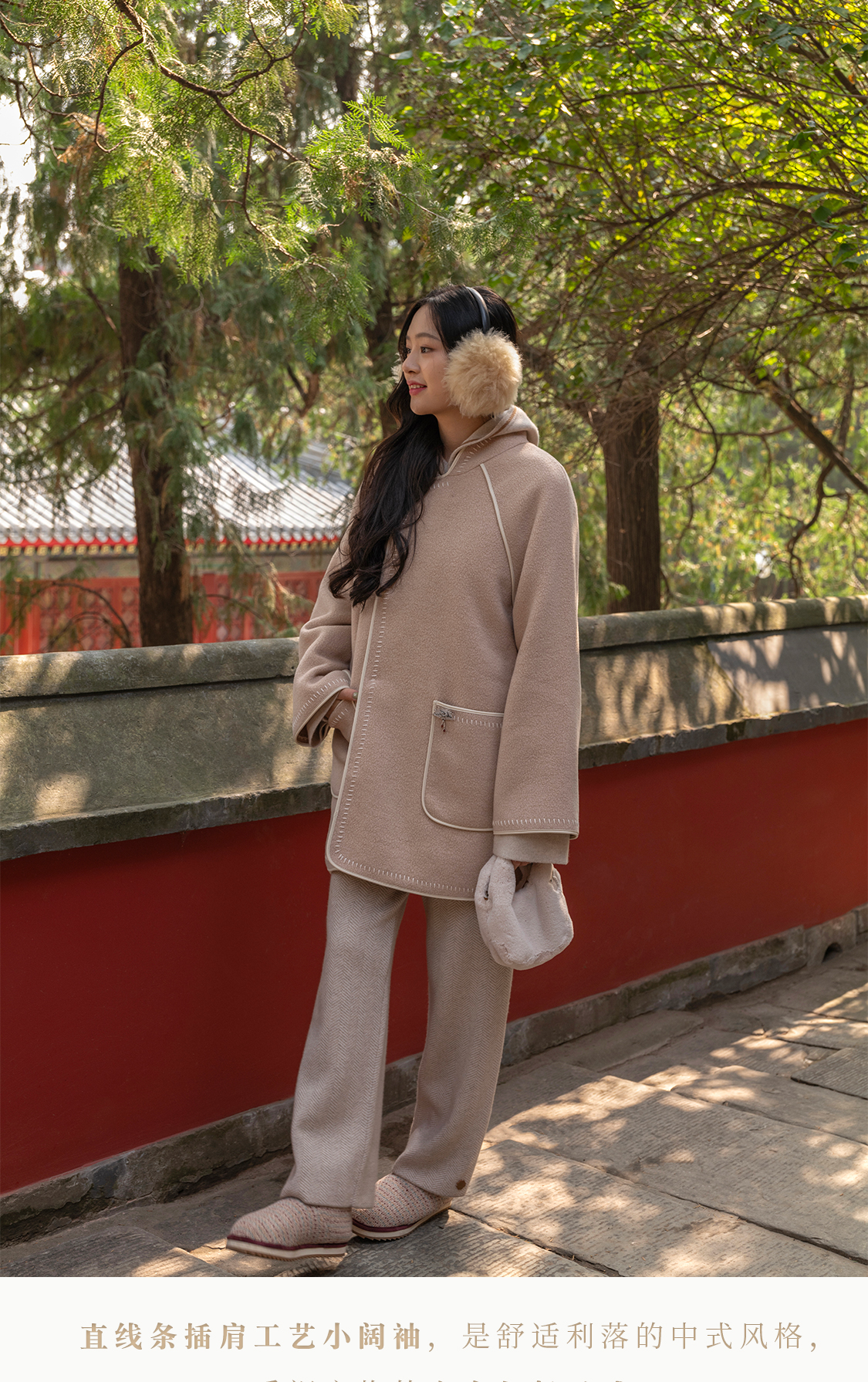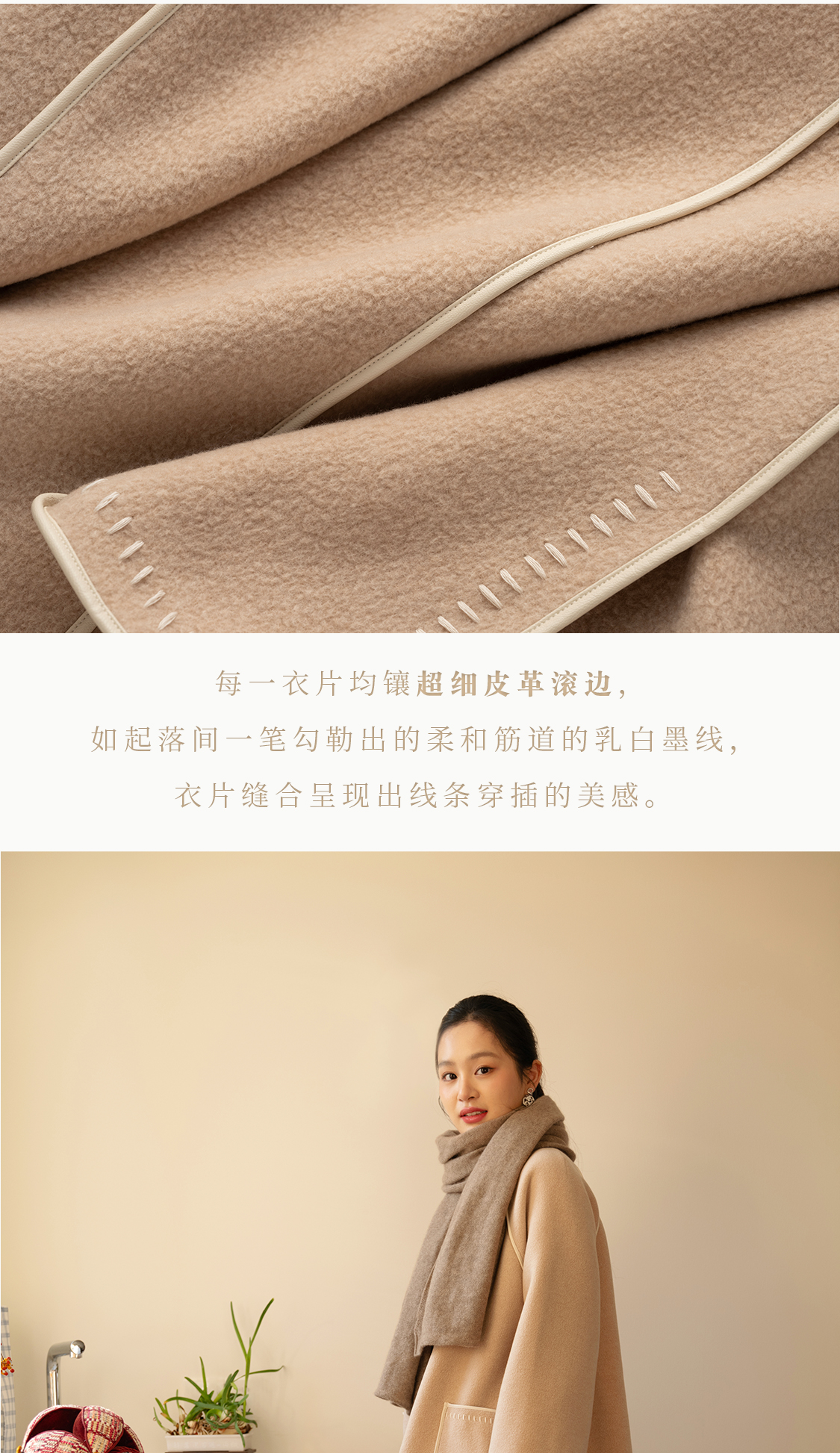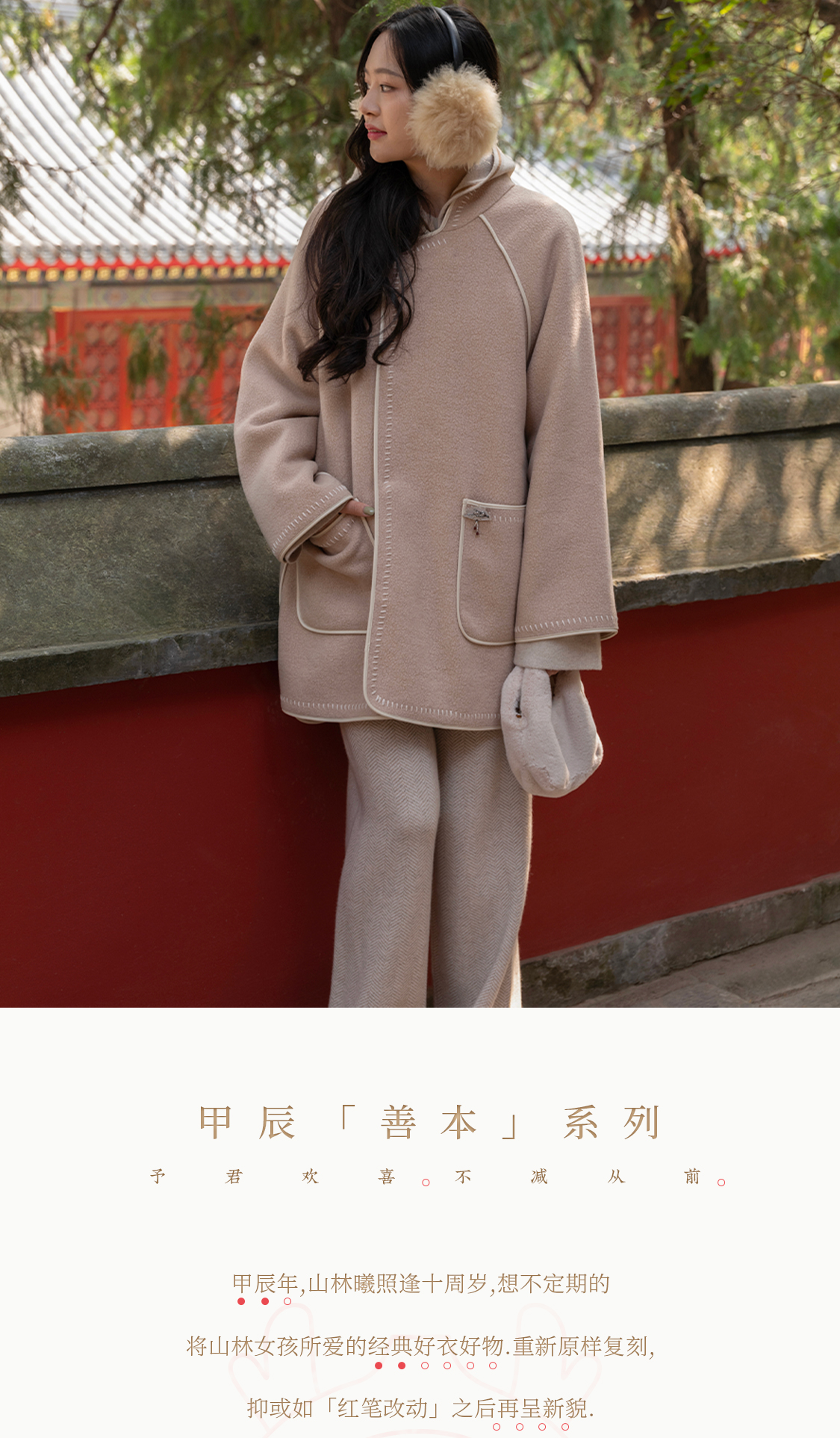 卧云 羊毛绢丝混纺 拱针饰线 镶皮边外套 山林曦照