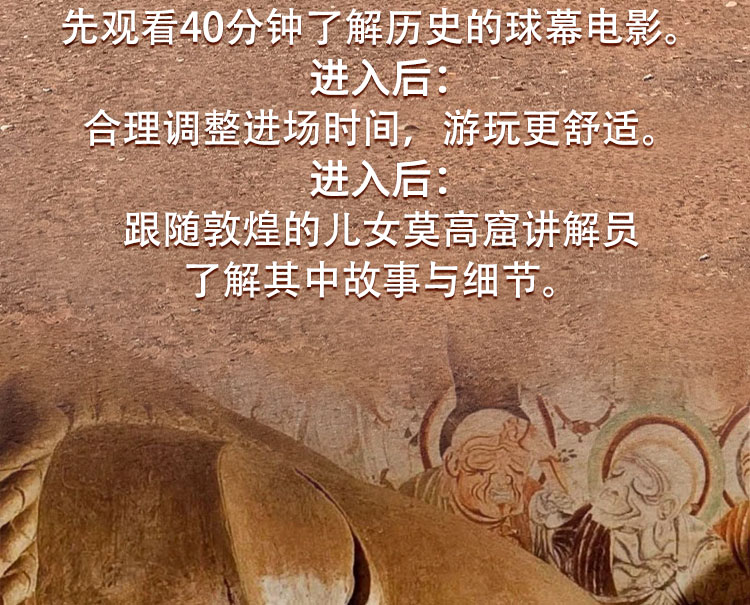 特别注意:敦煌莫高窟自2015年7月10日起,对景区参观实行限流政策,每天仅限开放6000人次,且门票需提前1月实名制预定,如无法预约到常规门票及临时报名的小伙伴,我们将采取预定景区应急票(应急票参观4个石窟,正常票参观8个石窟+2场数字电影)。提前30天以上报名成功的(已缴费)小伙伴,常规票都能预约到,30天内报名的小伙伴,我们将竭尽全力为您预约常规门票,临时报名的,我们也尽最大努力为您抢购应急票(注:所有应急票都会电话或短信告知,应急票是到敦煌后再购买,存在买不到的可能性)。预约的参观时间不定,在敦煌活动这两天的行程会根据洞窟门票的时间作相应调整。