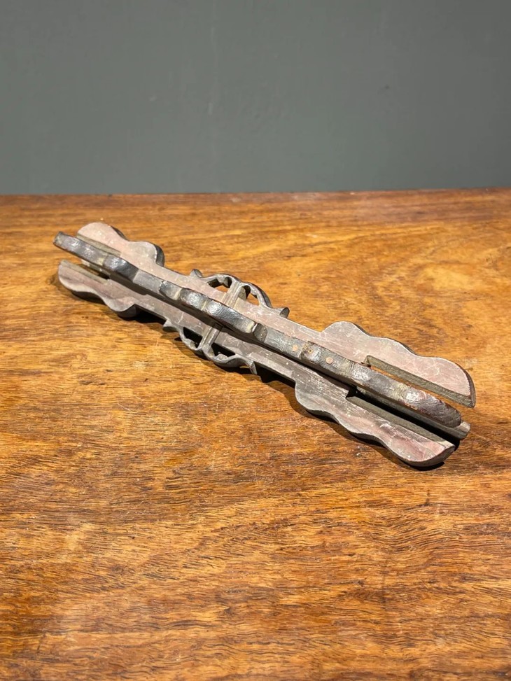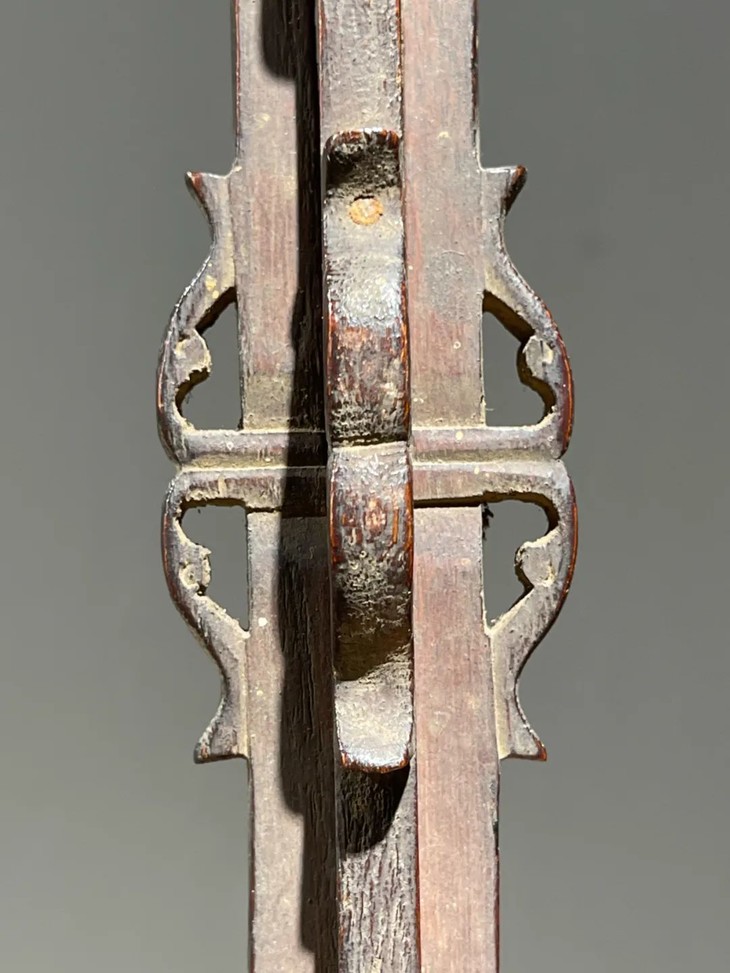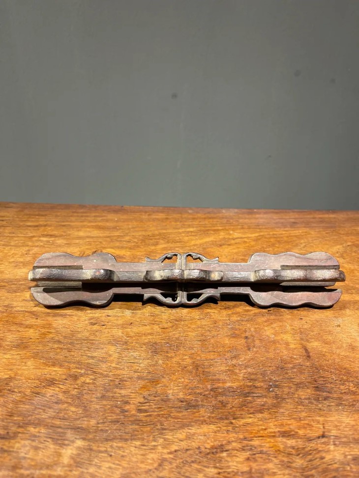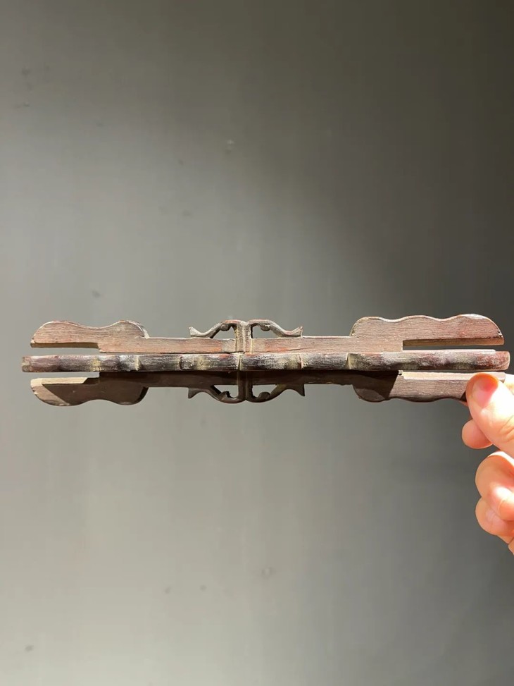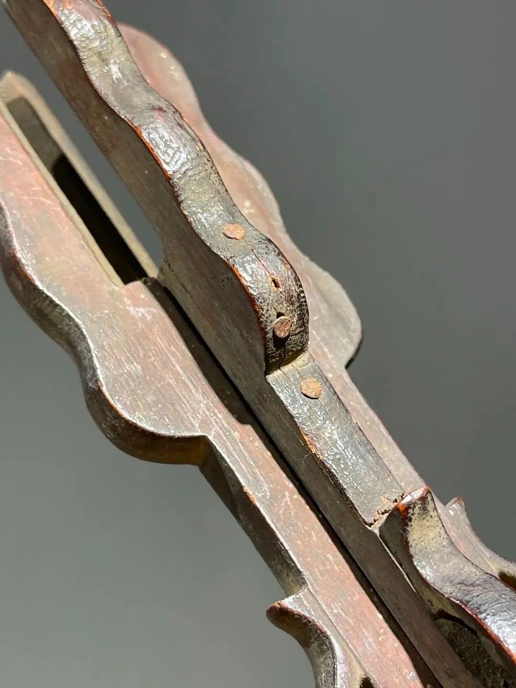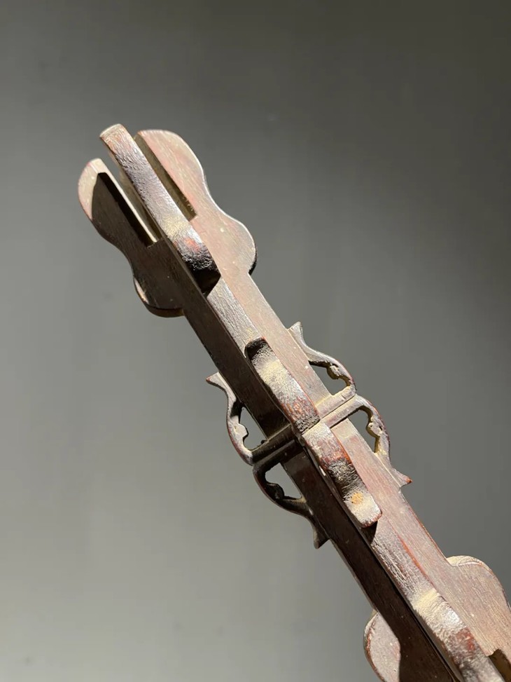 这是一件以质地坚硬比重高的楠木雕琢组装而成的密宗手持金刚杵,藏传密宗法器大多是以金属为材质,此件楠木金刚杵非常少见,整体造型特殊,片状成型后隼卯组合而成,线条简约独具一格,表面髹漆,整体风格简约大气,是清代遗留下来的密宗法器。