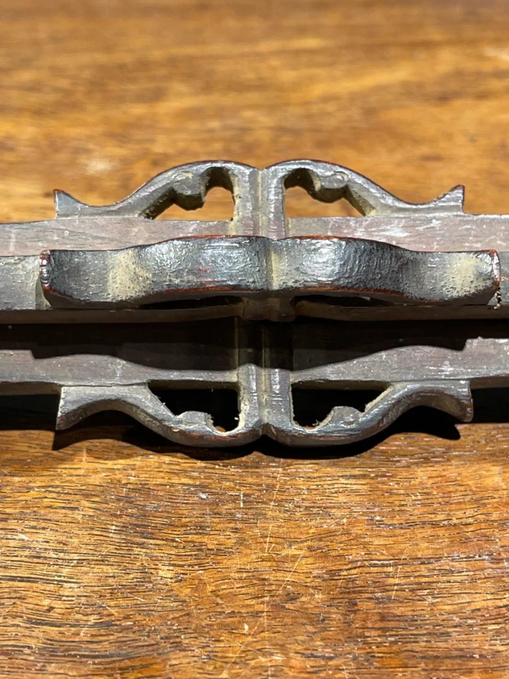 此件楠木雕密宗手持金刚杵材质特殊,形式简约大气,老楠木髹漆表面斑驳,木质坚硬皮壳温润,造型简约典雅、尺寸不小,长逾二十三厘米,气势磅礴,上手把玩与近观令人印象深刻。是难得一见藏传佛教楠木雕密宗手持金刚杵。如图所示,此楠木金刚杵有一处老裂痕与老补钉加固,除此以外保存完好。