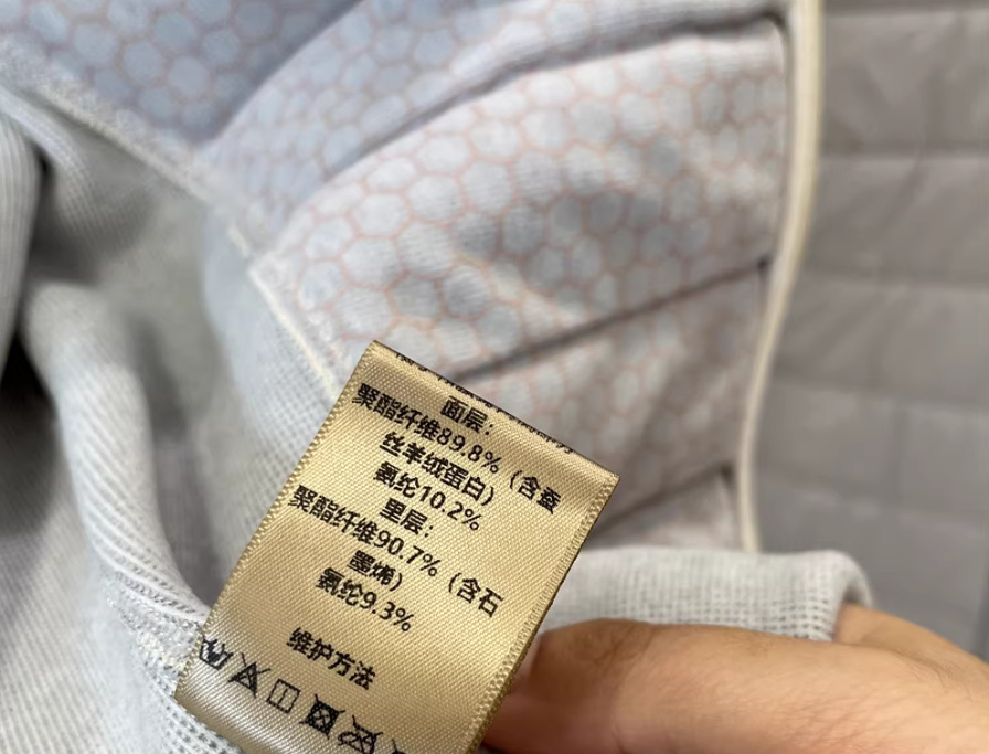 袖子和腰身部分 面层:89.8%聚酯纤维(含蚕丝羊绒蛋白)10.2%氨纶