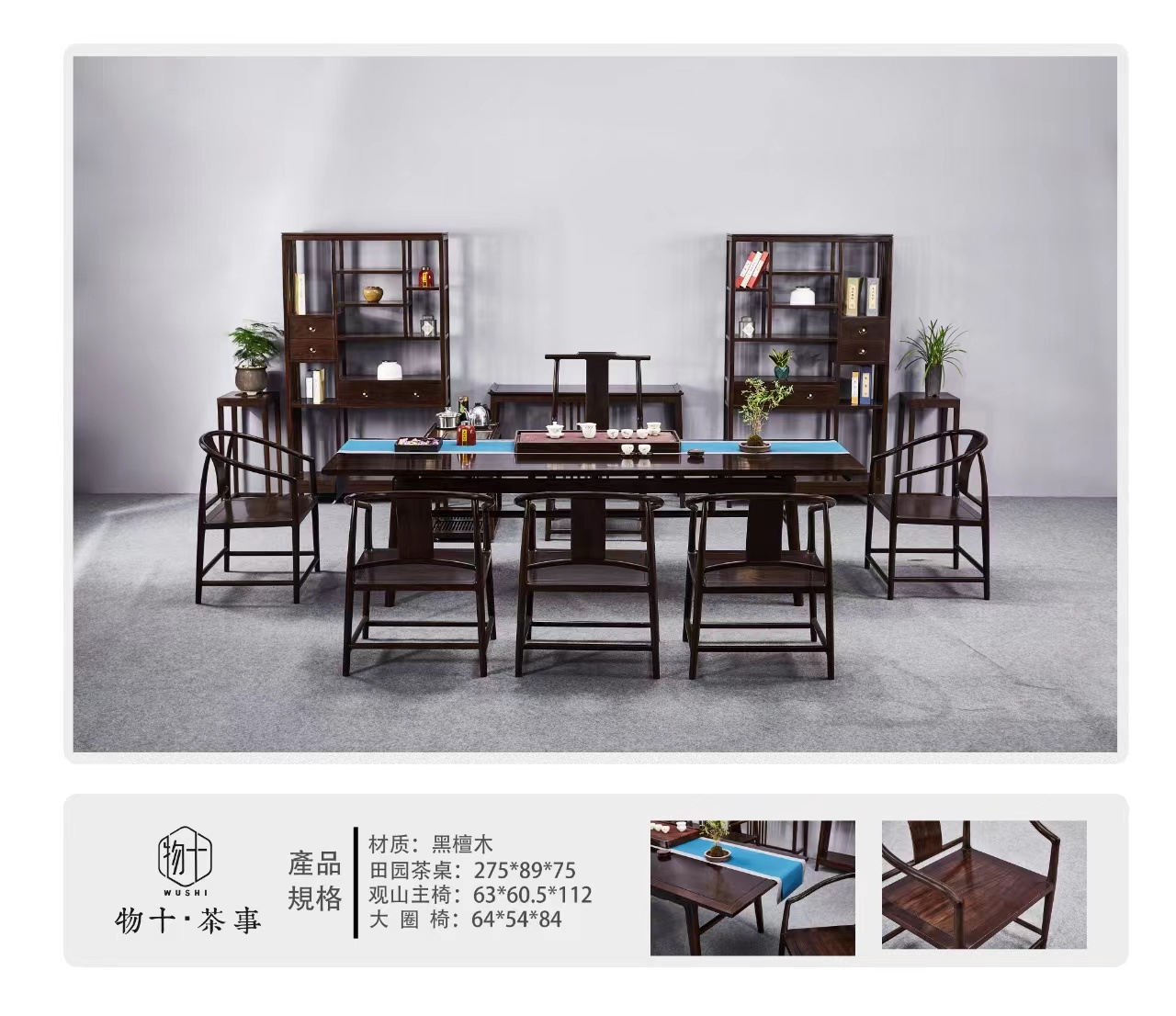 2.75米-(田园)黑檀实木六件套茶桌