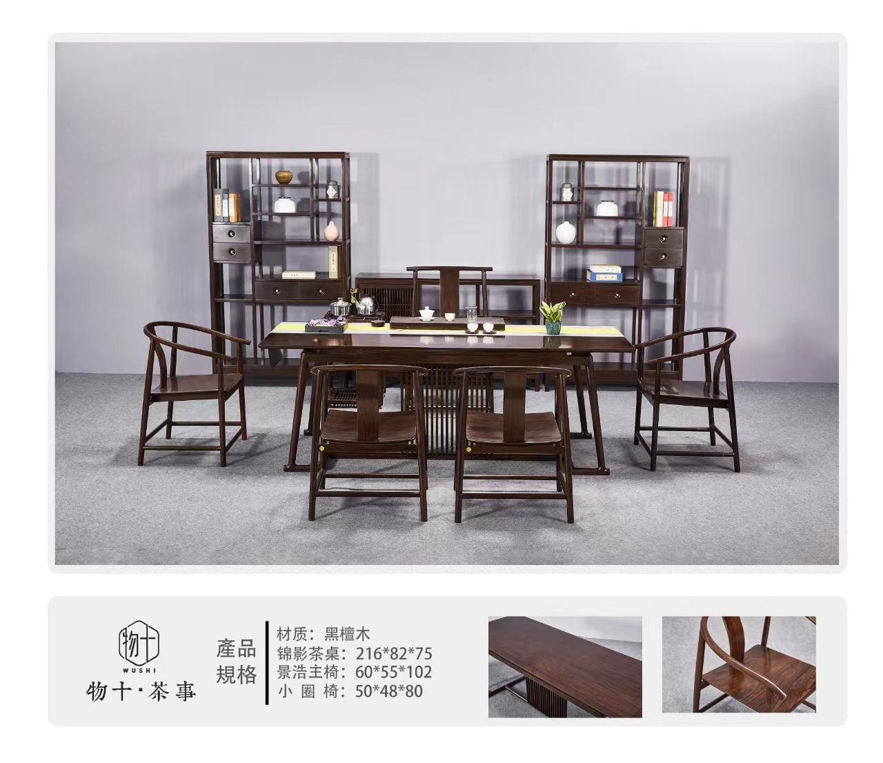 2.16米-(锦影)黑檀实木六件套茶桌
