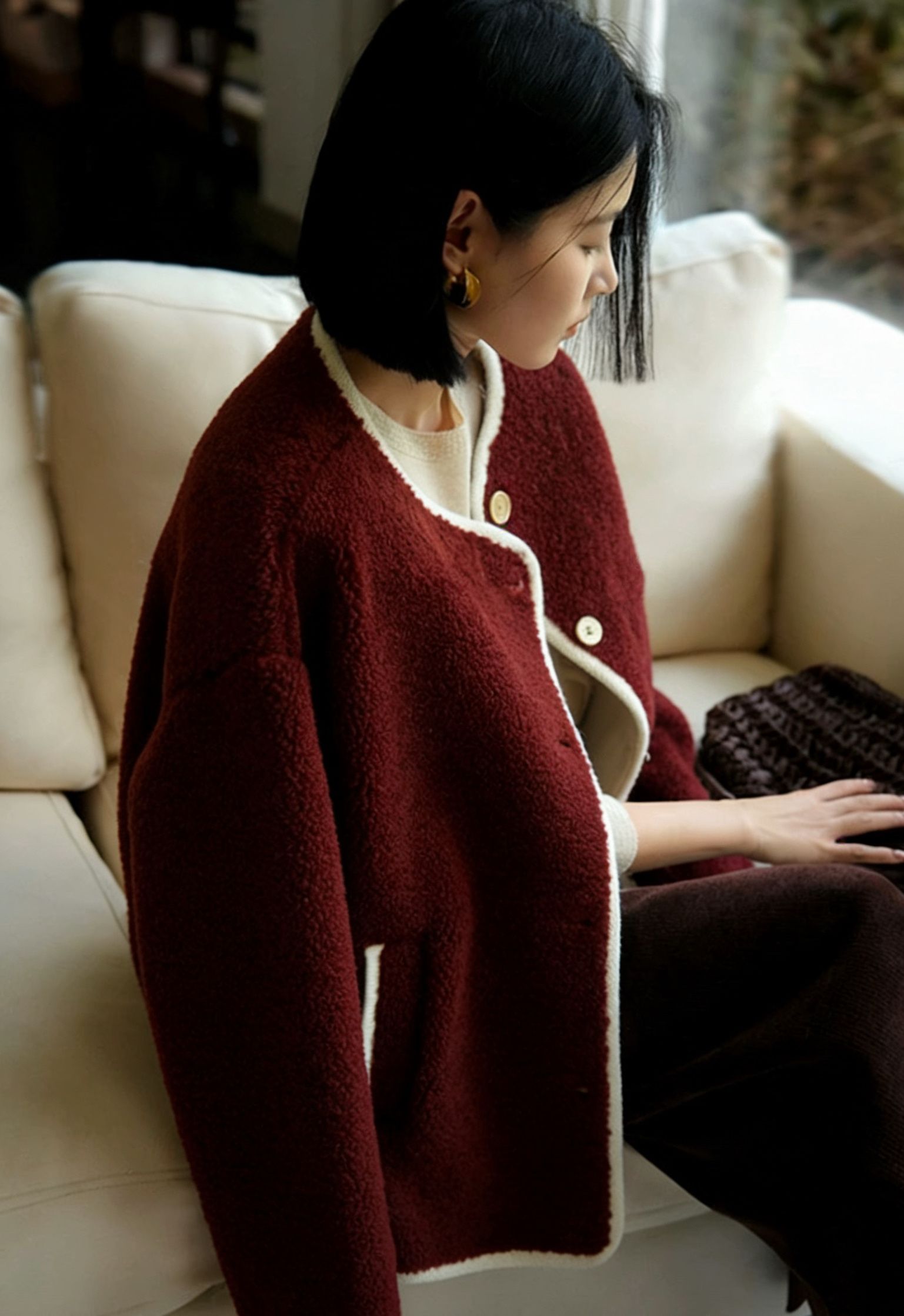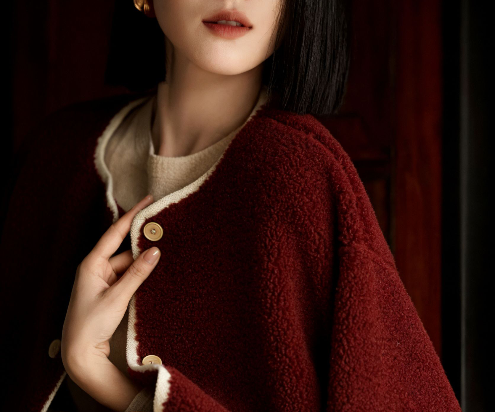 不是张扬的艳红,是揉进了绒感里的“醇厚复古红”,像浸了冬日暖意的丝绒,在暖光下泛着柔和的哑光。