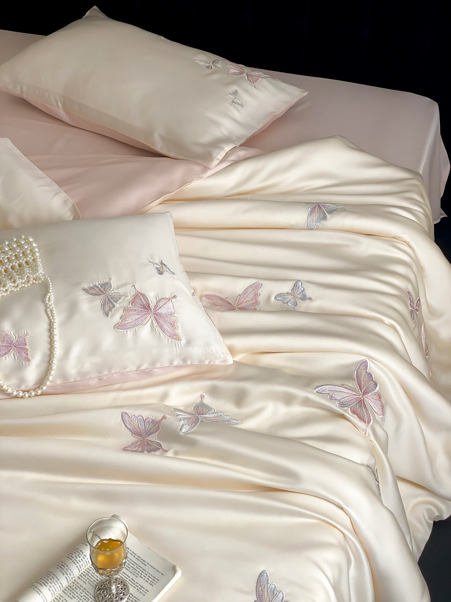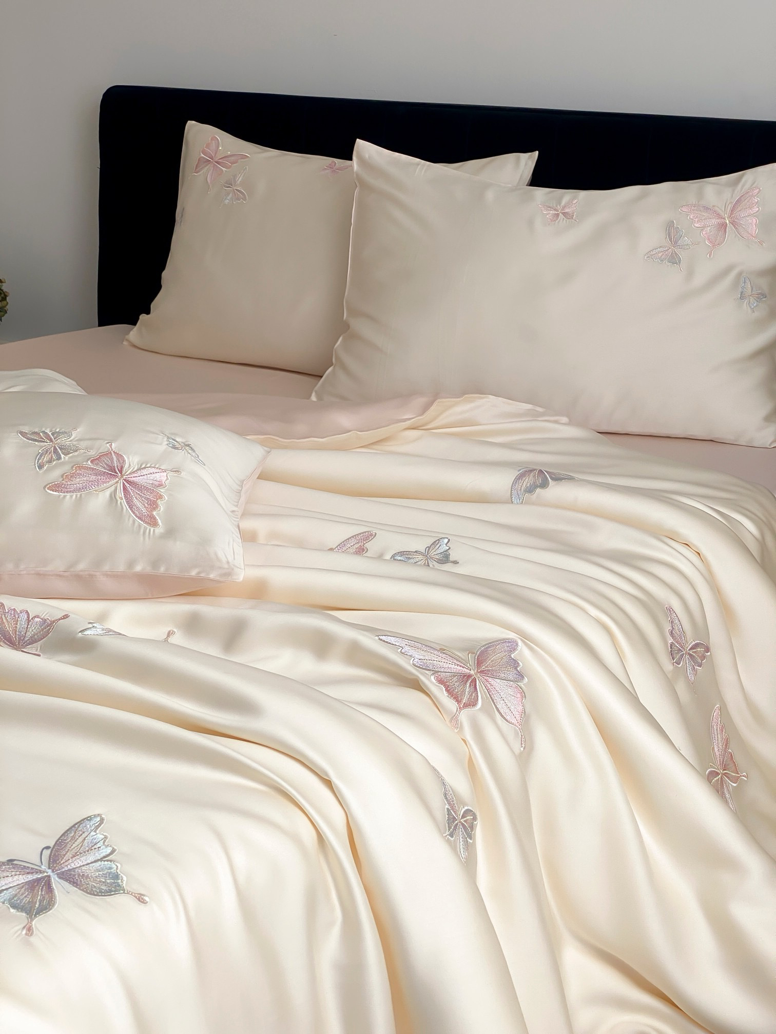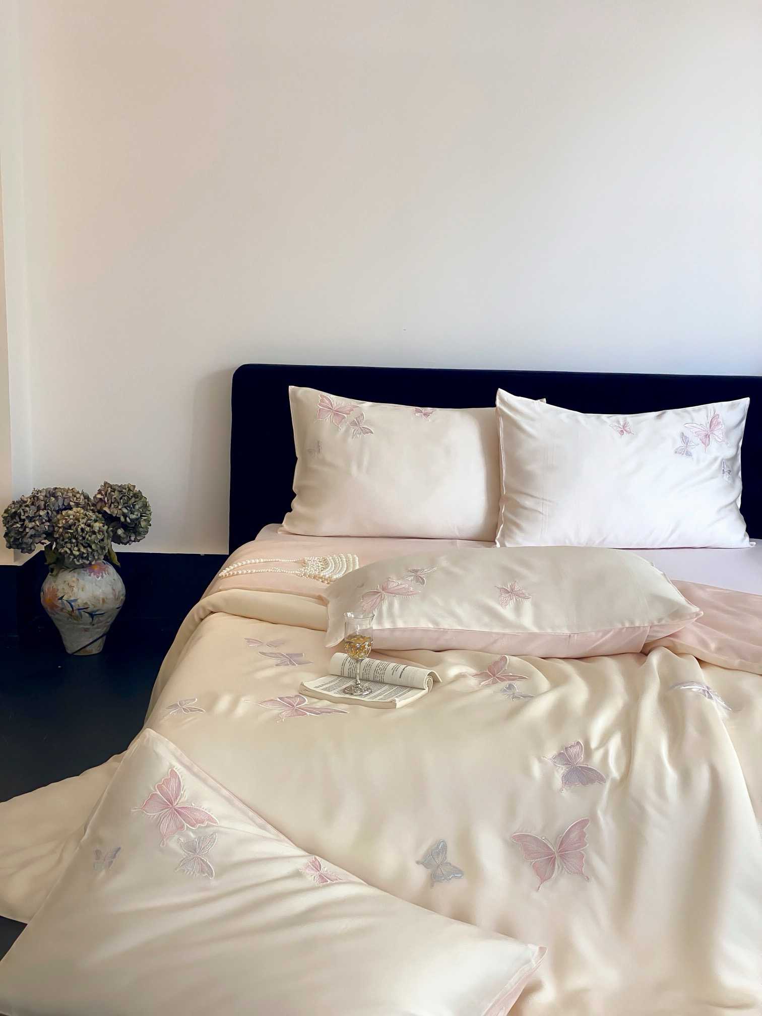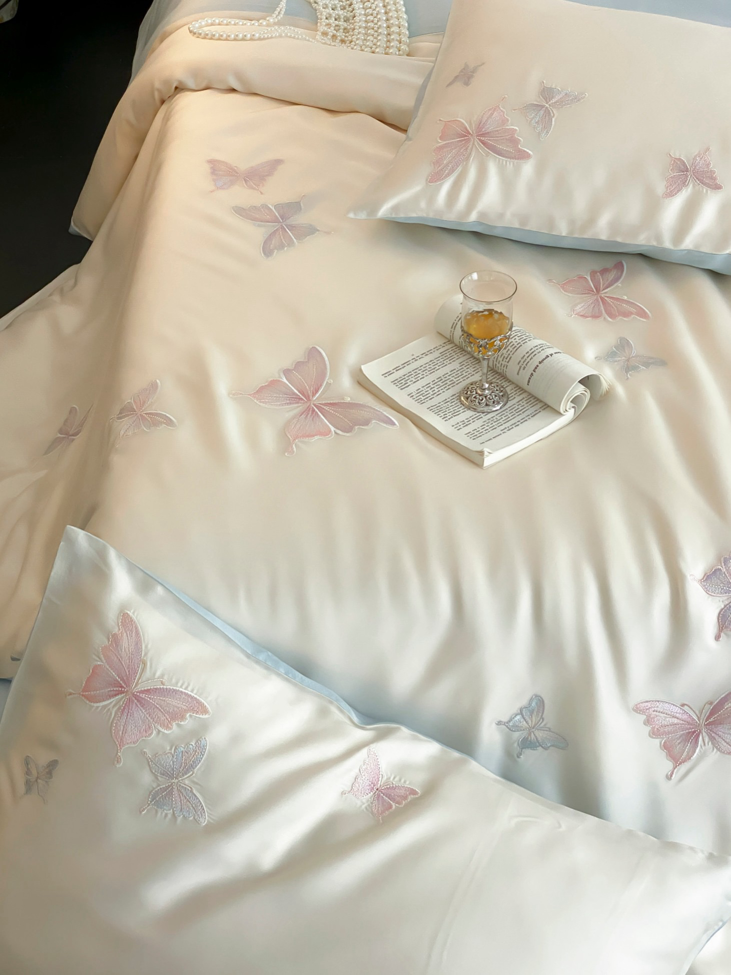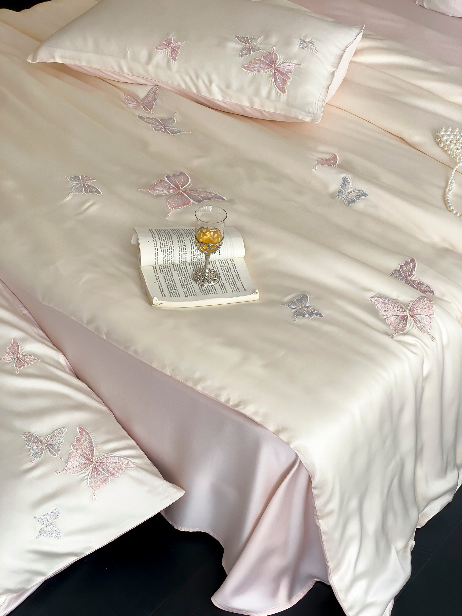 【裸感丝滑】奥地利兰精天丝四件套 精致蝴蝶刺绣 A类母婴级别 柔顺丝滑如第二层肌肤 透气控温凉爽不闷汗