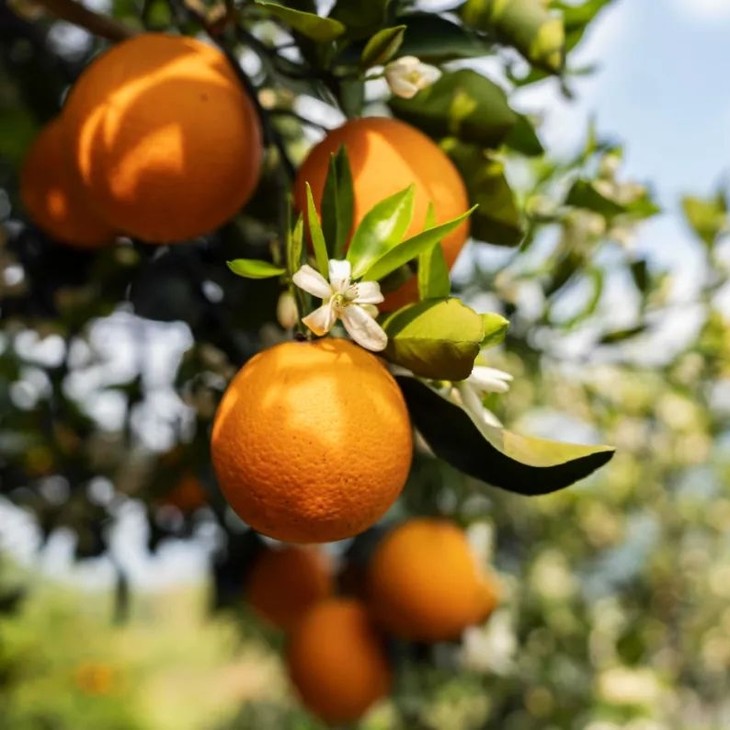 1)花果同枝,越冬而生的春季鲜橙,生长周期长。