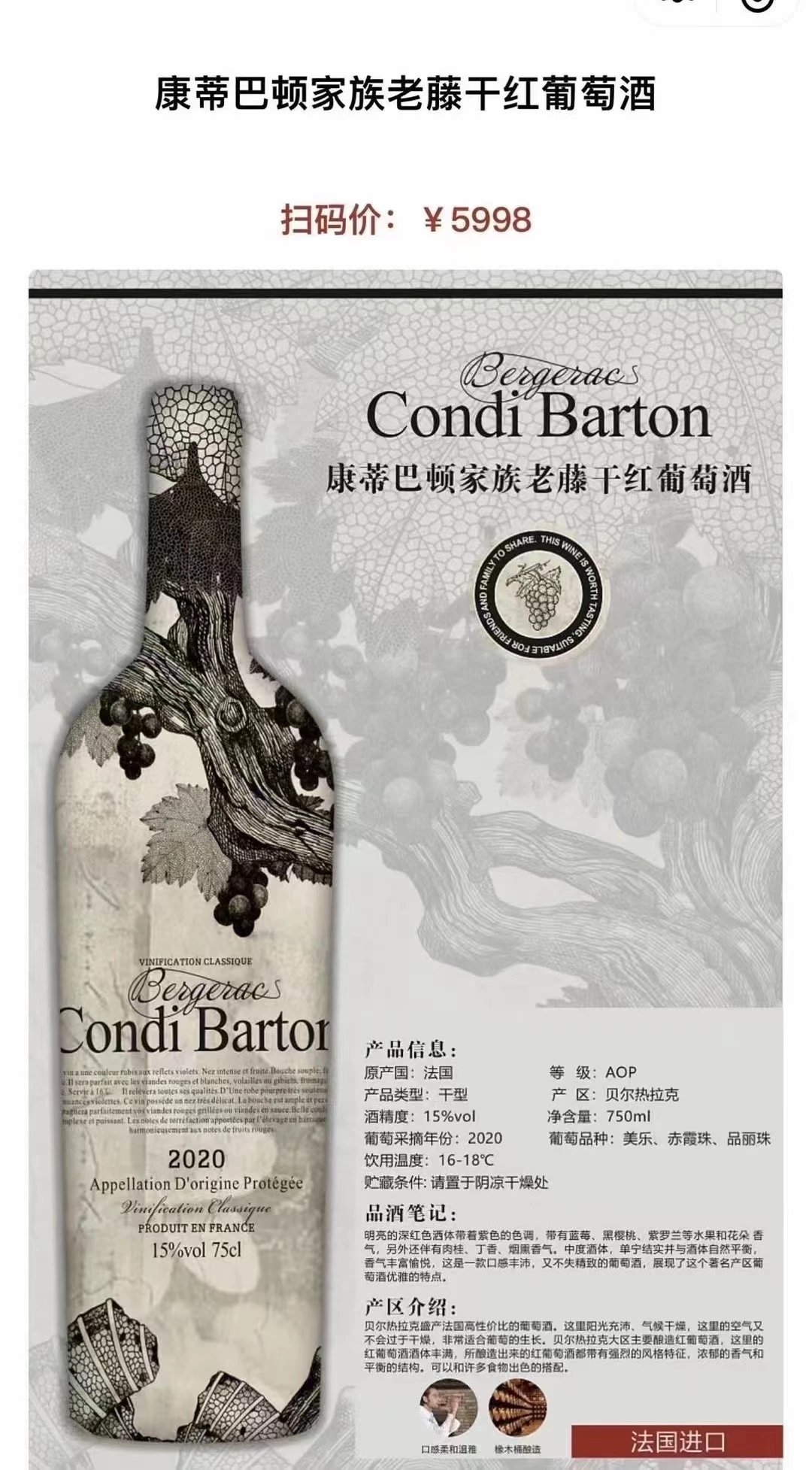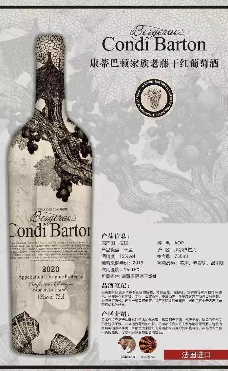 6支装!端午好礼~法国Condi Barton康蒂巴顿·*级混酿AOP级红葡萄酒750ml*6瓶】酒液呈红宝石略紫 口感平衡圆润 果味饱满 带有浓郁果香 层次超级丰富礼盒装