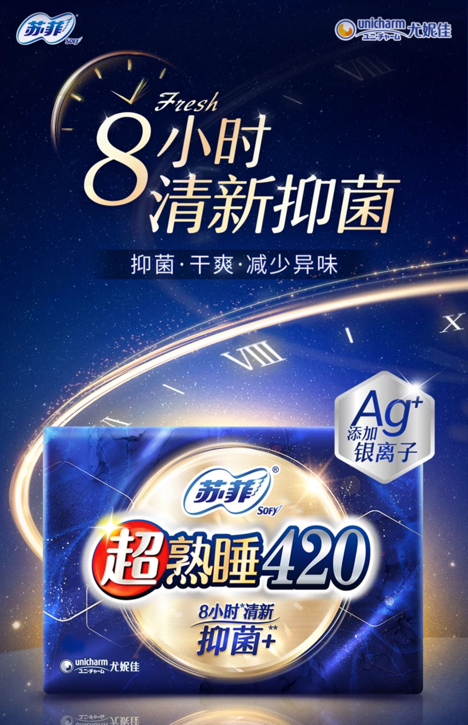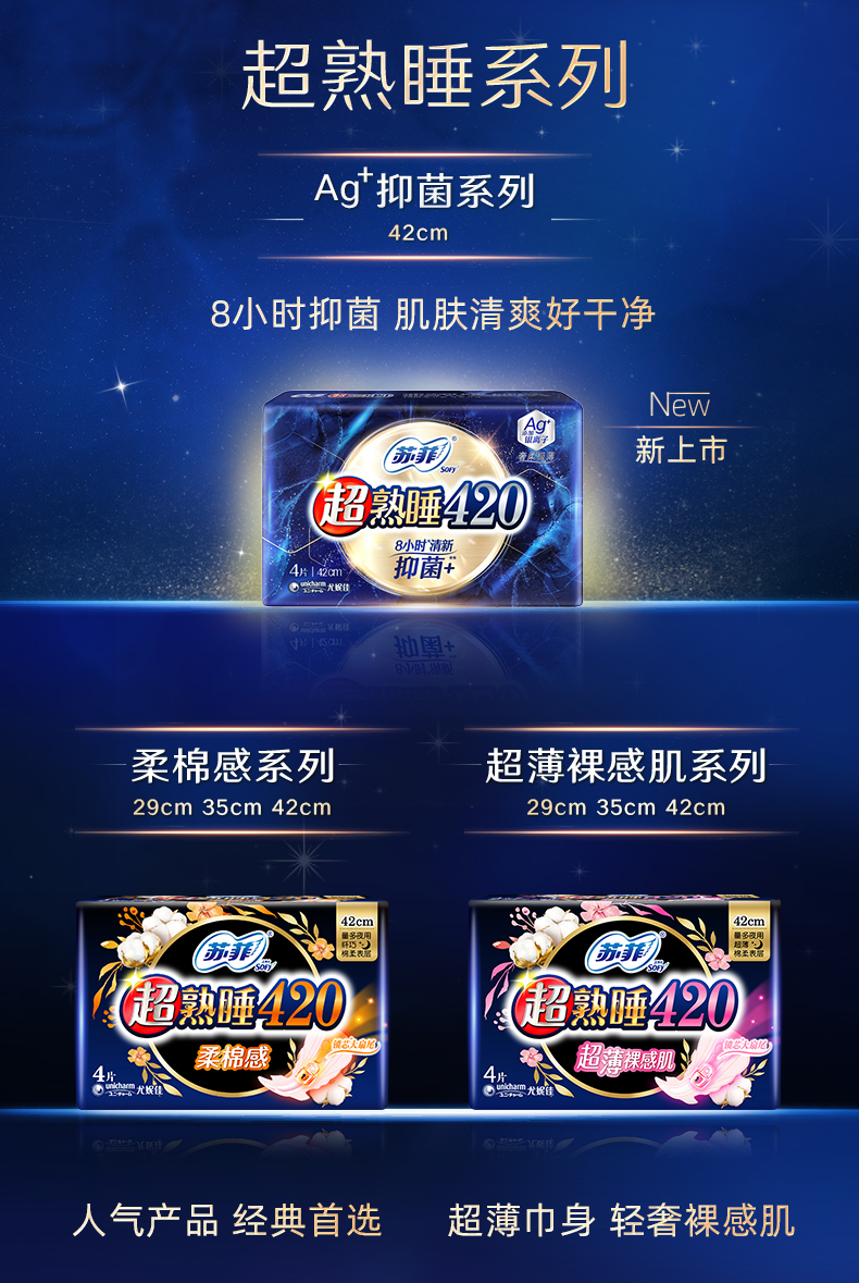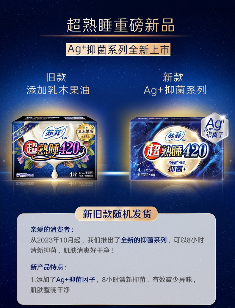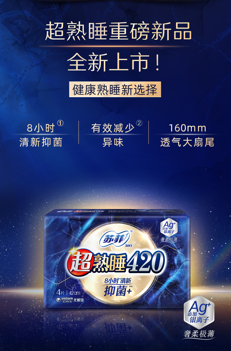 苏菲卫生巾超熟睡夜用420mm抑菌AG+银离子绵柔姨妈巾4片/包