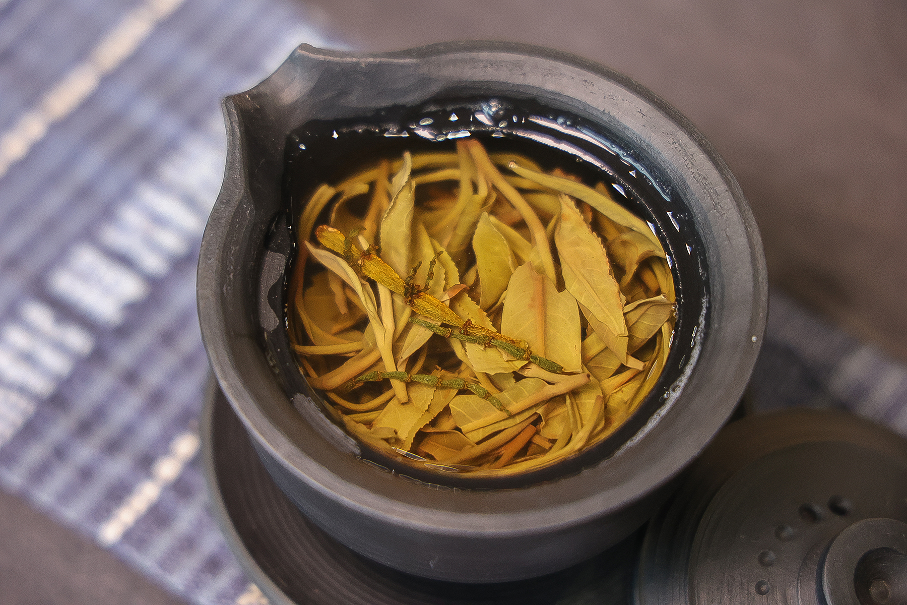 冲泡出的汤色黄绿透亮。鲜饮有浓郁的特殊清香,陈化后有股药香味儿。