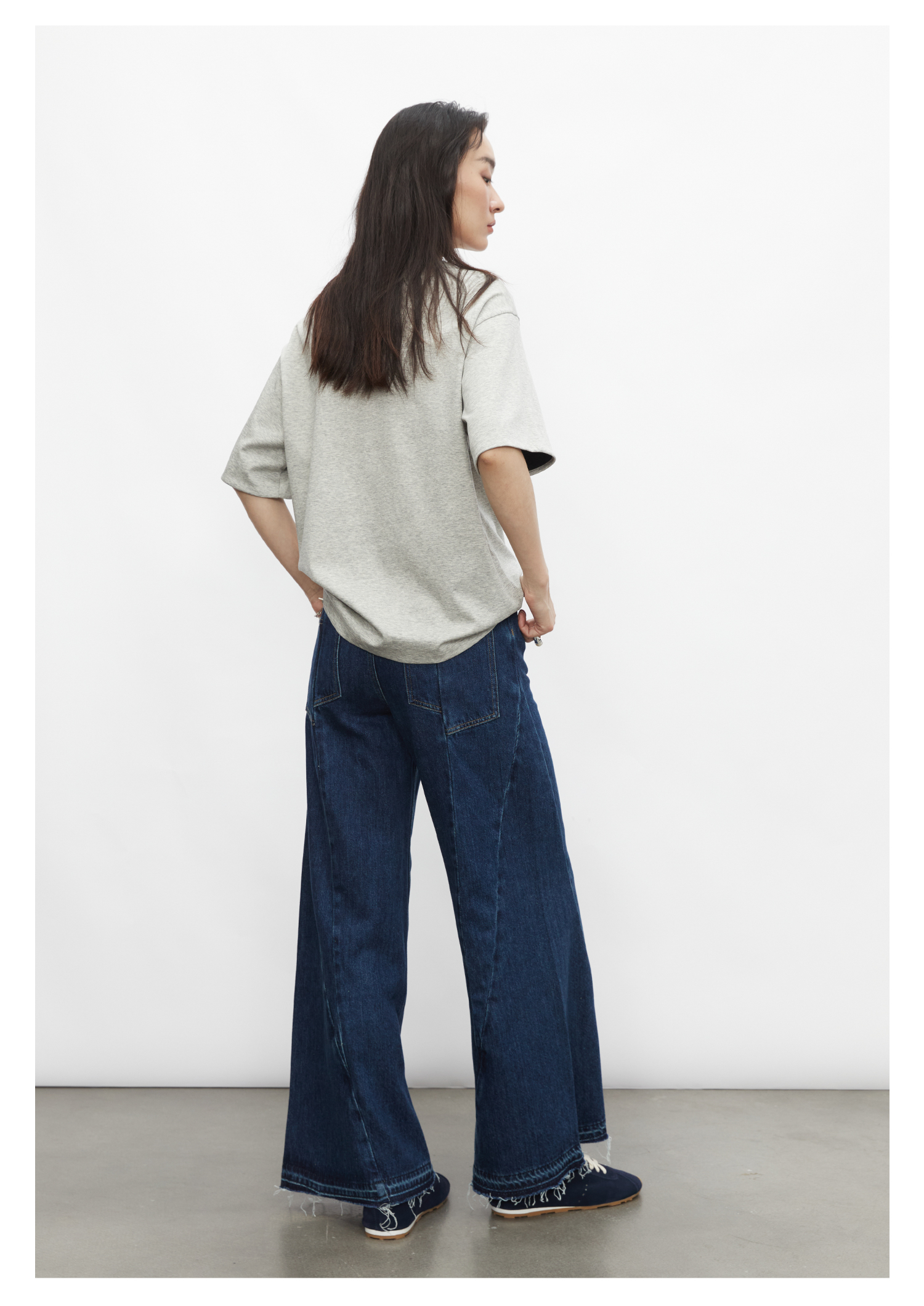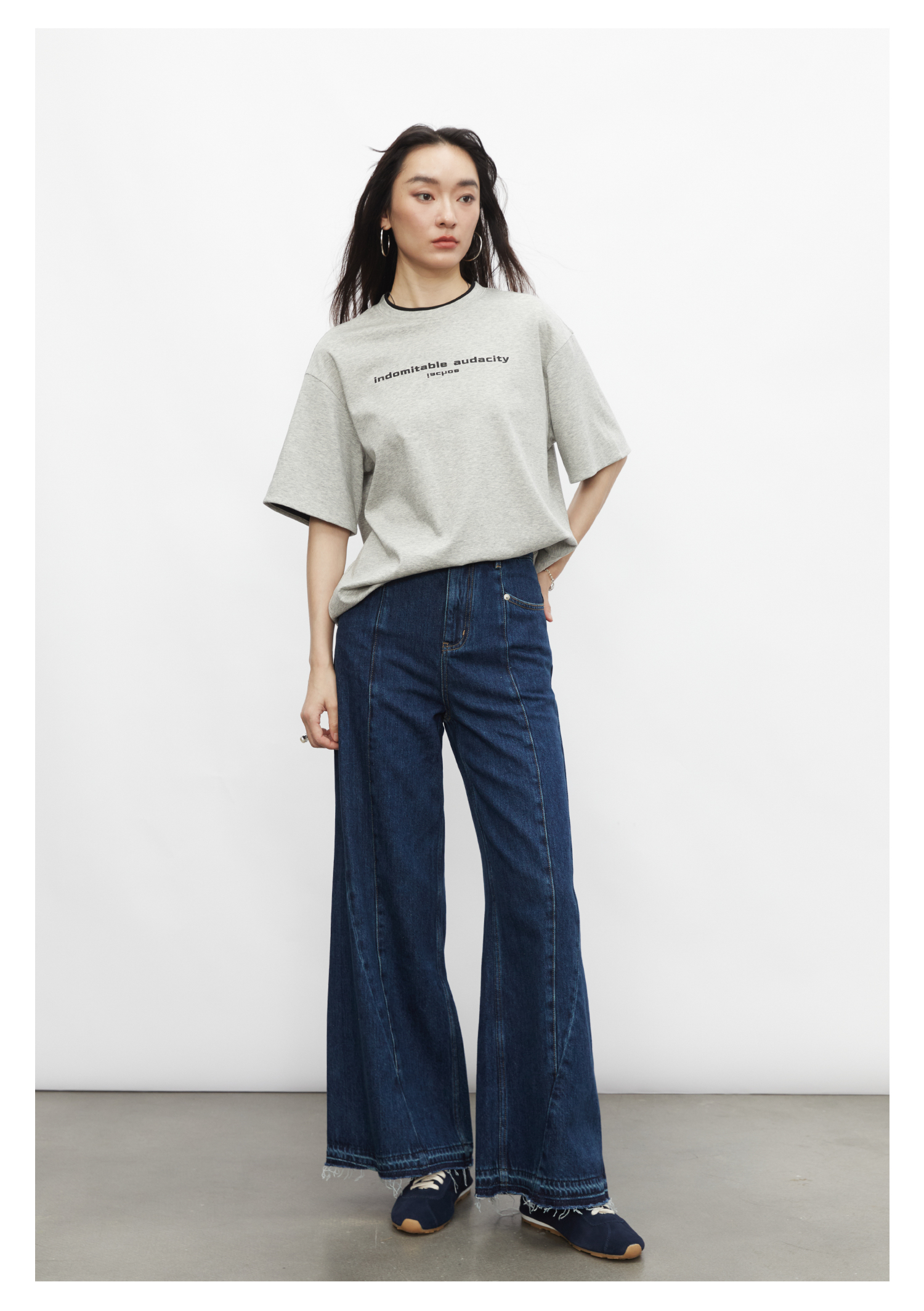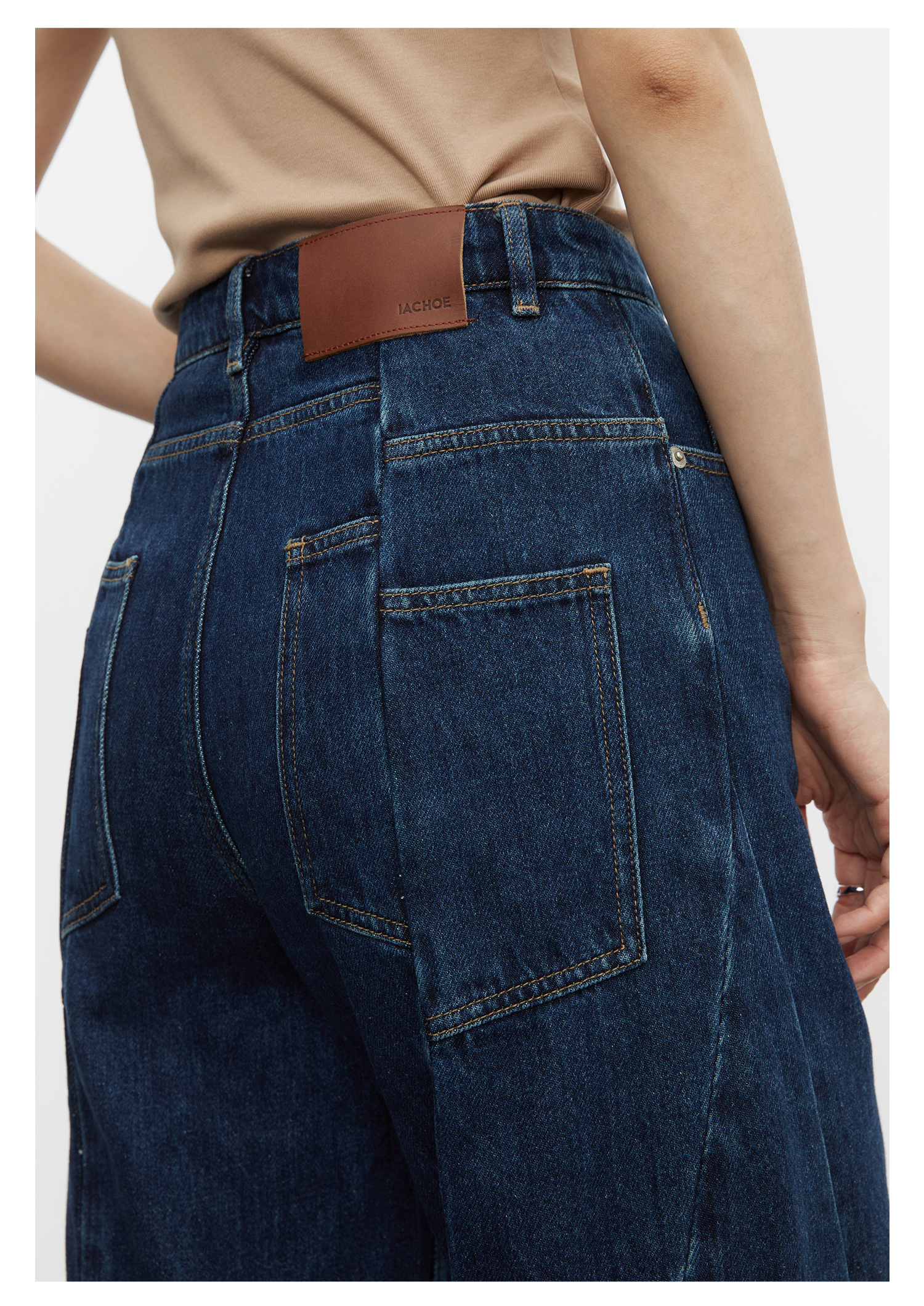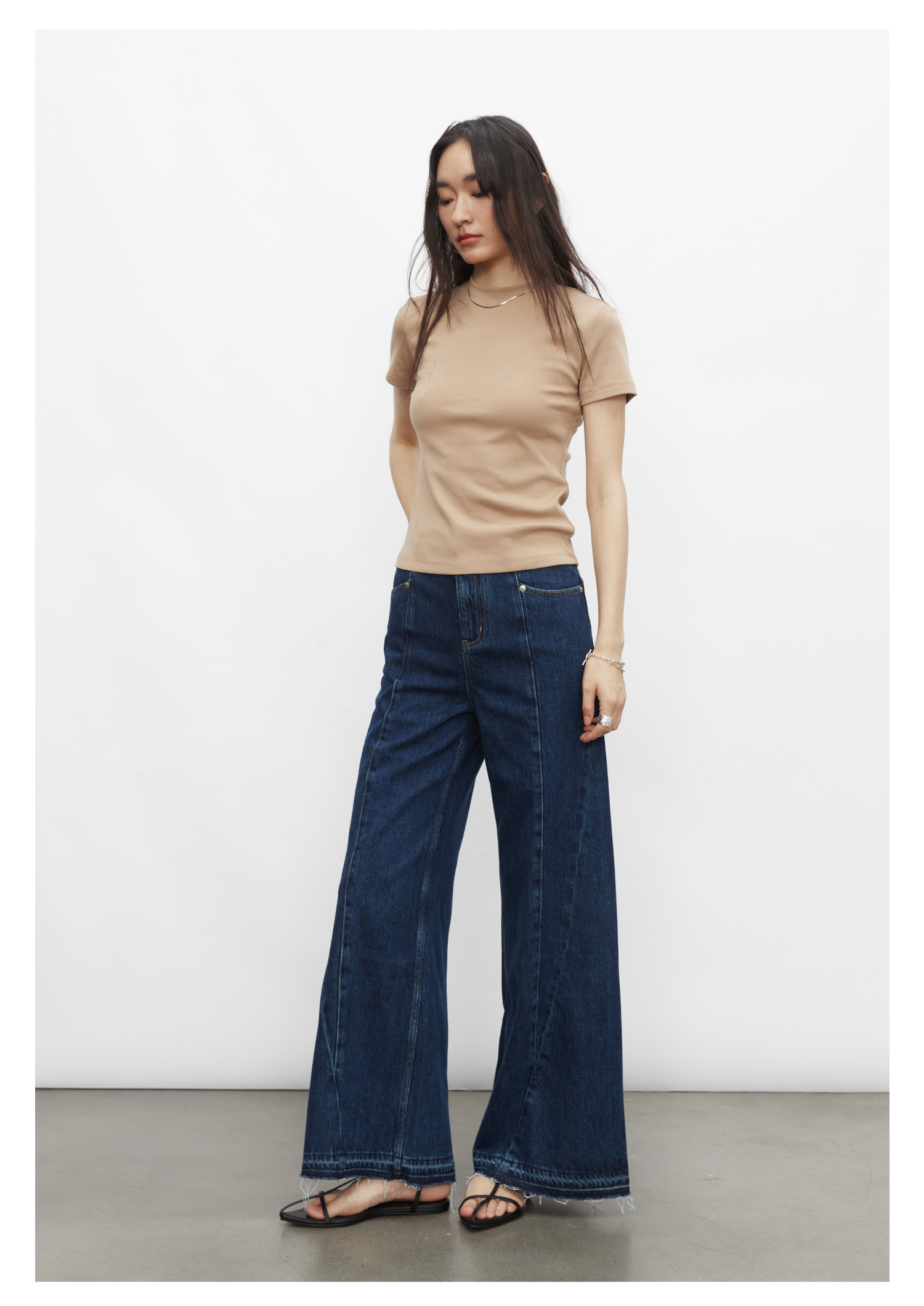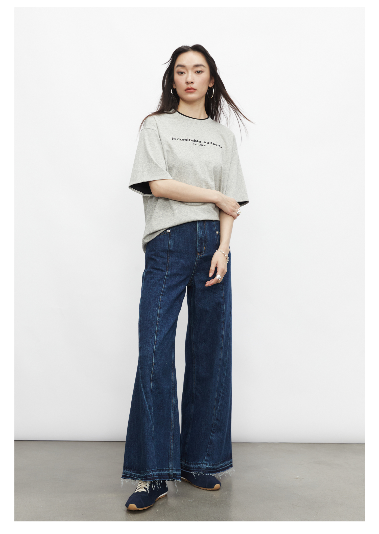 棉仓3521519006-分割切线重设计感牛仔喇叭裤 复古宽松高腰牛仔阔腿裤女