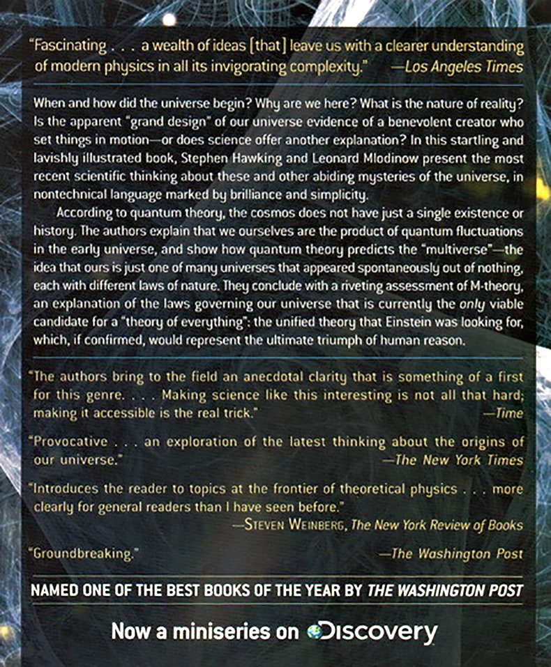 Chapter 1 We each exist for but a short time, and in that time explore but a small part of the whole universe. But humans are a curious species. We wonder, we seek answers. Living in this vast world that is by turns kind and cruel, and gazing at the immense heavens above, people have always asked a multitude of questions: How can we understand the world in which we find ourselves? How does the universe behave? What is the nature of reality? Where did all this come from? Did the universe need a creator? Most of us do not spend most of our time worrying about these questions, but almost all of us worry about them some of the time. Traditionally these are questions for philosophy, but philosophy is dead. Philosophy has not kept up with modern developments in science, particularly physics. Scientists have become the bearers of the torch of discovery in our quest for knowledge. The purpose of this book is to give the answers that are suggested by recent discoveries and theoretical advances. They lead us to a new picture of the universe and our place in it that is very different from the traditional one, and different even from the picture we might have painted just a decade or two ago. Still, the first sketches of the new concept can be traced back almost a century. According to the traditional conception of the universe, objects move on well-defined paths and have definite histories. We can specify their precise position at each moment in time. Although that account is successful enough for everyday purposes, it was found in the 1920s that this “classical” picture could not account for the seemingly bizarre behavior observed on the atomic and subatomic scales of existence. Instead it was necessary to adopt a different framework, called quantum physics. Quantum theories have turned out to be remarkably accurate at predicting events on those scales, while also reproducing the predictions of the old classical theories when applied to the macroscopic world of daily life. But quantum and classical physics are based on very different conceptions of physical reality. Quantum theories can be formulated in many different ways, but what is probably the most intuitive description was given by Richard (Dick) Feynman, a colorful character who worked at the California Institute of Technology and played the bongo drums at a strip joint down the road. According to Feynman, a system has not just one history but every possible history. As we seek our answers, we will explain Feynman's approach in detail, and employ it to explore the idea that the universe itself has no single history, nor even an independent existence. That seems like a radical idea, even to many physicists. Indeed, like many notions in today's science, it appears to violate common sense. But common sense is based upon everyday experience, not upon the universe as it is revealed through the marvels of technologies such as those that allow us to gaze deep into the atom or back to the early universe. Until the advent of modern physics it was generally thought that all knowledge of the world could be obtained through direct observation, that things are what they seem, as perceived through our senses. But the spectacular success of modern physics, which is based upon concepts such as Feynman's that clash with everyday experience, has shown that that is not the case. The naive view of reality therefore is not compatible with modern physics. To deal with such paradoxes we shall adopt an approach that we call model-dependent realism. It is based on the idea that our brains interpret the input from our sensory organs by making a model of the world. When such a model is successful at explaining events, we tend to attribute to it, and to the elements and concepts that constitute it, the quality of reality or absolute truth. But there may be different ways in which one could model the same physical situation, with each employing different fundamental elements and concepts. If two such physical theories or models accurately predict the same events, one cannot be said to be more real than the other; rather, we are free to use whichever model is most convenient. In the history of science we have discovered a sequence of better and better theories or models, from Plato to the classical theory of Newton to modern quantum theories. It is natural to ask: Will this sequence eventually reach an end point, an ultimate theory of the universe, that will include all forces and predict every observation we can make, or will we continue forever finding better theories, but never one that cannot be improved upon? We do not yet have a definitive answer to this question, but we now have a candidate for the ultimate theory of everything, if indeed one exists, called M-theory. M-theory is the only model that has all the properties we think the final theory ought to have, and it is the theory upon which much of our later discussion is based.
