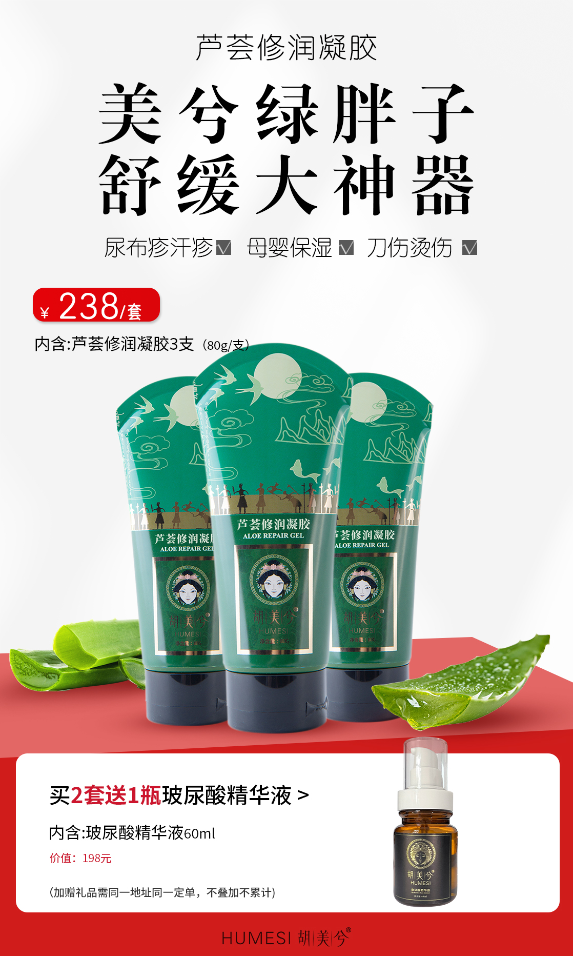 3支装百万爆品|芦荟修润凝胶80g/支|老少咸宜护肤防晒防蚊虫|礼品加赠