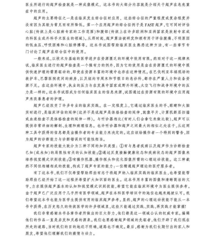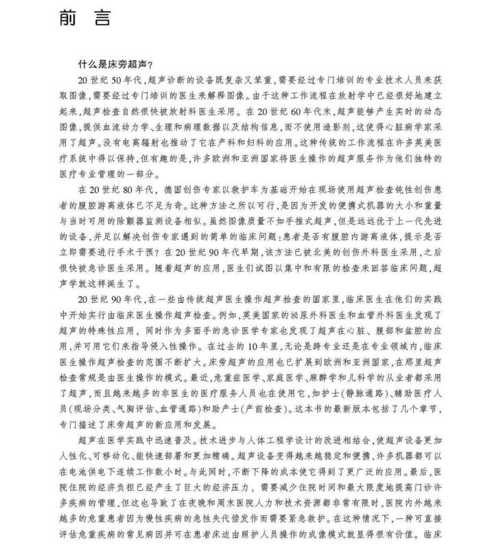急危重症救治的关键是临床医师能够快速准确地评估患者的情况,继而立即采取相应的有效措施,但多数影像检查必须将患者转运到放射科而有潜在的危险及射线暴露,而且短时间内反复检查的可操作性差。因此,急危重症患者的临床救治迫切需要一种简单、方便、安全、有效而易于反复进行的床旁评估手段。床旁超声就是在这样的环境下应运而生的。《急诊床旁超声》内容涵盖面广,包含了胸部、腹部、四肢的超声扫描,以及儿科评估、床旁超声的实际操作方法和疾病处理方法、不同环境下床旁超声的应用等内容,并配有大量的影像图片和在线视频帮助读者深入了解相关内容,能够帮助读者掌握具体的实践技巧和注意事项,特别是多个章节最后的“经验与不足”模块,可有效帮助总结经验和避雷操作陷阱。本书对于经验丰富的临床医生来说,在应对复杂病例时可获得新的思路;对相关专业的医学生来说,是一本很有价值的指南参考书。这是一本为所有对床旁超声感兴趣的人写的,急诊科医生、危重症科医生、超声医生、普通外科医生及相关医学生都可从中获益。