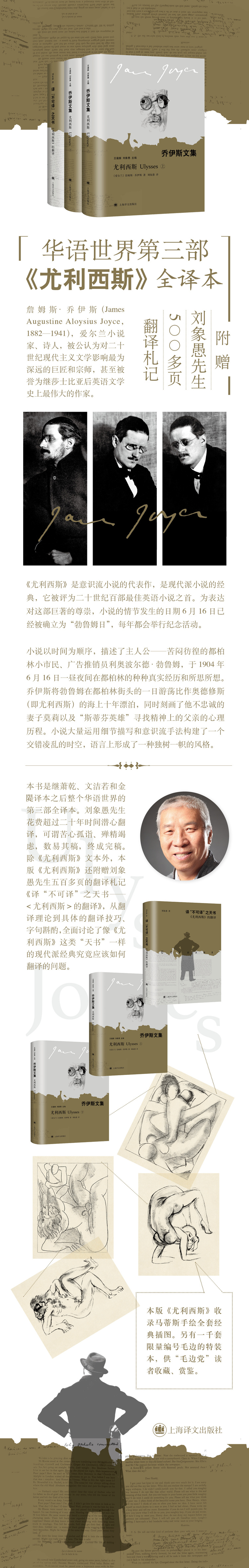本书是继萧乾、文洁若和金隄译本之后整个华语世界的第三部全译本。刘象愚先生花费超过二十年时间潜心翻译,可谓苦心孤诣、殚精竭虑,数易其稿,终成完稿。除《尤利西斯》文本外,本版《尤利西斯》附赠刘象愚先生五百多页的翻译札记《译“不可译”之天书——<尤利西斯>的翻译》,从翻译理论到具体的翻译技巧、字句斟酌,全面讨论了像《尤利西斯》这类“天书”一样的现代派经典究竟应该如何翻译的问题。