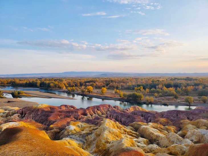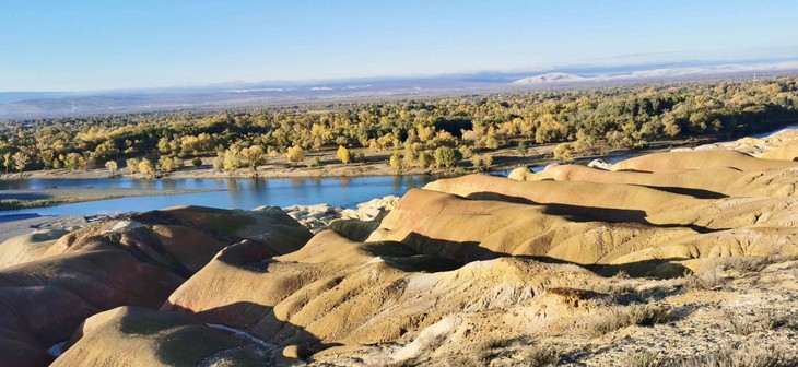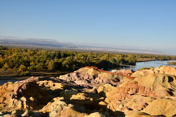 五彩滩雅丹地貌,观赏一河隔两岸,两岸不重天的特有景观;可以前往观景台俯瞰额尔齐斯河的秀丽风光,额尔齐斯河,吊桥,牧归的羊群,黄昏的五彩滩景色迷人。