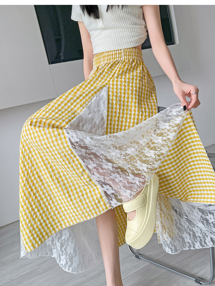 【-5℃直降❗蓝色格子半身裙】简约松紧高腰,修饰腰腹线条,蕾丝拼接更有层次,视觉拉长腿长,显瘦百搭不挑腿型,夏季2025新款蕾丝拼接高腰垂感a字长款大摆伞裙QQ