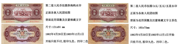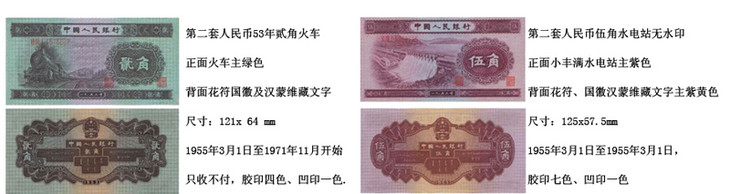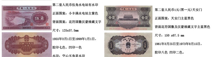 1955年3月1日公布发行第二套人民币共11种,当天发行1分、2分、3分、1角、2角、5角、1元、2元、3元和5元10种,1957年12月1日又发行10元券1种。同时,为便于流通,国务院发布发行金属分币的命令,自1957年12月1日起发行1分、2分、5分三种金属分币(简称硬分币),与纸分币等值,混合流通。后来,对1元券和5元券的图案、花纹又分别进行了调整和更换颜色,于1961年3月25日和1962年4月20日分别发行了黑色1元券和棕色5元券,使第二套人民币的版别由开始公布的11种增加到16种。1964年4月14日中国人民银行发布了《关于收回三种人民币票券的通告》,决定从1964年4月15日开始限期收回苏联代印的1953年版的3元、5元和10元券,1964年5月15日停止收兑和流通使用。