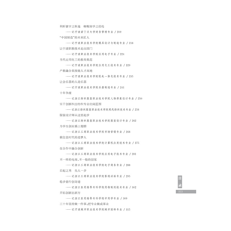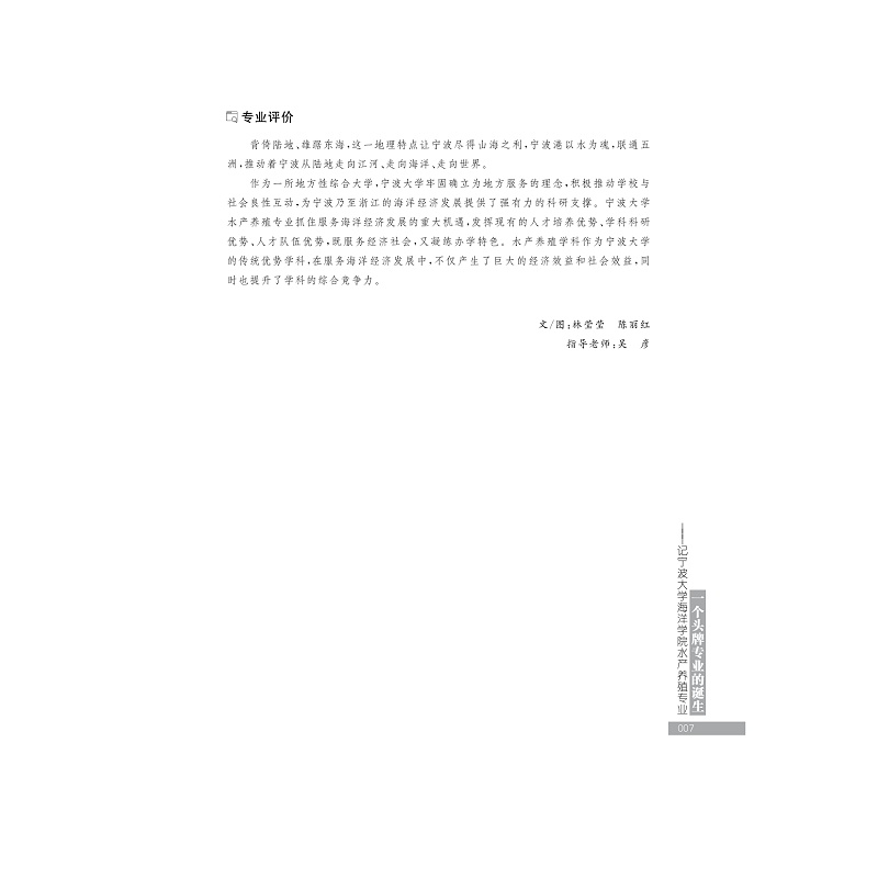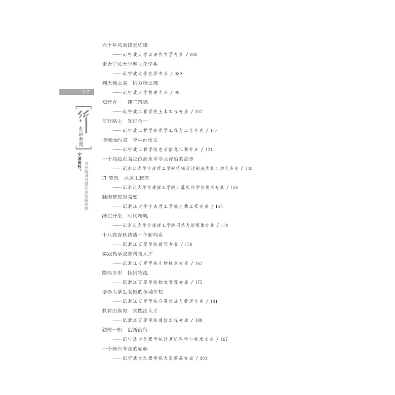 《宁波市高校专业创新建设巡礼》是浙江大学宁波理工学院传媒与设计学院推出的一个以专业为依托的大学生社会实践活动的品牌工程2017年度实践作品的结集。本书中的新闻作品全方位展示宁波市高校在专业创新建设方面的成效,以及对学生成长成才、区域产业转型升级和经济社会发展的贡献。