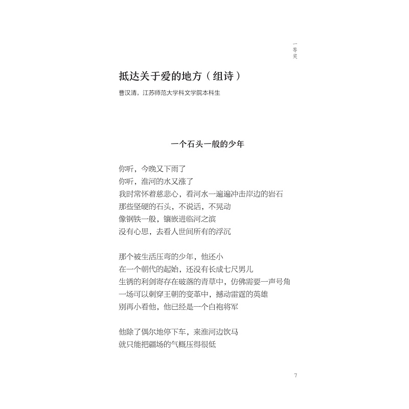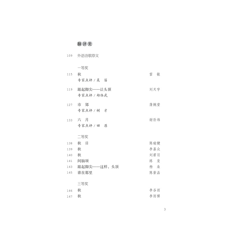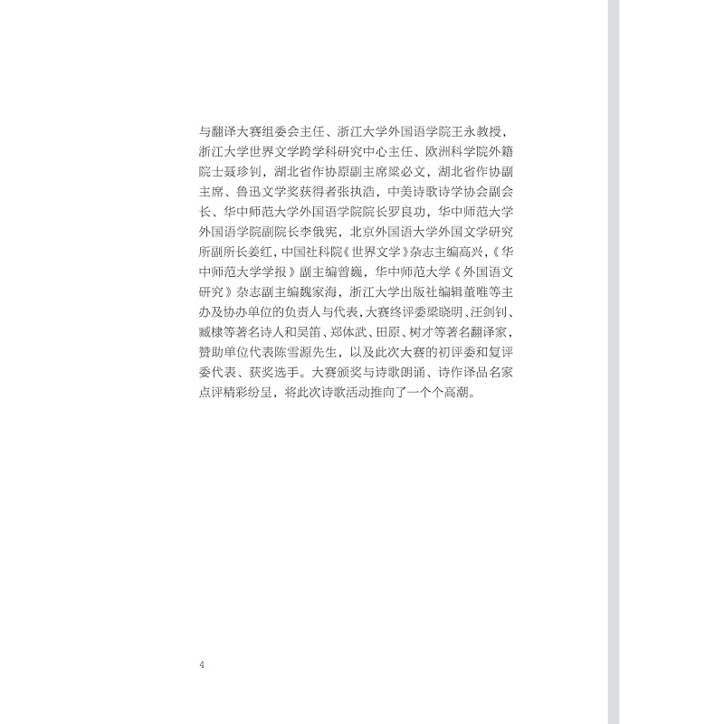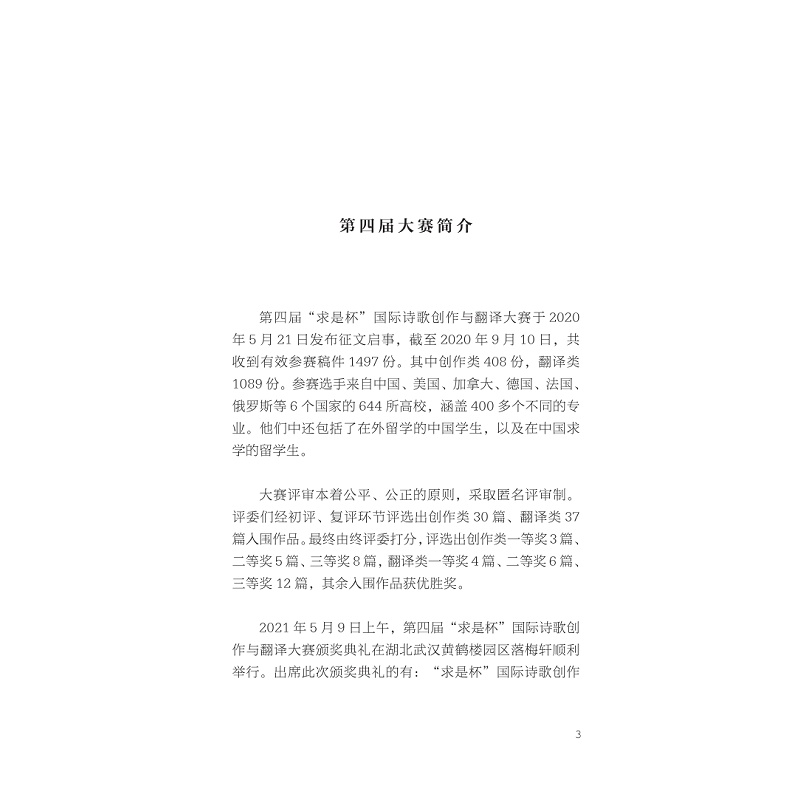 本书为“求是杯”国际诗歌创作与翻译大赛第四、五届比赛的获奖作品集,收录了来自国内外多所高校学生的优秀获奖作品,主要分为诗歌创作类与诗歌翻译类(外译中)两大部分,并收录评委精彩点评以及活动报道、彩插图片等。该大赛由浙江大学主办,评委、颁奖嘉宾包括臧棣、汪剑钊、梁晓明、吴笛、郑体武、树才、田原、高兴、刘永强、刘文飞、范晔等著名文学家、翻译家、学者。本书体现了高校学生较高的文学创作与翻译水平,有助于培养人文情怀,增进中外诗歌创作与翻译交流。
