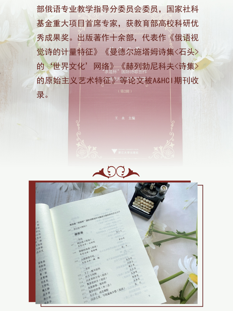 王永,浙江大学教授、博导。主要研究方向为俄罗斯诗歌、俄罗斯艺术、计量语言学。俄语专业教学指导分委员会委员,国家社科基金重大项目首席专家,获高校科研优秀成果奖。出版著作十余部,代表作《俄语视觉诗的计量特征》《曼德尔施塔姆诗集<石头>的‘世界文化’网络》《赫列勃尼科夫<诗集>的原始主义艺术特征》等论文被A&HCI期刊收录。
