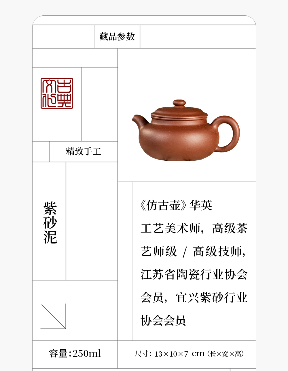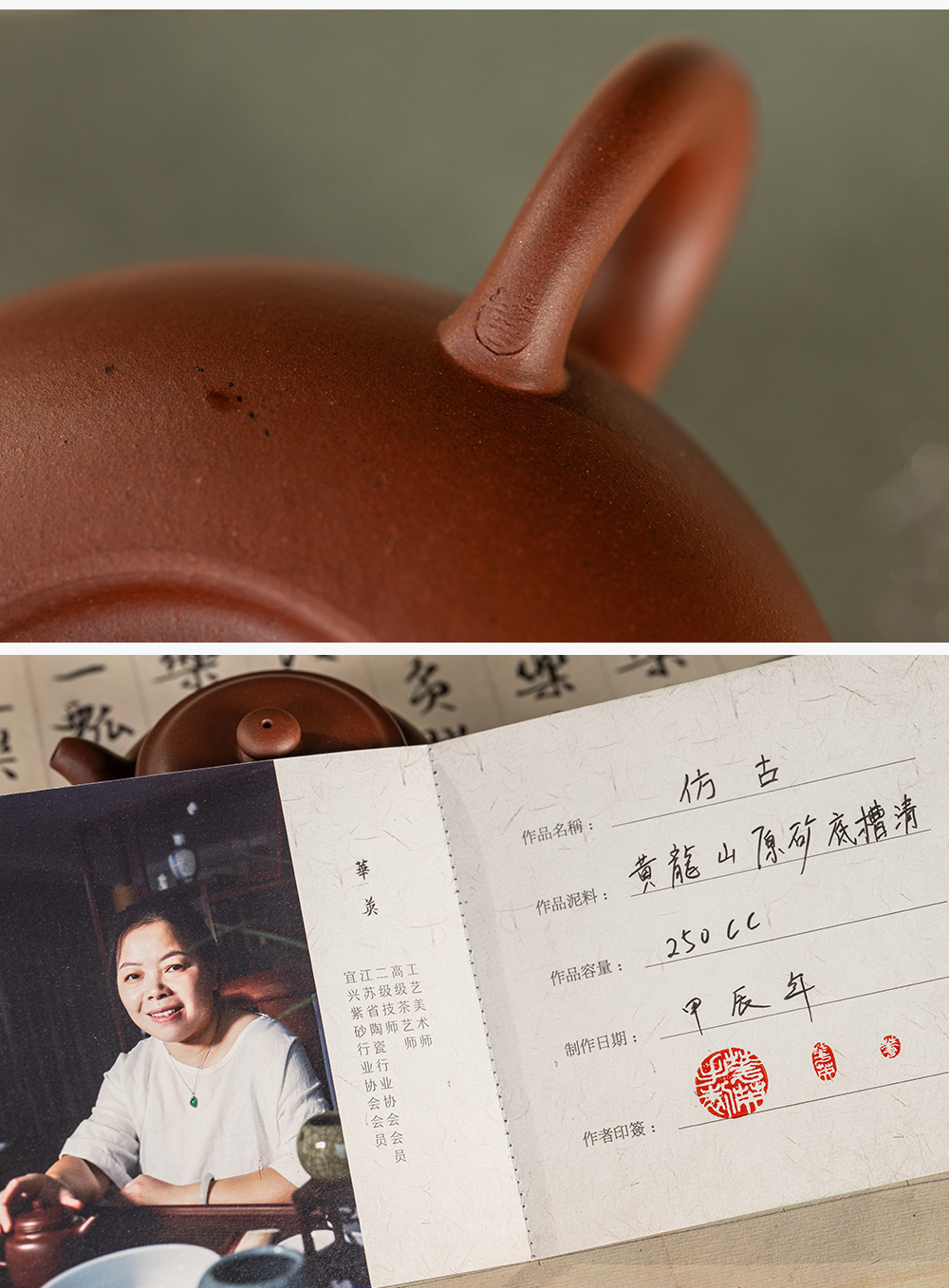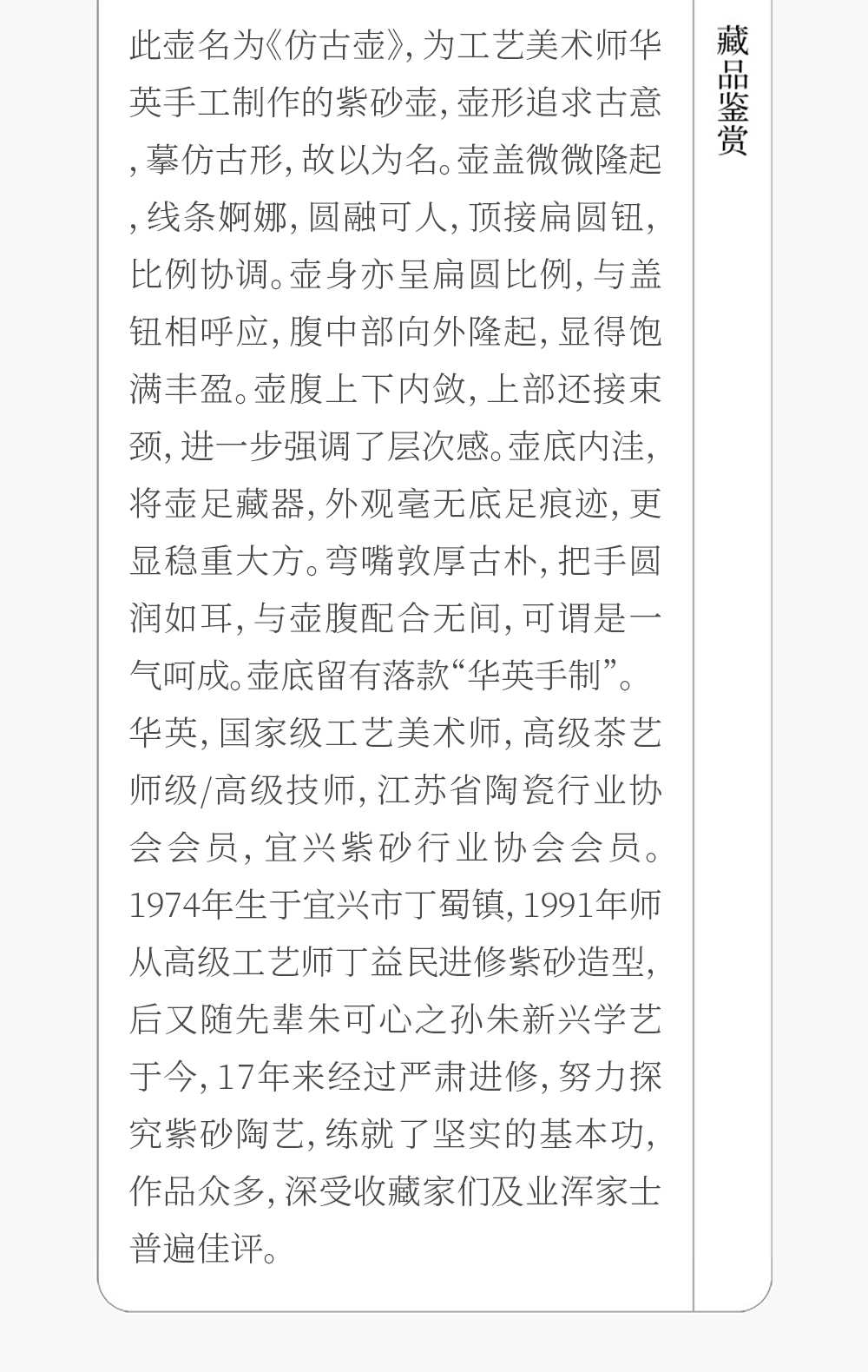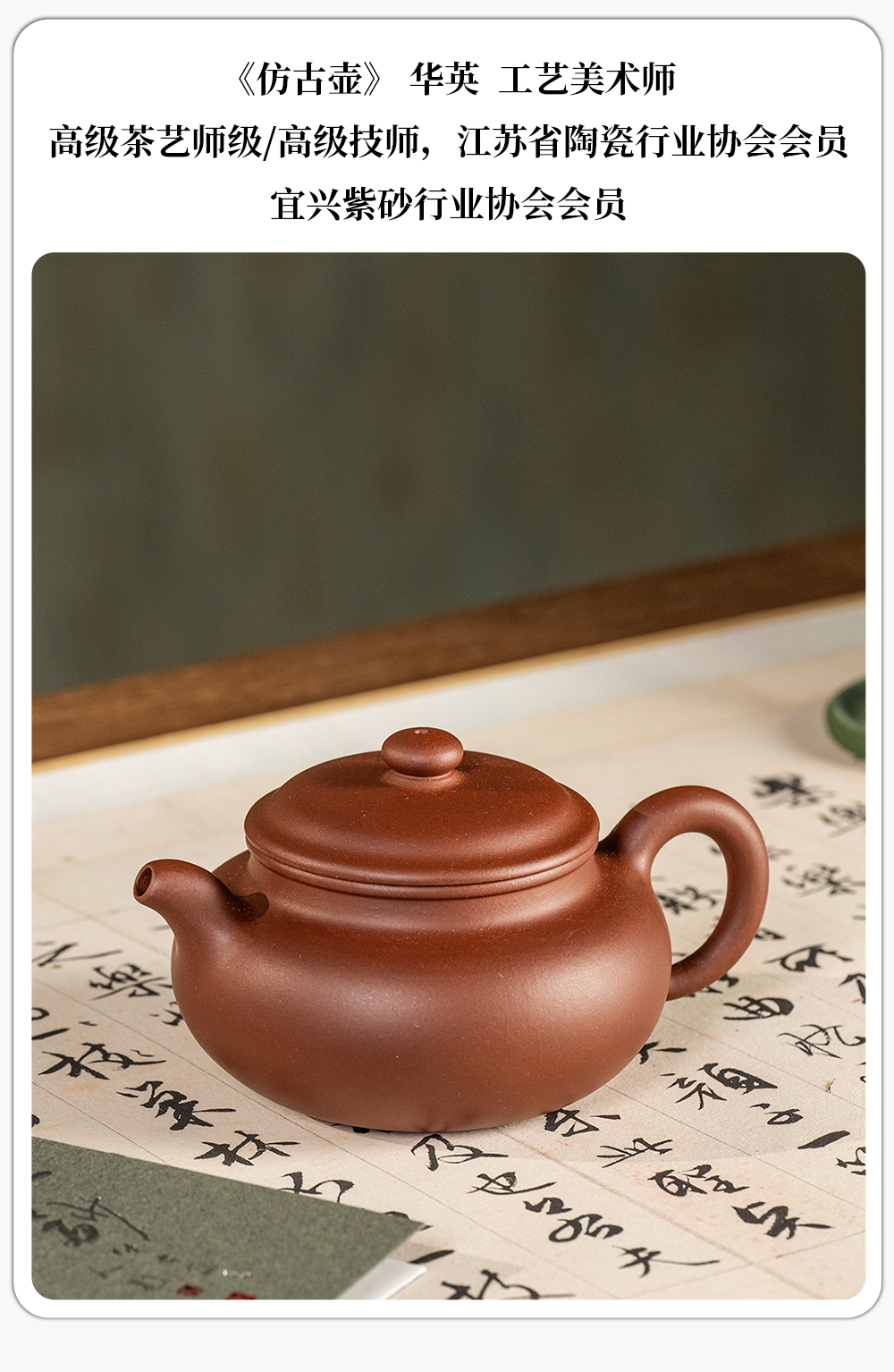 《仿古壶》 华英 工艺美术师,高级茶艺师级/高级技师,江苏省陶瓷行业协会会员,宜兴紫砂行业协会会员