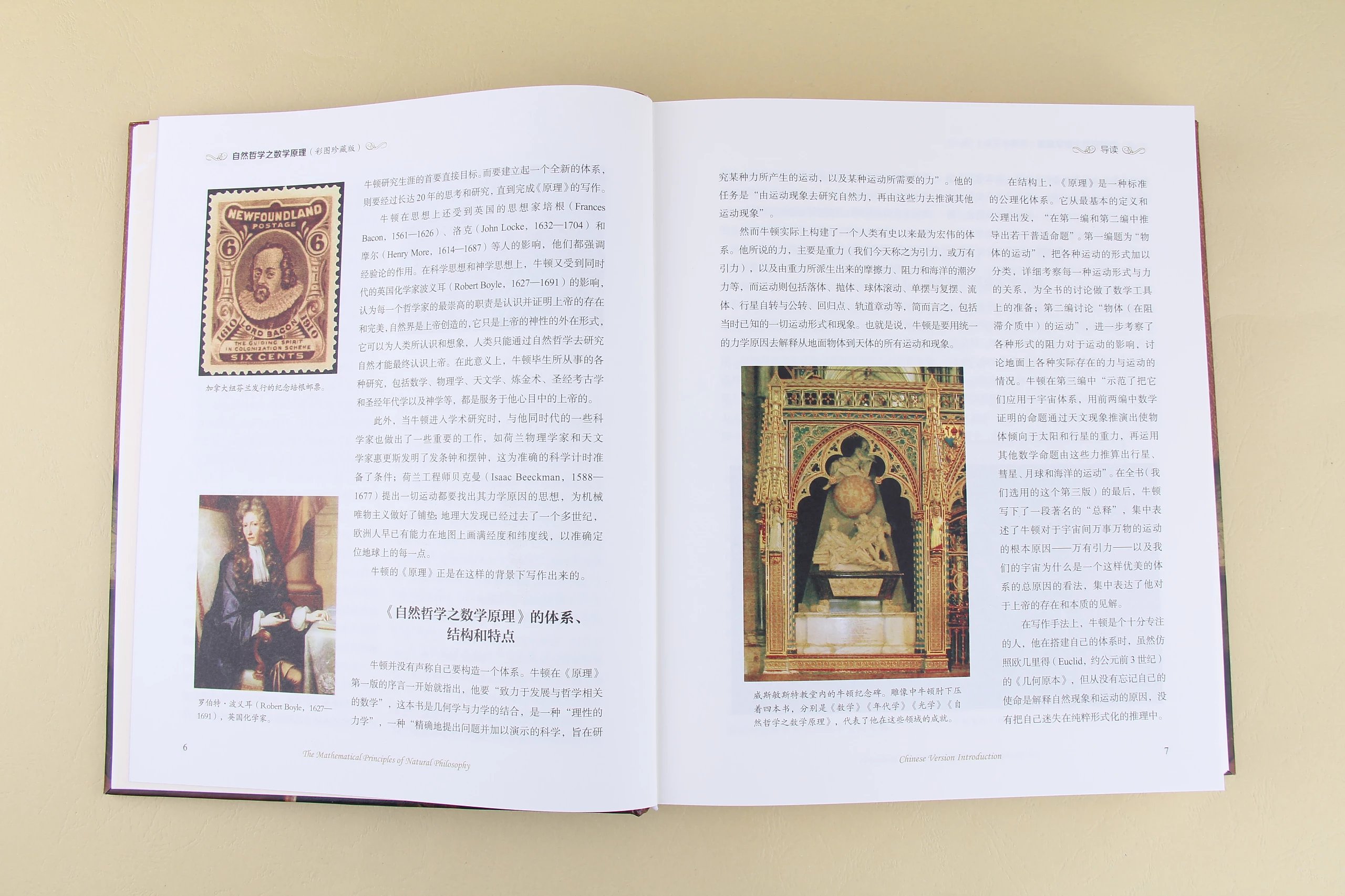 《自然哲学之数学原理》(彩图珍藏版)增加了近300幅插图。这些图片经过了严格的筛选和精心的编配,能够帮助读者更好地理解原著的思想。图片内容包括自然现象、人物、器物等,图片形式既有油画、版画或漫画,也有照片和文献史料。这些配图丰富地再现了牛顿的生平故事、思想发展过程及其学术往来,使得略显高冷的数理知识变得生动有趣 ,也使得科学充满了人情味,大大提高了原著的可读性和收藏价值。