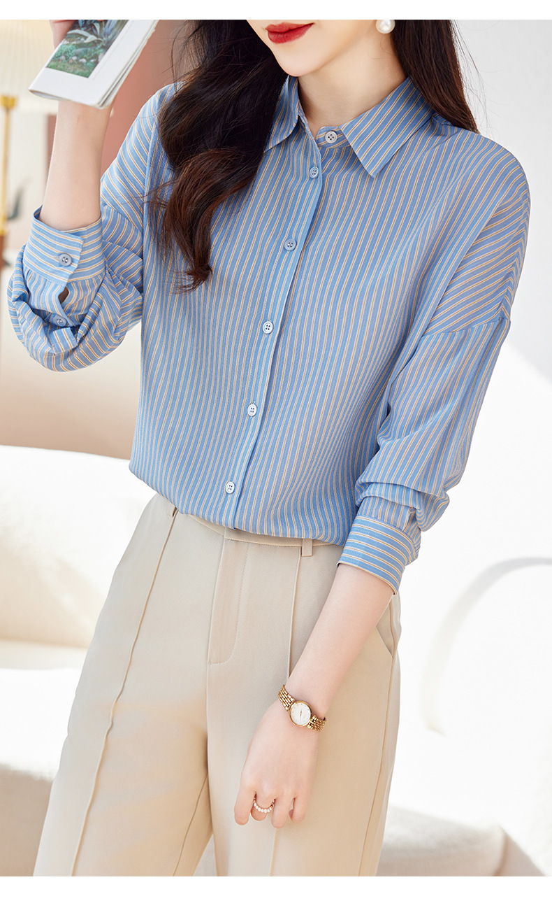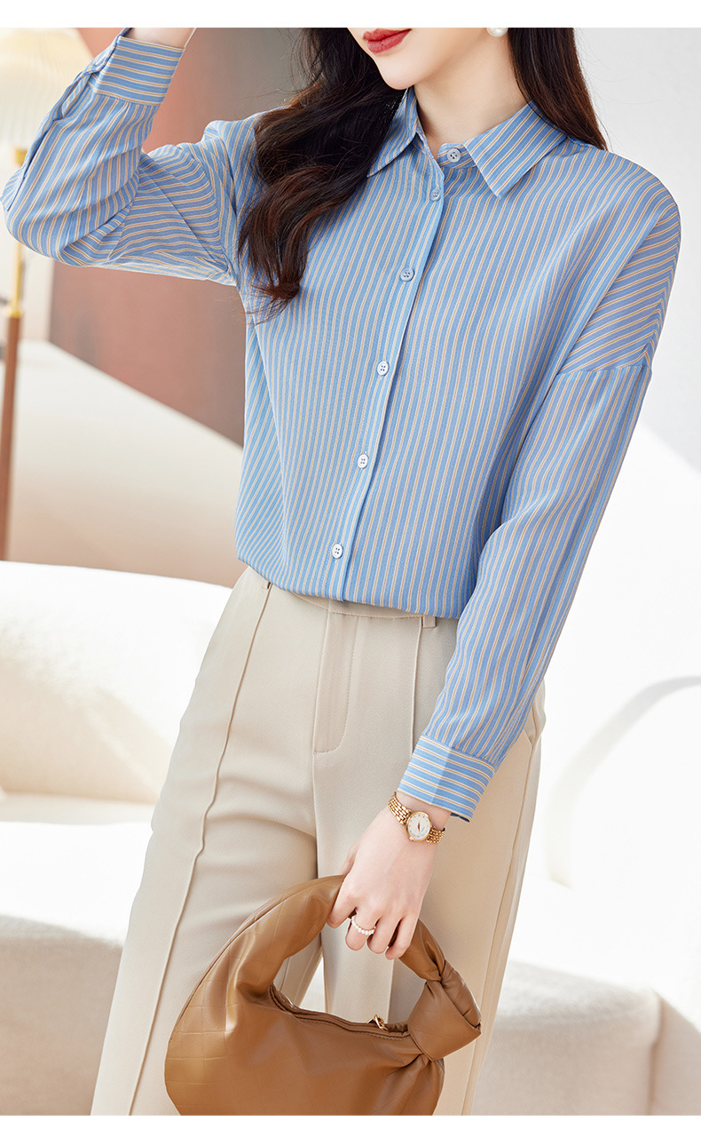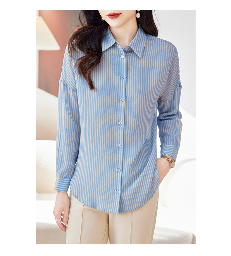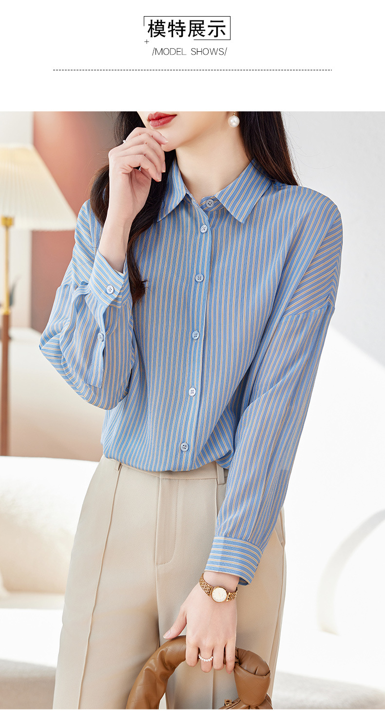 LS897 蓝色真丝衬衫女2024新款春季翻领条纹长袖双绉宽松休闲桑蚕丝衬衣 商品图3