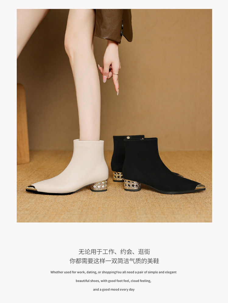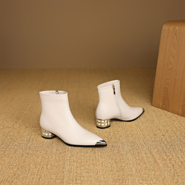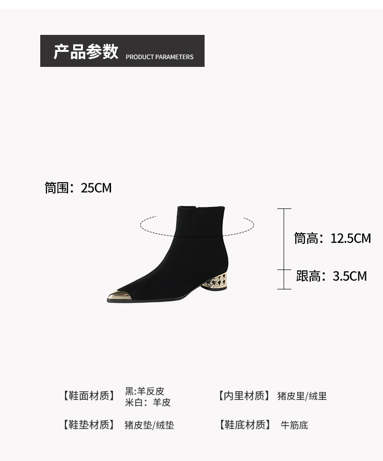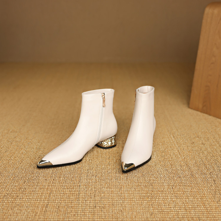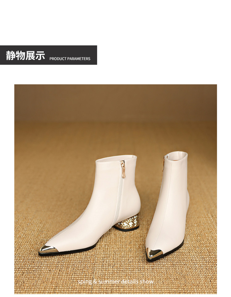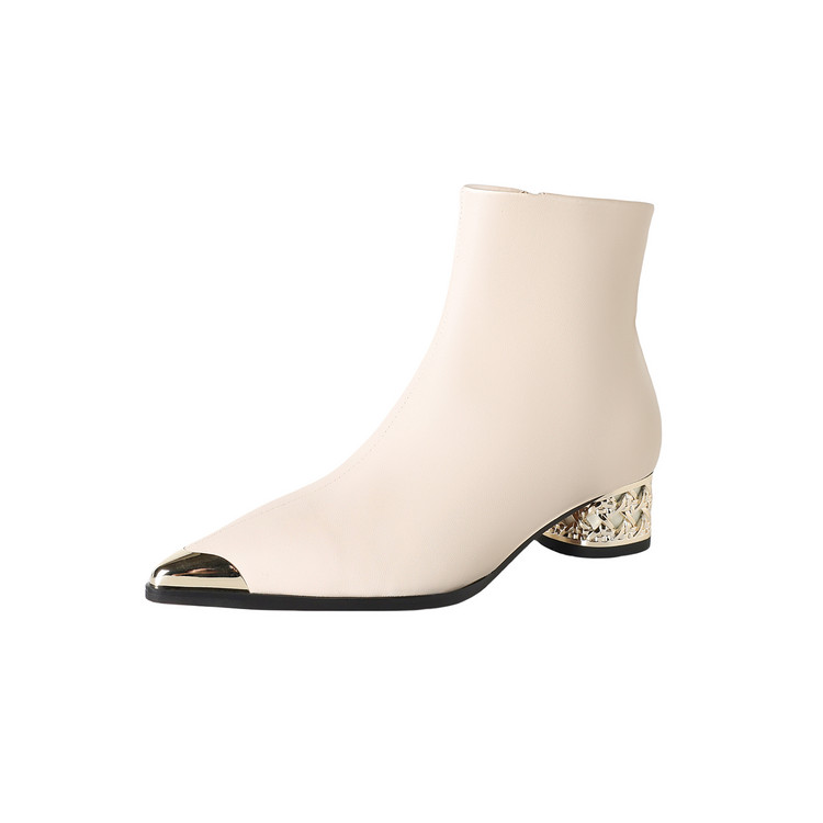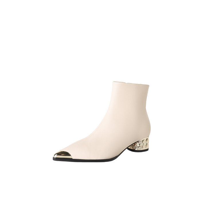 【预售5天】秋冬必备简约风羊皮米白色尖头短靴女英伦风中跟粗跟马丁靴女短筒靴子DB&M6596
