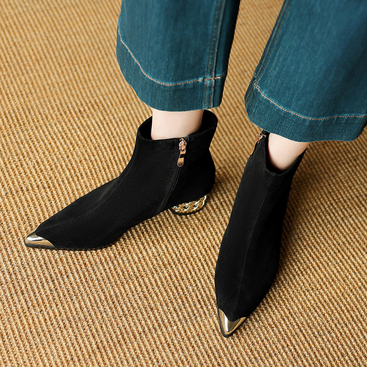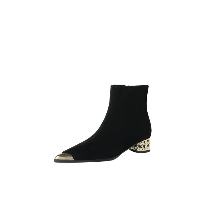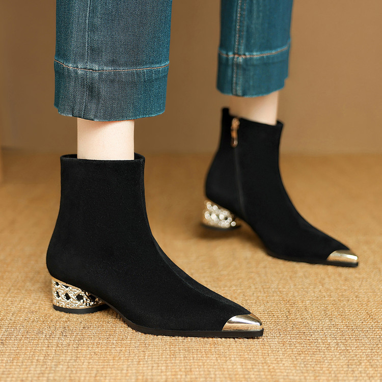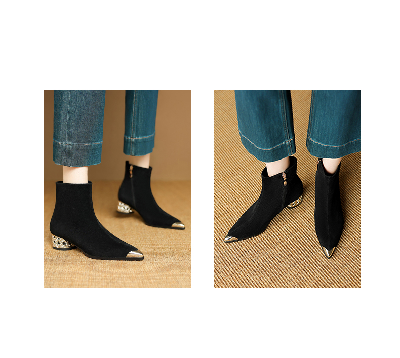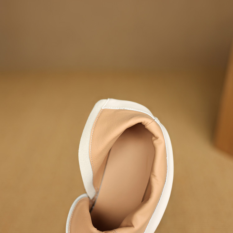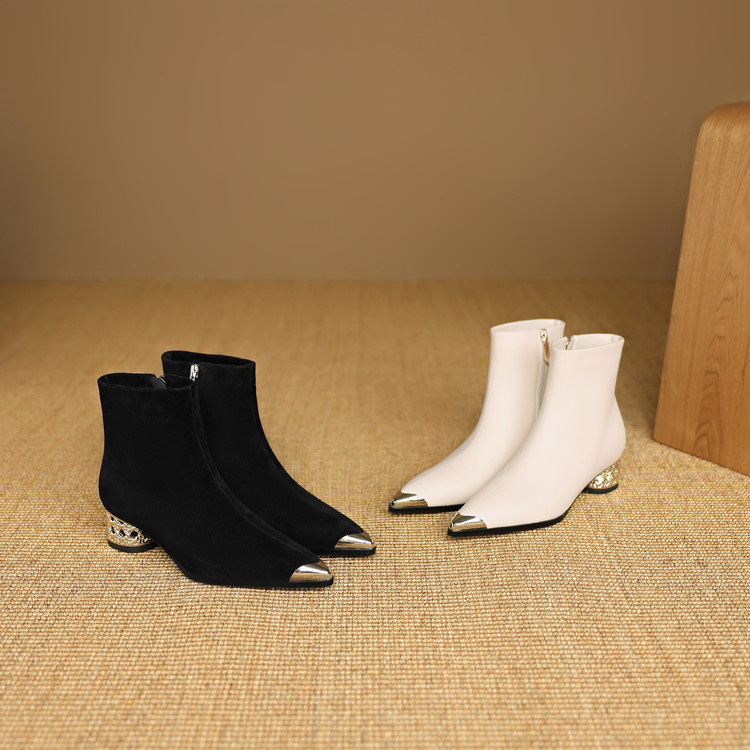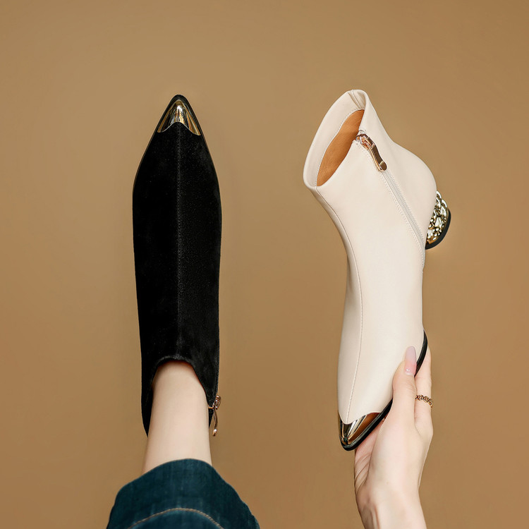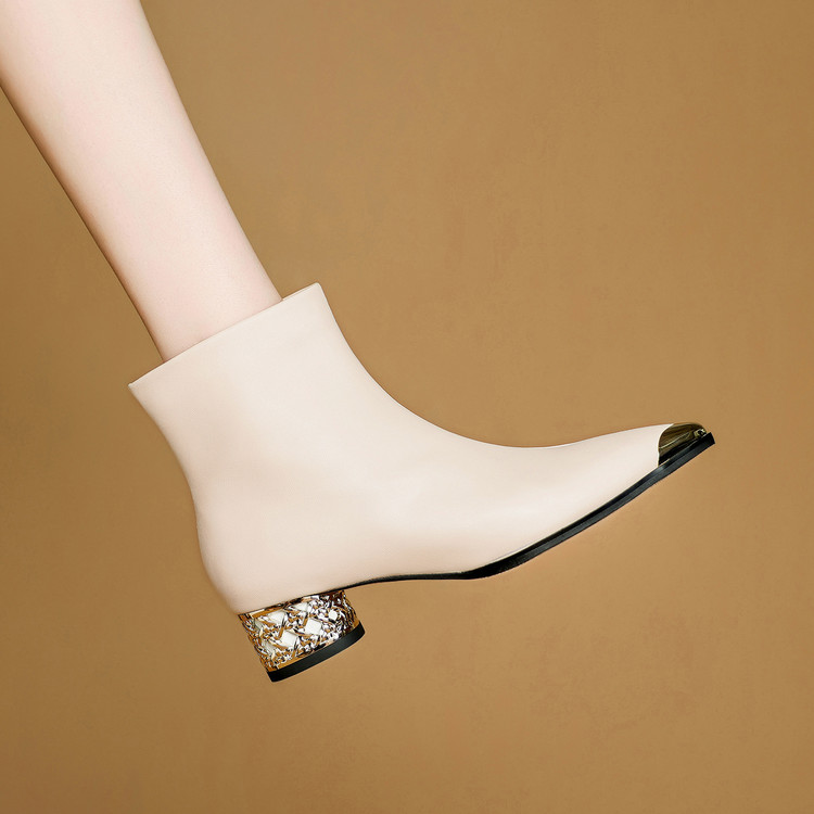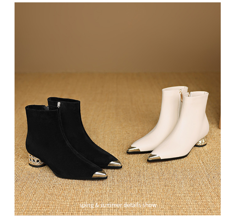 【预售5天】秋冬必备简约风羊皮米白色尖头短靴女英伦风中跟粗跟马丁靴女短筒靴子DB&M6596
