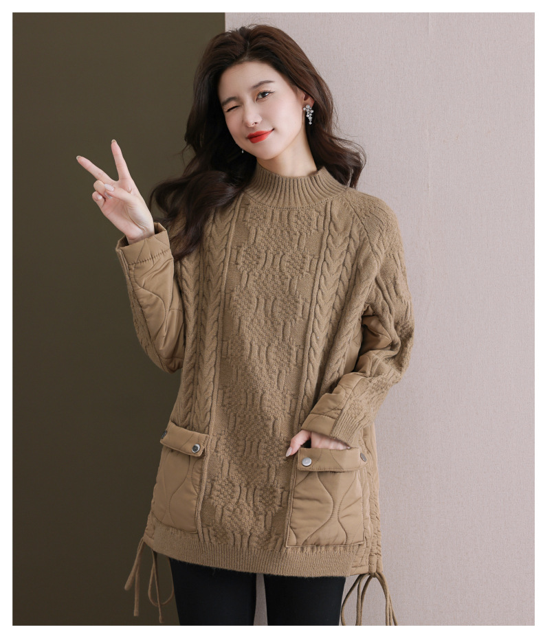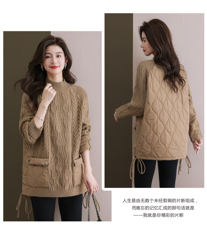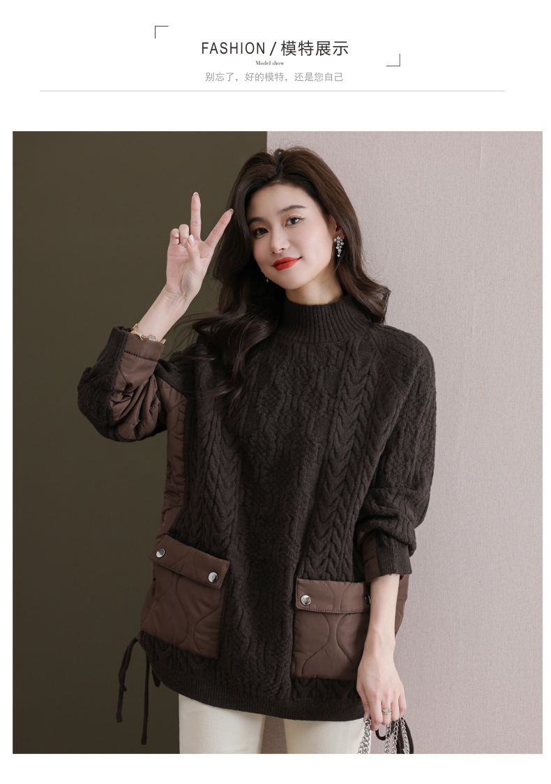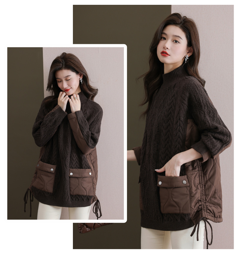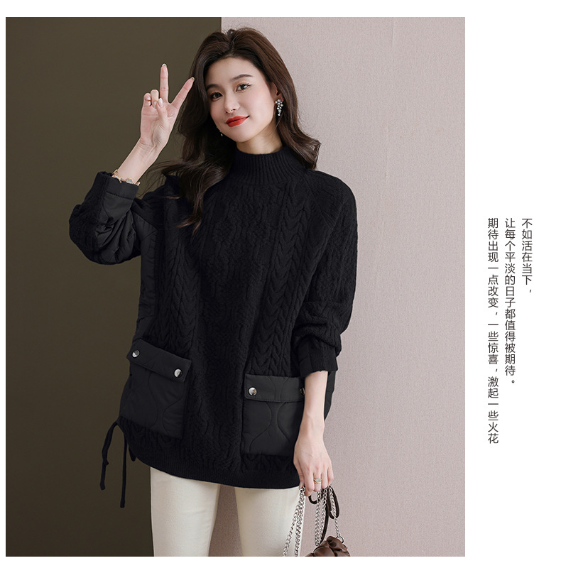 宽松外穿中长款毛衣拼接棉服,女秋冬新款冬季加厚半高领打底衫CC-11-68123