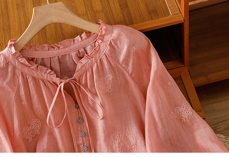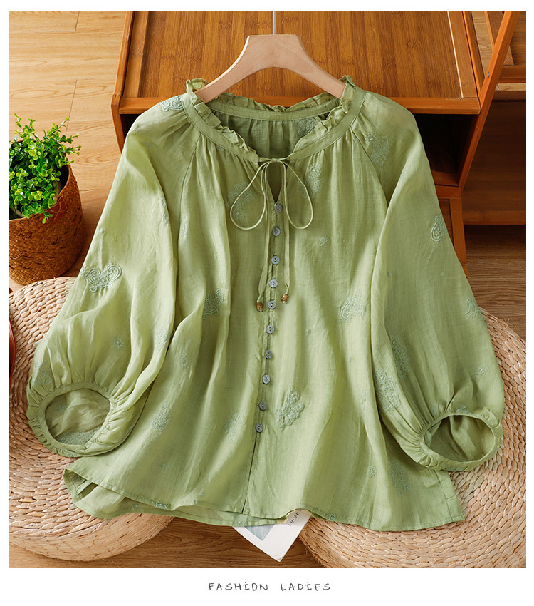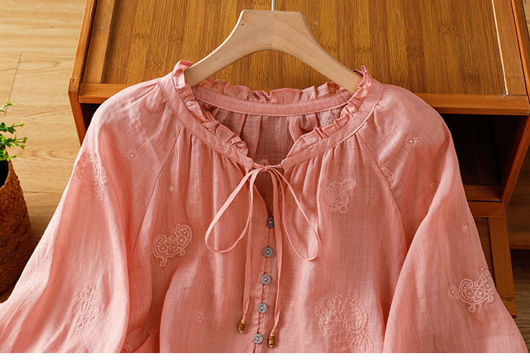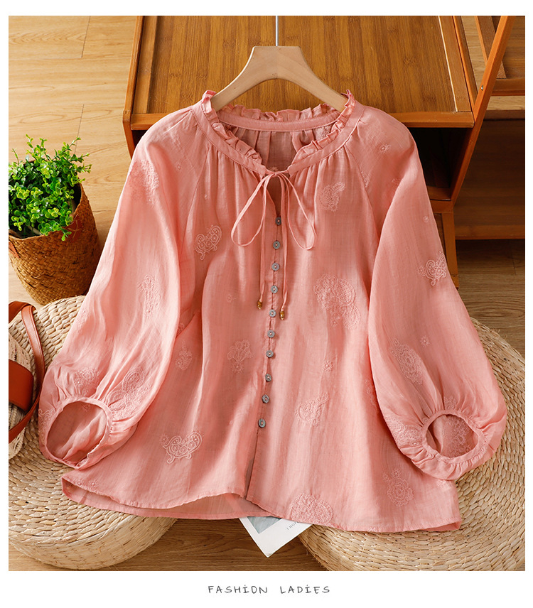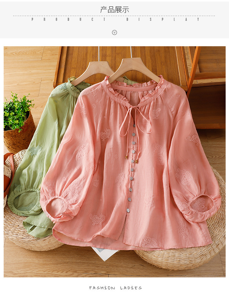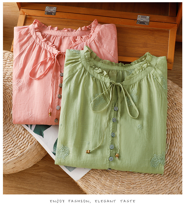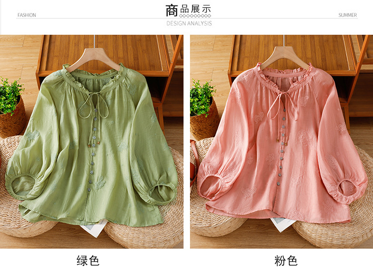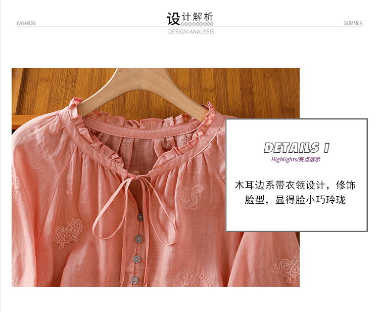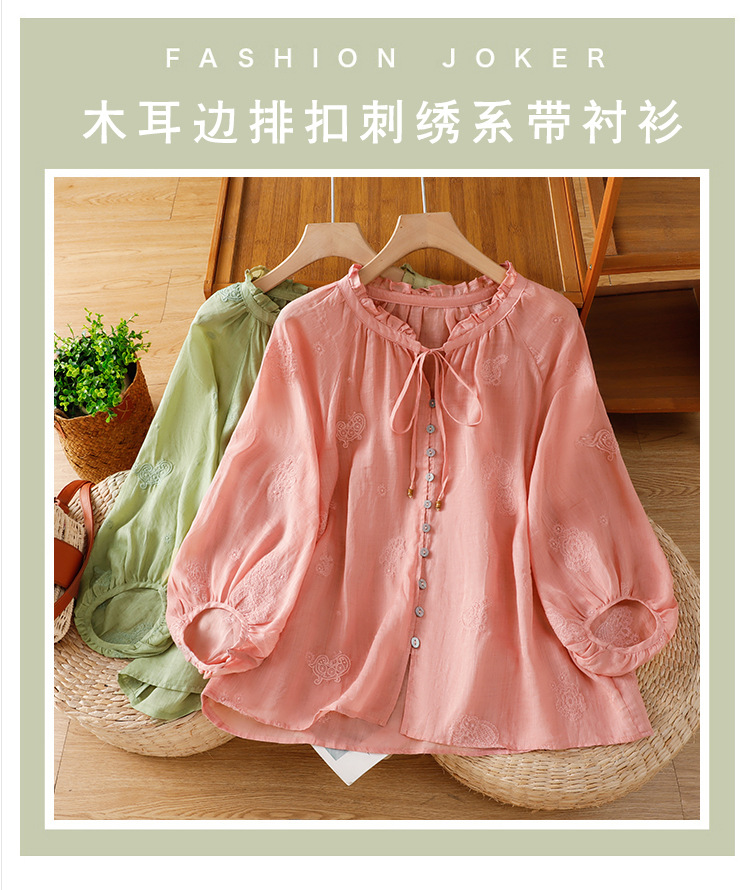 C039-92942025简约休闲复古夏季宽松系带刺绣花衬衫女花边领口文艺上衣女